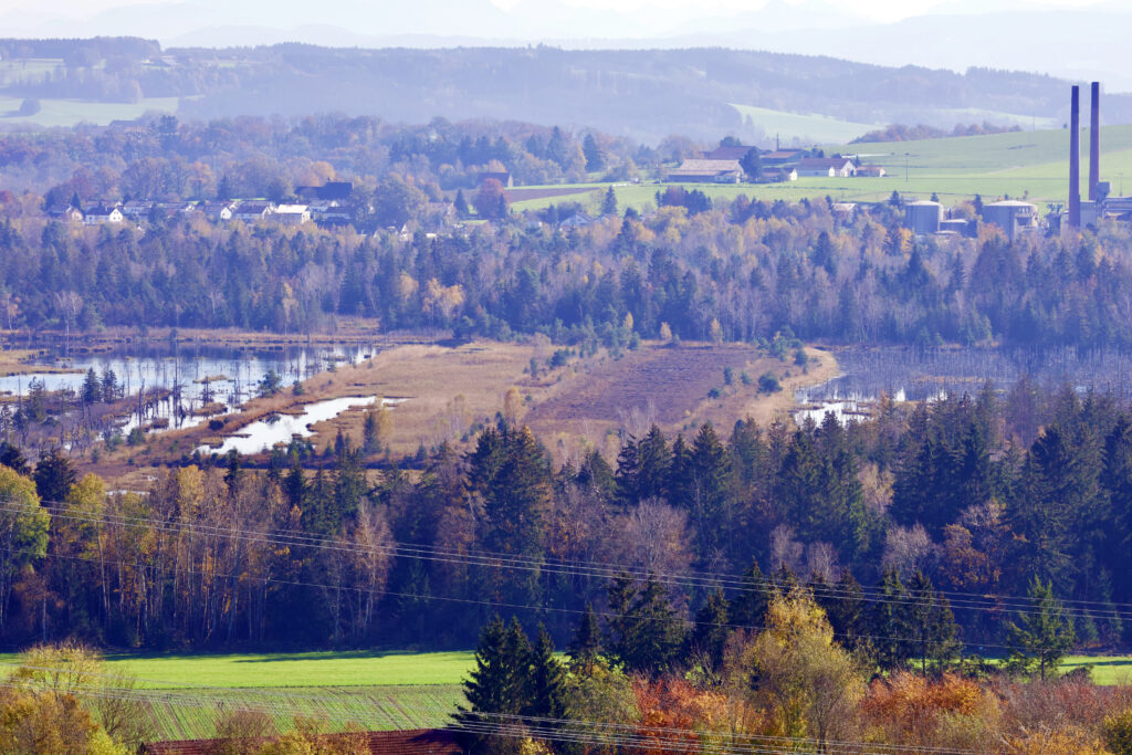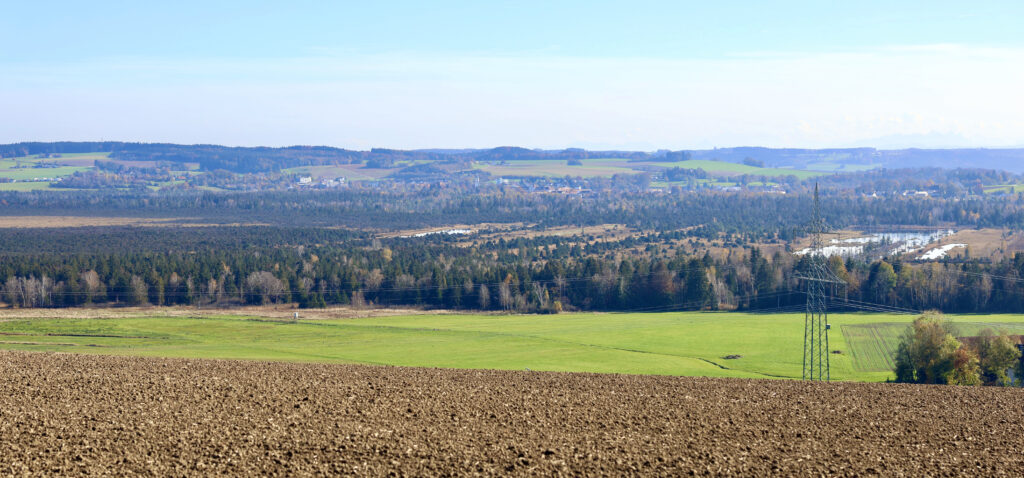 Wer das Ried von dort betrachten will, bleibt, von Wengen kommend, vor der wieder aufgeforsteten Waldfläche stehen und hat einen umfassenden Ausblick auf das Wurzacher Ried. Selbst mit bloßem Auge lassen sich die unterschiedlichen Moorbereiche ohne Probleme unterscheiden. Und das kostenlos. Dies ist im Übrigen auch ein beliebter Standort ortskundiger Ornithologen, die beispielsweise von dort die Brut und Aufzucht der Kraniche beobachten.