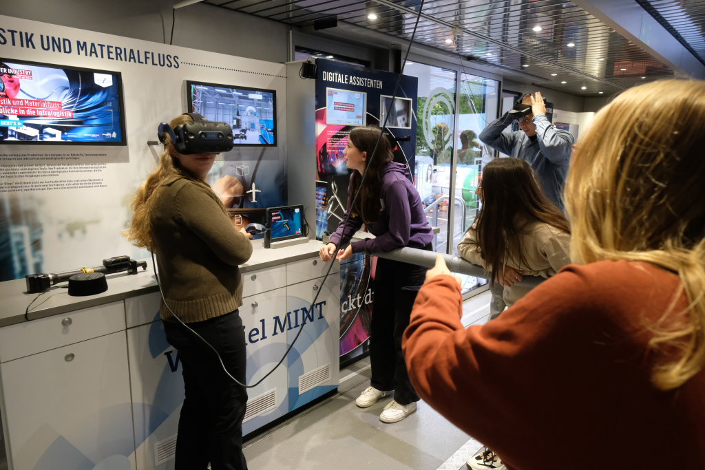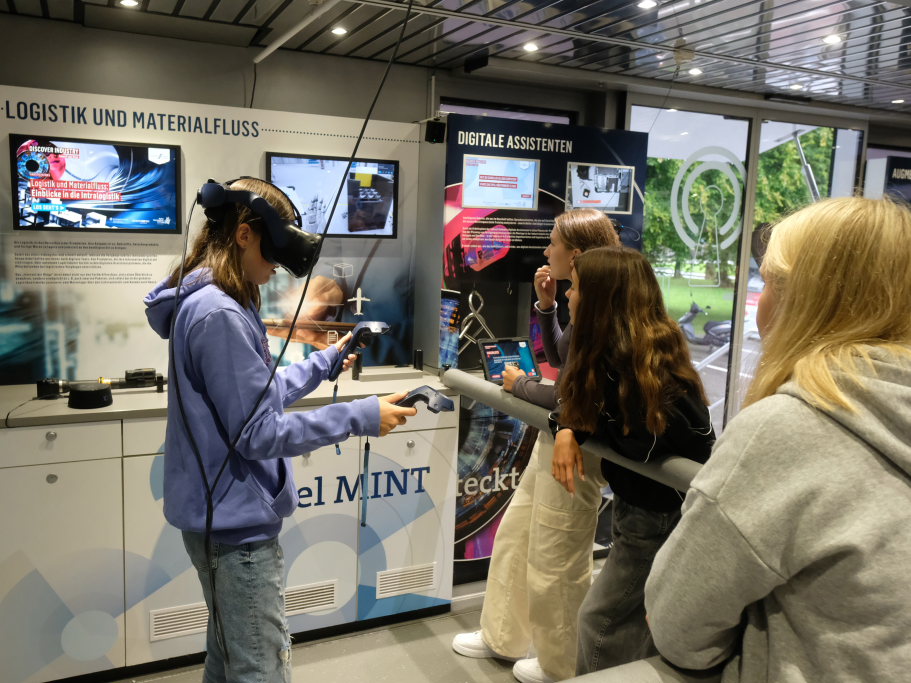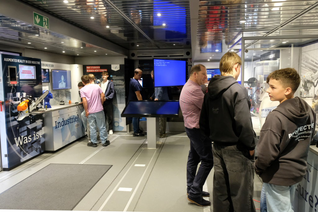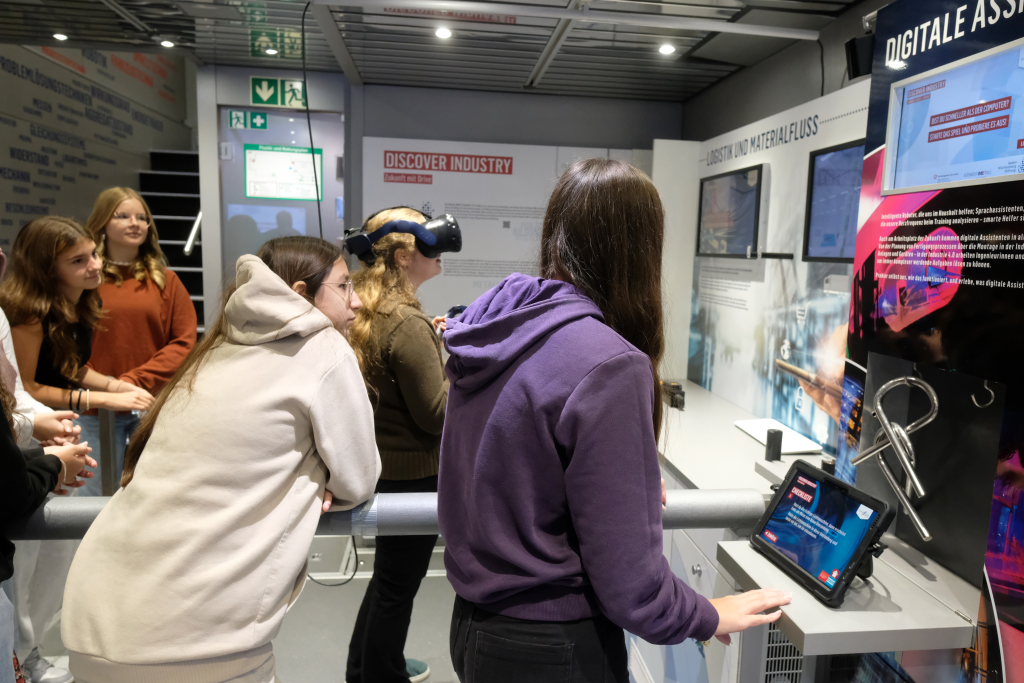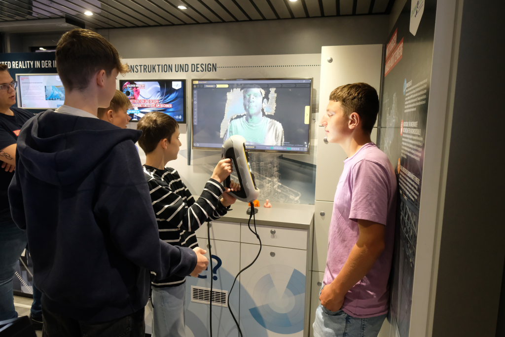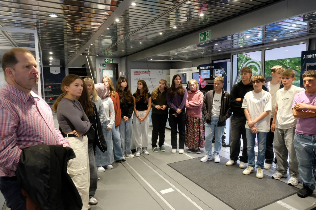 Bei der anschließenden freien Erkundungstour durch die Ausstellung im Truck konnten die Schülerinnen und Schüler weitere Hightech-Anwendungen selbst ausprobieren und dabei etwa mithilfe einer interaktiven, KI-gestützten Anleitung und einer Augmented Reality-Brille einen Computer zusammenbauen. Ein kurzer Vortrag zur Entwicklungsgeschichte der industriellen Fertigung, Informationen zu Karrierechancen und Wegen in einen technischen Beruf ergänzten das Programm dieser interessanten und höchst abwechslungsreichen Schulstunden.