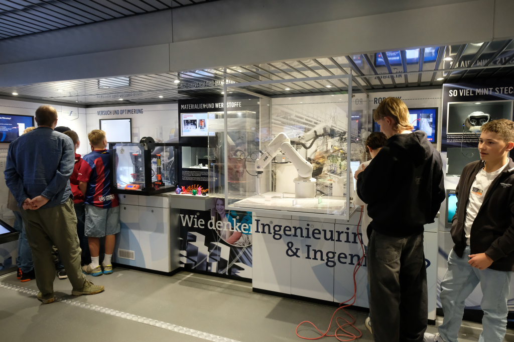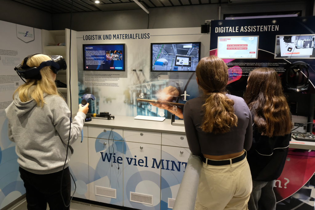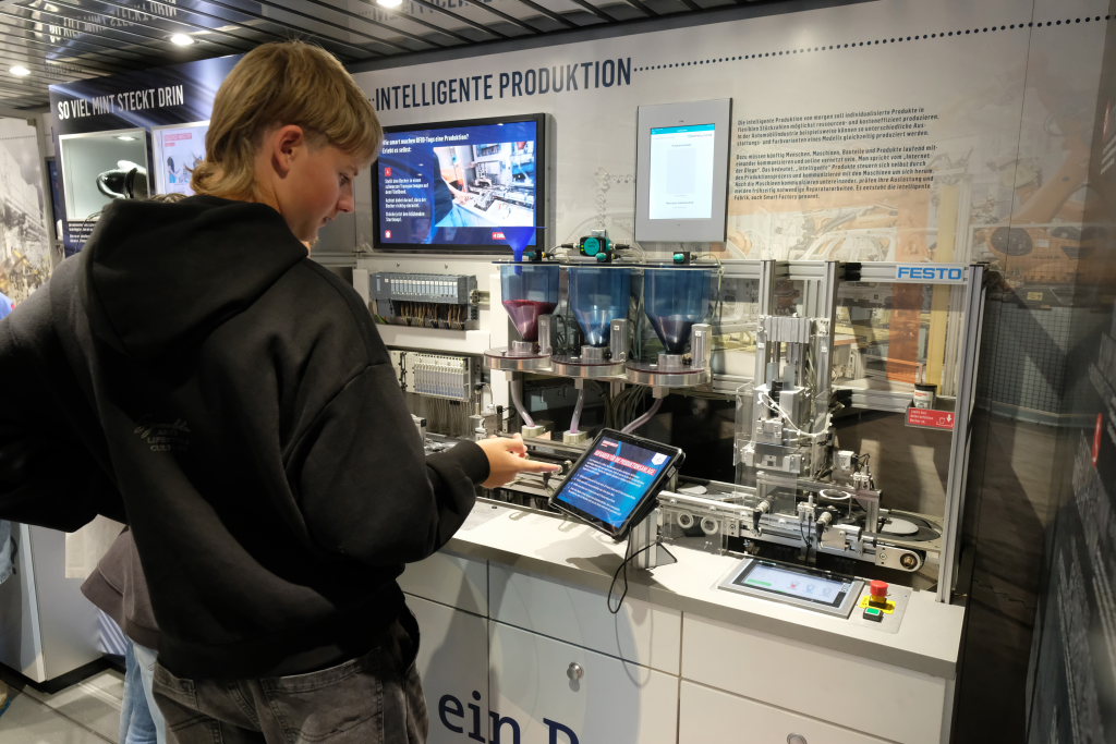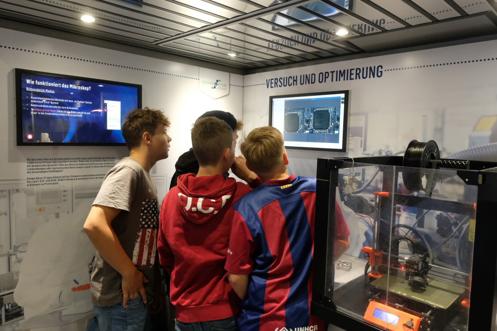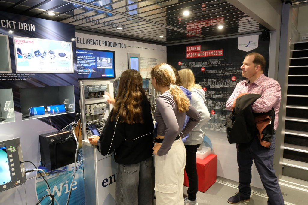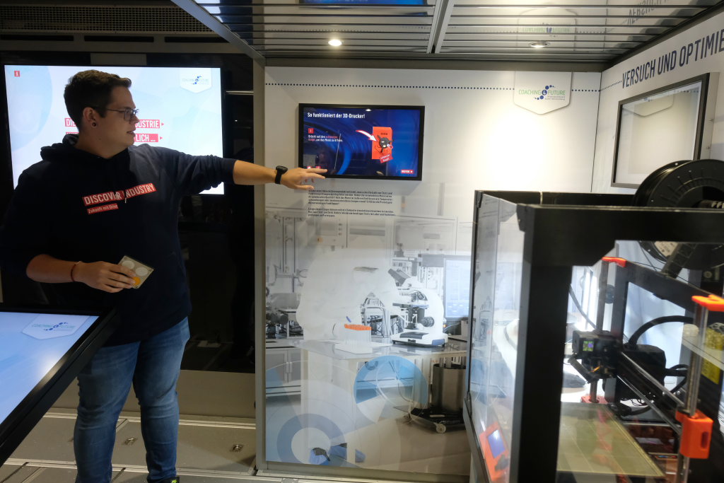 Bei der anschließenden freien Erkundungstour durch die Ausstellung im Truck konnten die Schülerinnen und Schüler weitere Hightech-Anwendungen selbst ausprobieren und dabei etwa mithilfe einer interaktiven, KI-gestützten Anleitung und einer Augmented Reality-Brille einen Computer zusammenbauen. Ein kurzer Vortrag zur Entwicklungsgeschichte der industriellen Fertigung, Informationen zu Karrierechancen und Wegen in einen technischen Beruf ergänzten das Programm dieser interessanten und höchst abwechslungsreichen Schulstunden.