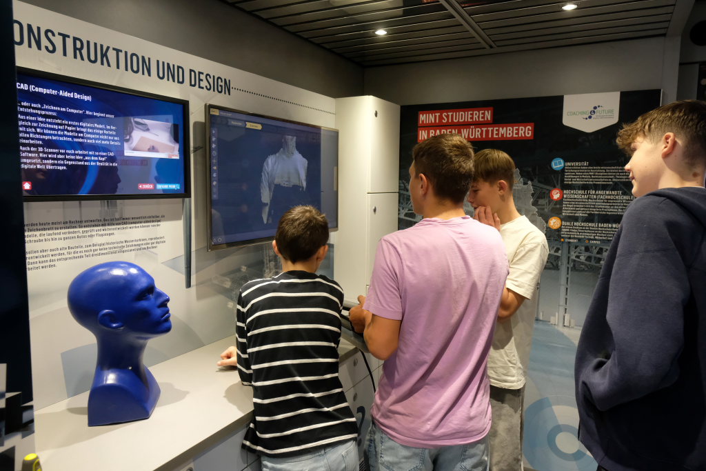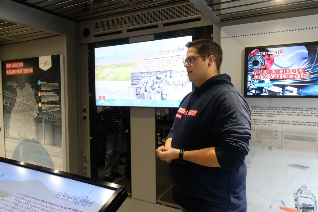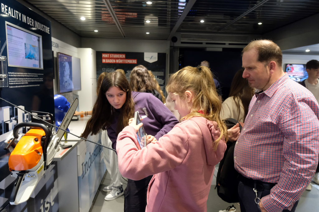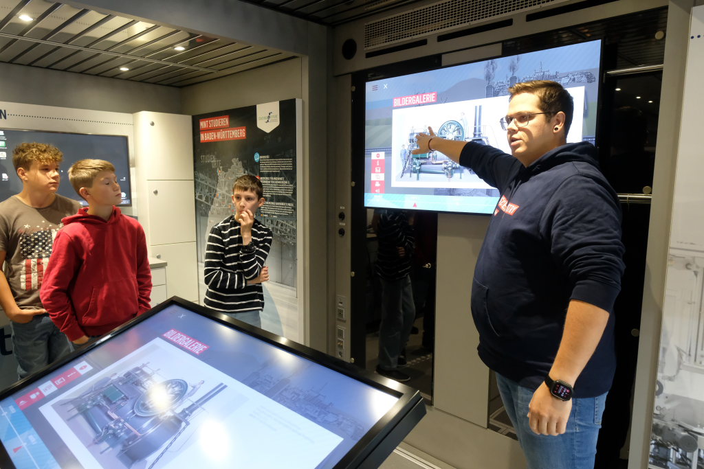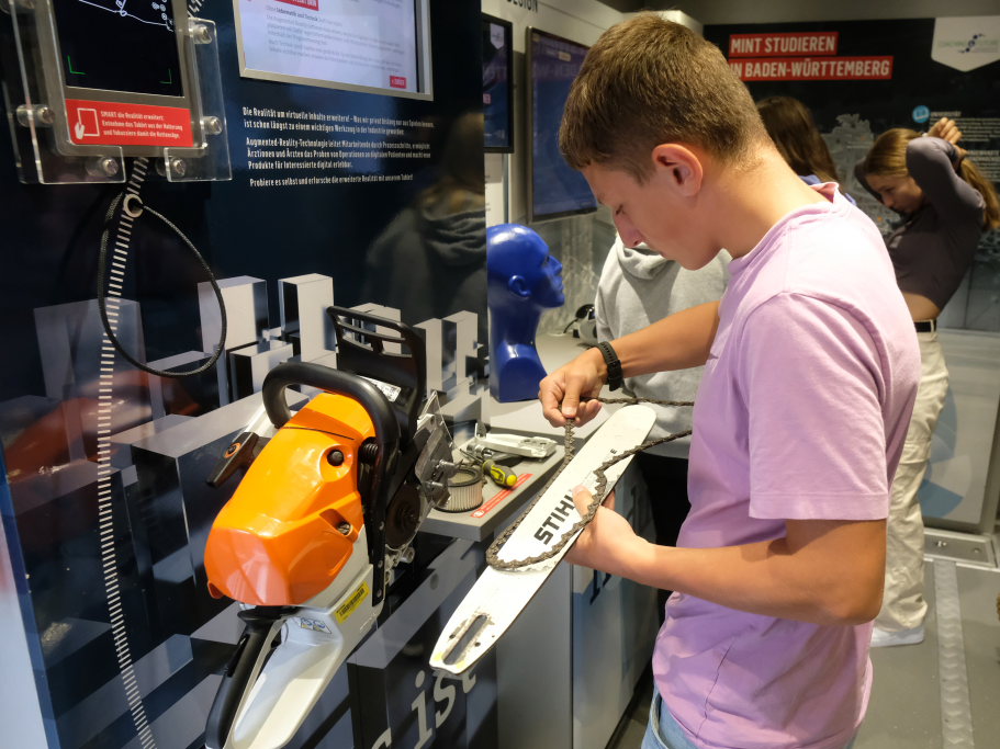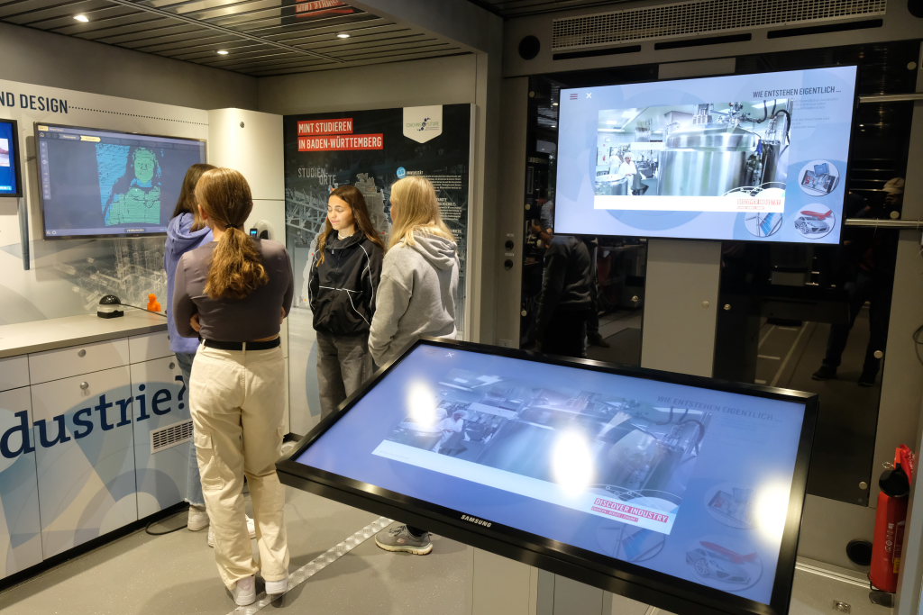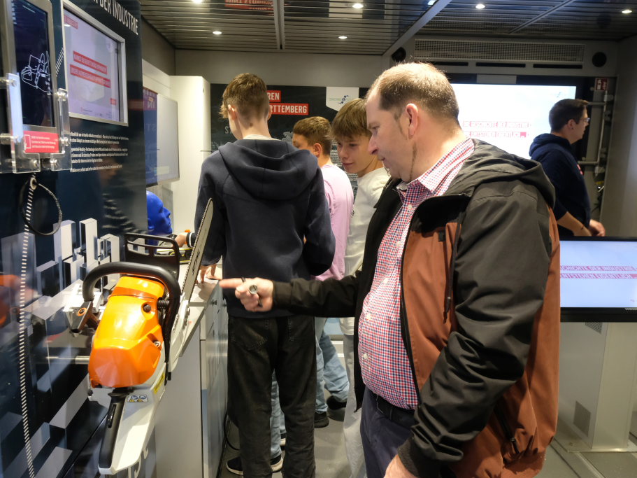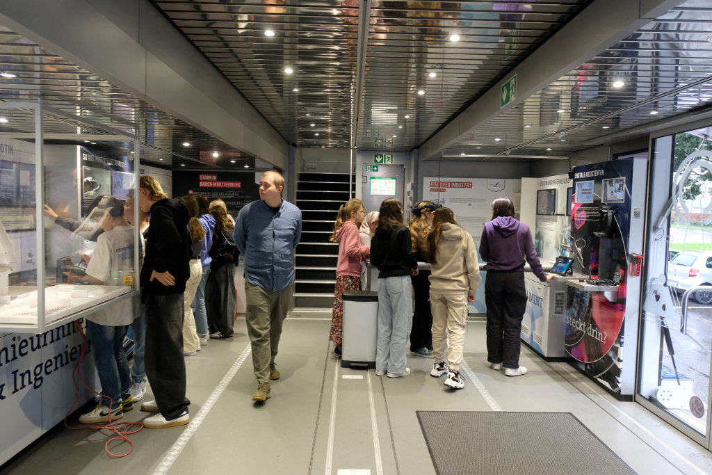 Im Inneren der mobilen Mitmachausstellung konnten die Schülerinnen und Schüler der Realschule Bad Wurzach mit den Coaches Marco Umstätter und Marcel Michel auf Entdeckertour gehen. Sie lernten dabei an fünf Stationen, wie sie mit einer technischen Ausbildung oder einem ingenieurswissenschaftlichen Studium später einmal an wichtigen Zukunftsaufgaben wie Erneuerbaren Energien, Medizintechnik oder der Mobilität von morgen mitarbeiten können.
