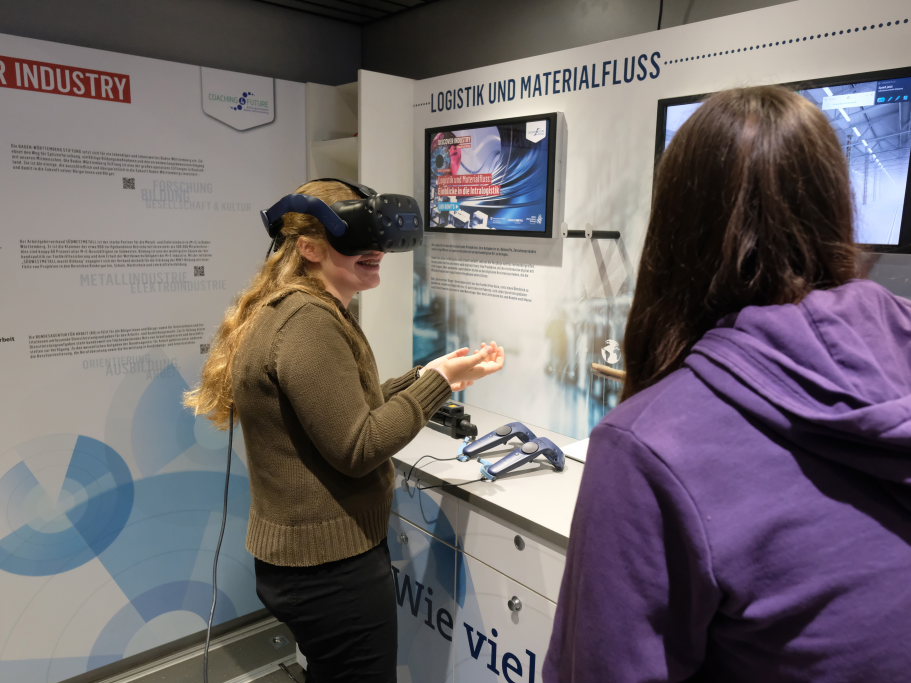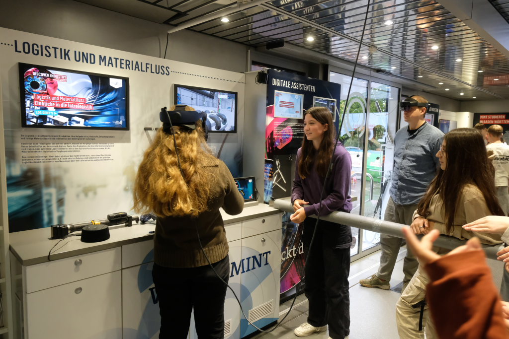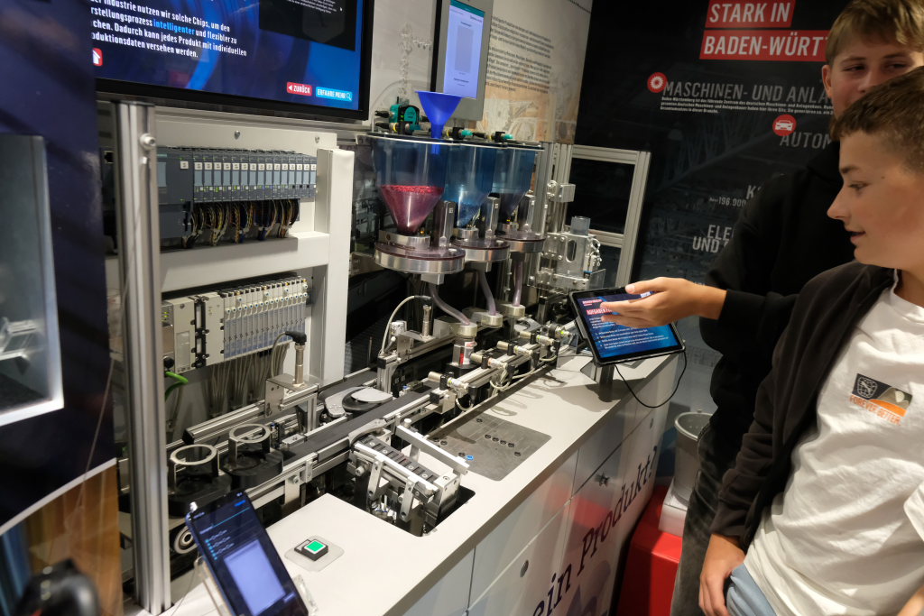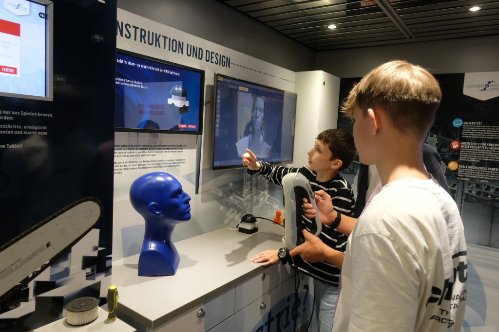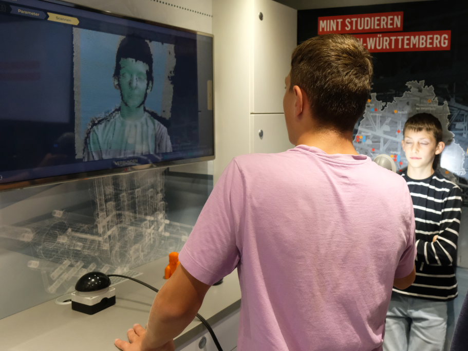 Dazu schlüpften die Jugendlichen z.B. der Klasse 8b mit ihrem Lehrer Tobias Ernst bei ihrem Rundgang durch die fünf Stationen der Erlebnisausstellung ein wenig in die Rolle von Gründerinnen und Gründern, die ein selbst erdachtes Produkt auf den Markt bringen wollen. Welche Schritte dazu nötig sind, erfuhren sie ausgerüstet mit Tablets an den fünf Arbeitsstationen. Als erstes erstellten sie mithilfe eines 3D-Scanners einen digitalen Prototyp, indem sie Objekte, in diesem Fall ihre eigenen Köpfe, einscannten und auf diese Weise CAD-Daten erhielten, die am Computer weiterbearbeitet werden konnten. Anschließend durften sie mit einem Digitalmikroskop einen genauen Blick auf Werkstücke und Materialien werfen oder druckten mit dem 3D-Drucker Testobjekte aus. Bei der nächsten Station konnten die Jugendlichen ausprobieren, wie man einen Industrieroboter durch ein Koordinatensystem lotst. Dass der Roboter bei Fehleingaben energisch mit seinem stählernen Haupt wackelte, war einer der programmierten Gimmicks, der dem Spaß am Mitmachen keinen Abbruch tat. Bei der vierten Station zeigte eine smarte Abfüllanlage, wie Maschine und Produkt über RFID-Chips miteinander „sprechen“. Zum Schluss ging es um die Intralogistik: In einem virtuellen Lager wartete ein Motorblock auf die letzten Teile – etwa auf die Lichtmaschine. Mithilfe einer VR-Brille machte sich ein Schüler daran, mittels eines Scanners das passende Teil im virtuellen Lager zu finden und mittels digitaler Greifarme einzubauen.