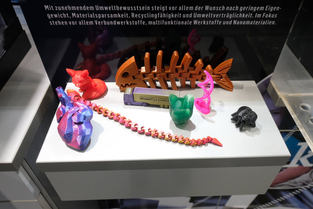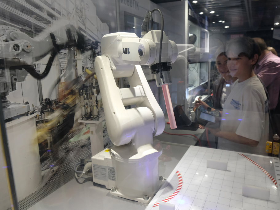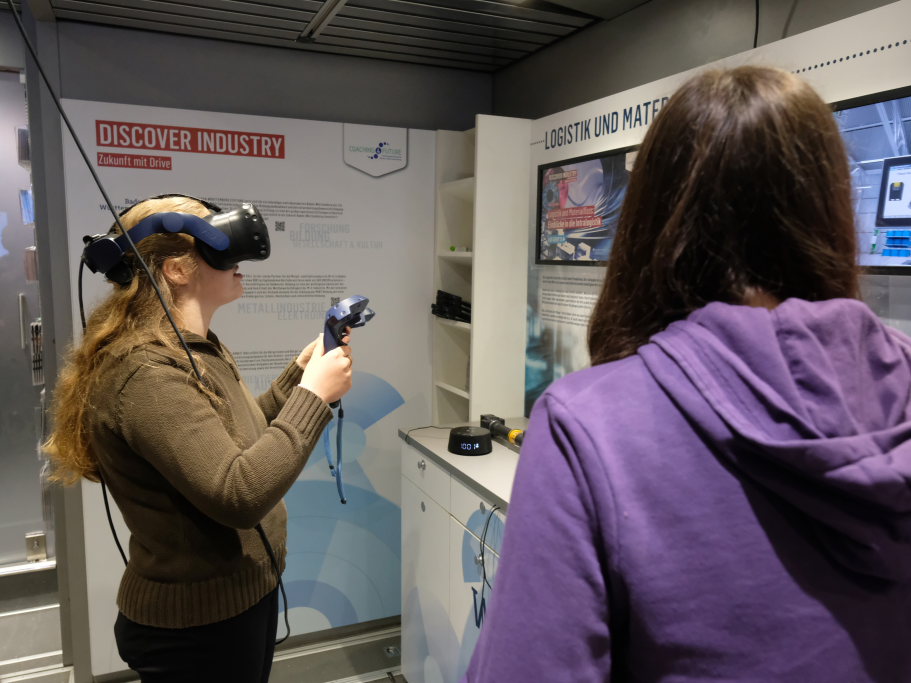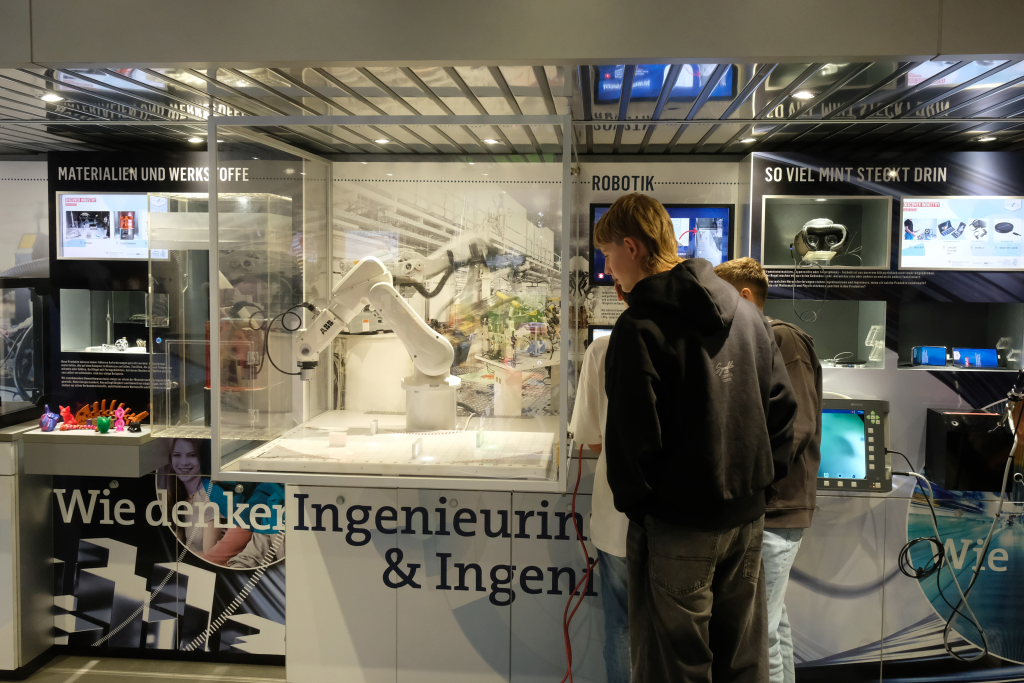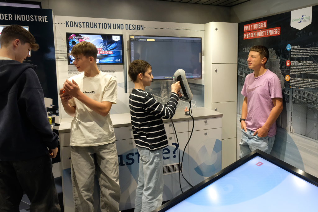 Dazu schlüpften die Jugendlichen z.B. der Klasse 8b mit ihrem Lehrer Tobias Ernst bei ihrem Rundgang durch die fünf Stationen der Erlebnisausstellung ein wenig in die Rolle von Gründerinnen und Gründern, die ein selbst erdachtes Produkt auf den Markt bringen wollen. Welche Schritte dazu nötig sind, erfuhren sie ausgerüstet mit Tablets an den fünf Arbeitsstationen. Als erstes erstellten sie mithilfe eines 3D-Scanners einen digitalen Prototyp, indem sie Objekte, in diesem Fall ihre eigenen Köpfe, einscannten und auf diese Weise CAD-Daten erhielten, die am Computer weiterbearbeitet werden konnten. Anschließend durften sie mit einem Digitalmikroskop einen genauen Blick auf Werkstücke und Materialien werfen oder druckten mit dem 3D-Drucker Testobjekte aus. Bei der nächsten Station konnten die Jugendlichen ausprobieren, wie man einen Industrieroboter durch ein Koordinatensystem lotst. Dass der Roboter bei Fehleingaben energisch mit seinem stählernen Haupt wackelte, war einer der programmierten Gimmicks, der dem Spaß am Mitmachen keinen Abbruch tat. Bei der vierten Station zeigte eine smarte Abfüllanlage, wie Maschine und Produkt über RFID-Chips miteinander „sprechen“. Zum Schluss ging es um die Intralogistik: In einem virtuellen Lager wartete ein Motorblock auf die letzten Teile – etwa auf die Lichtmaschine. Mithilfe einer VR-Brille machte sich ein Schüler daran, mittels eines Scanners das passende Teil im virtuellen Lager zu finden und mittels digitaler Greifarme einzubauen.