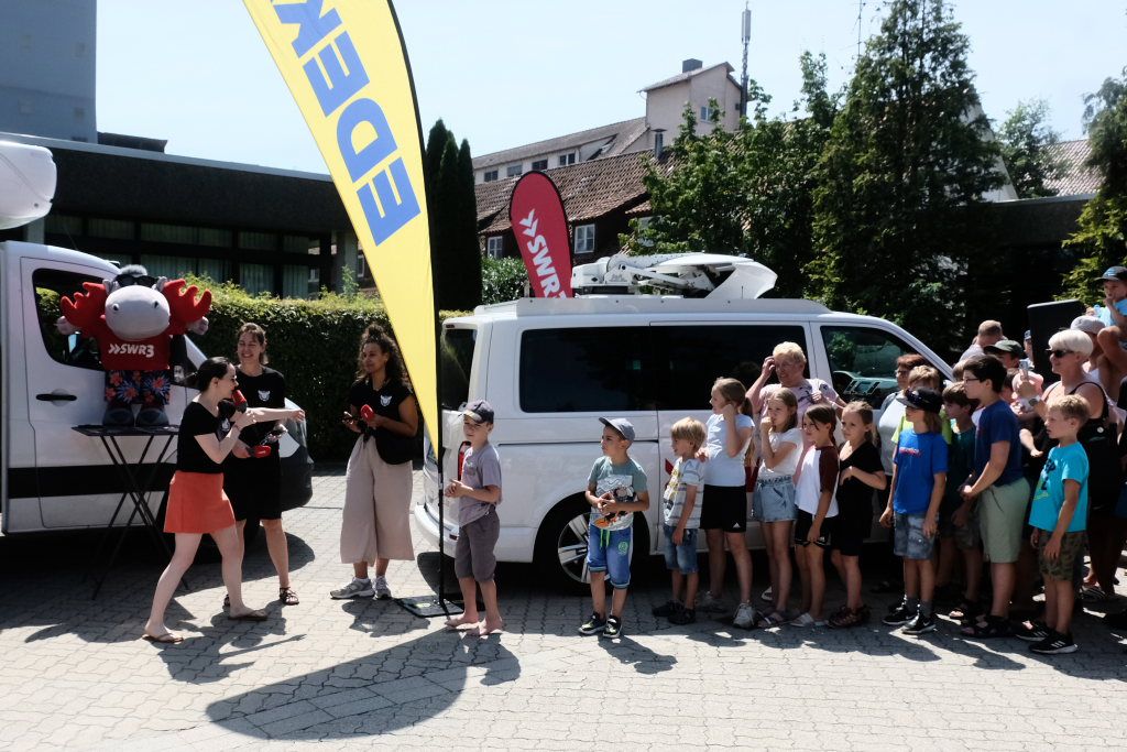 Bad Wurzach – Die Chance auf Gratis-Eis und Partystimmung zusammen mit SWR3-Moderatoren ließen sich in der Mittagspause am Dienstag, 30. Juli, zahlreiche Bad Wurzacher nicht entgehen. Dass der SWR3-Eistruck nach Bad Wurzach gekommen war, war möglicherweise auch der Bildschirmzeitung „Der Wurzacher“ zu verdanken. Denn wir vom „Wurzacher“ haben kräftig fürs Mitmachen bei der Online-Abstimmung getrommelt – nicht nur in Bad Wurzach, sondern in allen unseren Erscheinungsorten – also auch in unseren Ausgaben für Bad Waldsee, Leutkirch, Kißlegg und Aulendorf.