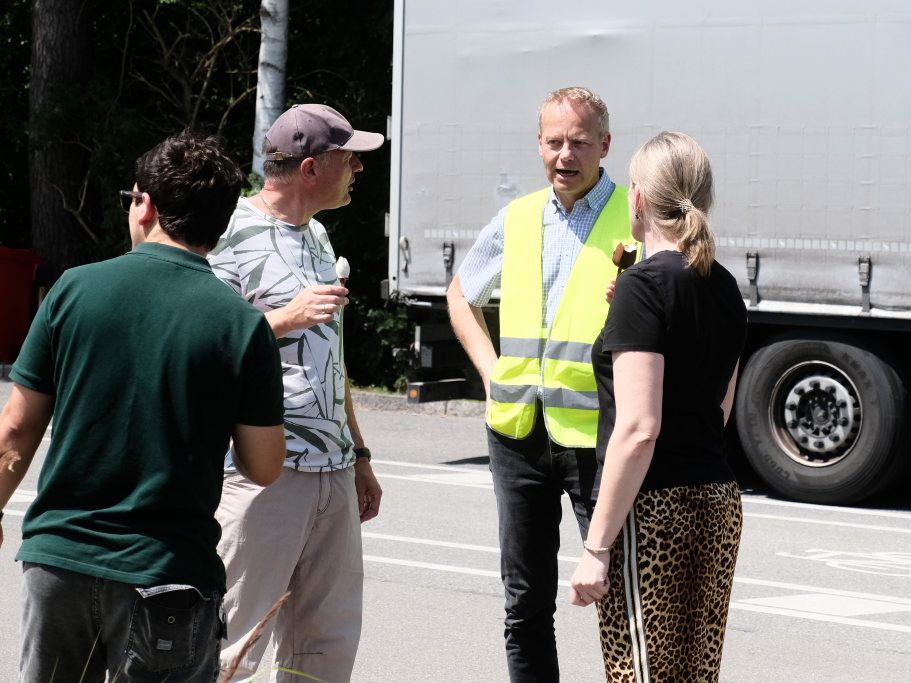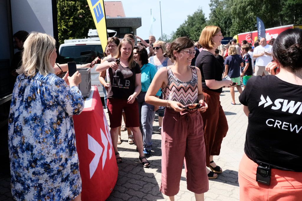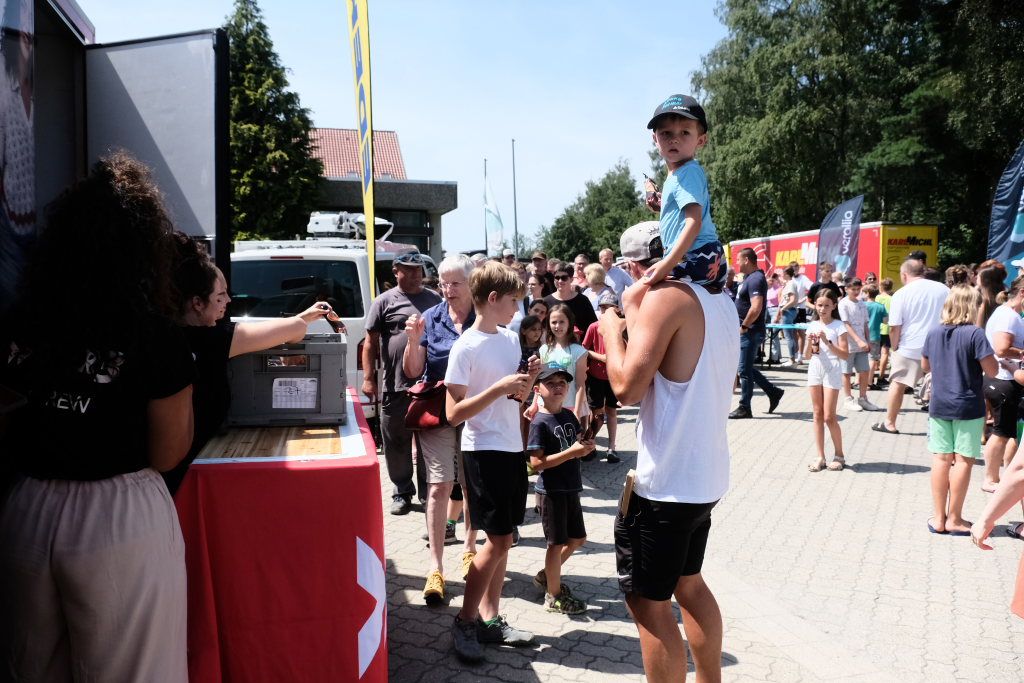 Aber als dann der Countdown von Rebekka de Buhr heruntergezählt wurde, nachdem sie von der Herfahrt berichtet hatte und voll des Lobes über unsere oberschwäbische Landschaft war, da waren plötzlich mehrere hundert Leute und natürlich auch viele Kinder da. Da reihte sich ein Vorstand neben dem Maschinenführer von Verallia in die Schlange ein. Unübersehbar waren auch die in Warnwesten-Orange gekleideten Mitarbeiter des städtischen Bauhofes, die sich ein bisschen Abkühlung ja mehr als verdient haben. Und auch von anderen Betrieben aus dem Gewerbegebiet West nutzten die Mitarbeiter die Gelegenheit, sich an dem vom Wetterbericht prognostizierten heißesten Tag des Jahres sich noch eine süße Verführung zu gönnen.