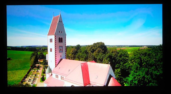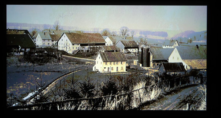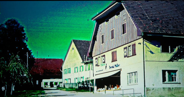 Alte Ansicht von Arnach, entnommen dem Film: Im Vordergrund ist der heutige Dorfmarkt zu sehen, der in den 1950ern von Günther Müller („Adler”) gegründet wurde (der Schriftzug Bernh. Müller bezieht sich auf Günther Müllers Großhändler aus Augsburg). Links neben dem Lebensmittel- und Gemischtwarengeschäft sieht man den „Löwen” (nicht mehr vorhanden) und dahinter den Hof Hege, zuletzt betrieben von der Familie Diethelm. Dieses Anwesen wurde Ende der 1970er-Jahre abgebrochen; an seiner Stelle steht nun die Leichenhalle. (rei)