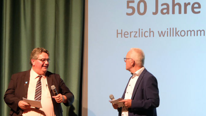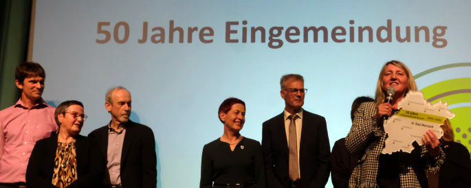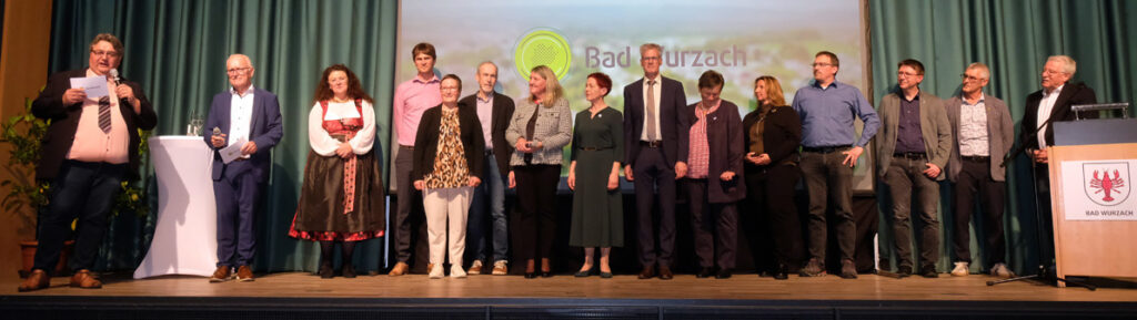 Bad Wurzach – Bad Wurzach hat „50 Jahre Eingemeindung“ gefeiert. Auftakt am Freitag war ein Festabend für geladene Gäste, bei dem Bürgermeisterin Alexandra Scherer qua Amtes als Einzige eine Rede zu den Eingemeindungen vor einem halben Jahrhundert hielt, als sich zehn Gemeinden zur drittgrößten Flächengemeinde Baden-Württembergs vereinigten. Die Rede hat der „Wurzacher“ im vollen Wortlaut bereits veröffentlicht (siehe Link am Ende dieses Artikels). Frau Scherer würdigte die Eingemeindungen bei allen Schwierigkeiten, die es unvermeidlicherweise auch gegeben hat, als Erfolgsgeschichte. Zweiter Hauptbestand des Festabends war die Vorführung des Zehn-Gemeinden-Films, ergänzt mit Interviews aktueller und früherer Ortsvorsteher/innen und anderer Vertreter der Ortschaften. Durch den Abend führten eloquent und schlagfertig Berthold Leupolz und Manfred Braun, ihres Zeichens ebenfalls Ortsvorsteher.
