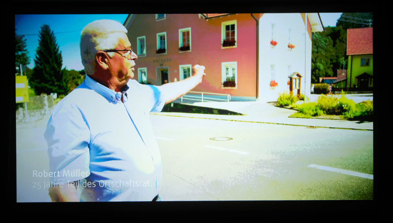 Die nächste Ortschaft, die präsentiert wurde, war Eintürnen, also das Reich von Berthold Leupolz. Für die Eintürner war seinerzeit auch Wolfegg als Partner denkbar, aber nachdem nicht klar war, ob dieses selbst selbstständig bleiben wird, wurde diese Option verworfen. Überliefert ist dazu eine Anekdote des damaligen Eintürner Bürgermeisters Hecht: „Es isch nix, wenn zwoi Arme zsammaganget.“ Auf Brauns Frage, was Eintürnen heute so besonders macht, gab Leupolz zur Antwort: „Die Gemeinschaft.“ Auch wenn Eintürnenberg der Ortsteil mit den wenigsten Einwohnern sei, sei es das Zentrum: Mit Rathaus, Kirche, Schule und Halle sind alle öffentlichen Gebäude dort.