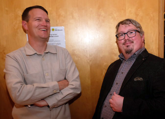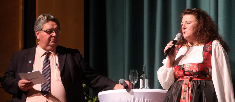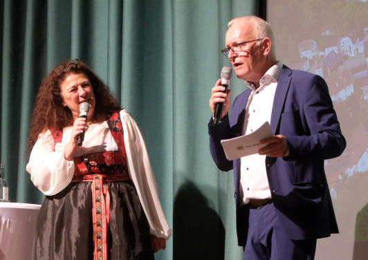 Für den Kernort, mit dem zusammen die vorgenannten Ortschaften die Großgemeinde Bad Wurzach bilden, kam noch einmal Bürgermeisterin Alexandra Scherer mit ihrer „Rechten Hand“ Martin Tapper auf die Bühne. Dieser konnte aus den Gesprächen mit Jürgen Schumacher, dem langjährigen Hauptamtsleiter, der zur Eingemeindungszeit bereits in der Stadtverwaltung tätig war, ein Bild aufzeichnen, wie es sich damals angefühlt habe. Schumacher empfand diese Zeit als sehr intensiv mit vielen Sitzungen. Vor allem die ausführlichen Nachsitzungen seien oft entscheidend gewesen. Um dann nämlich festzustellen, „des sind alles rechte Leit!“ Daraufhin warf Manfred Braun ein: Also müssen wir die Gemeinderatssitzungen abkürzen, damit mehr Zeit für die Nachsitzungen bleibt.