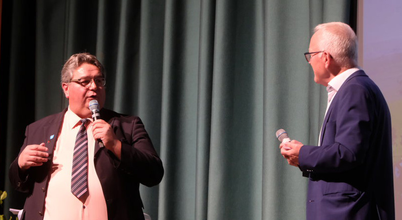 Zur Vorstellung von Arnach – zunächst im Film, dann im Gespräch – holte Manfred Braun seinen Vorgänger Mike Rauneker auf die Bühne, der 15 Jahre lang die Geschicke des einwohnerreichsten Teilortes gelenkt hatte. Zeitzeugen, die im Arnach-Film zu Wort kamen und zur Eingemeindung des Teilorts im Jahre 1972 sprachen, waren der Gärtnermeister Matthias Grad senior und Alt-Stadtrat Hansjörg Schick. Zur Zeit der Eingemeindung Arnachs vor 53 Jahren war Eugen Vogt Bürgermeister von Arnach und wurde in der Folge dessen erster Ortsvorsteher, ehe 1978 Paul Barensteiner dieses Amt für mehr als 30 Jahre übernahm, dem 2009 dann Mike Rauneker folgte, berichtete Manfred Braun auf die entsprechende Frage von Leupolz beim Interview danach. Rauneker brachte mit einem Wort zum Ausdruck, wie sich die Gemeinde Arnach während seiner Amtszeit entwickelte: Melap. „Damals wurde jeder Stein in der Ortsmitte umgedreht, es wurden Brachen bebaut, der Busplatz gebaut, die neue Ortsmitte beim Dorfladen, auf die die Arnacher stolz sind, wurde gestaltet.“ Aber ohne die Hilfe der Stadt Bad Wurzach wäre vieles nicht zu schaffen gewesen, sagte Rauneker. „Dadurch ist es das geworden, was es jetzt darstellt.“