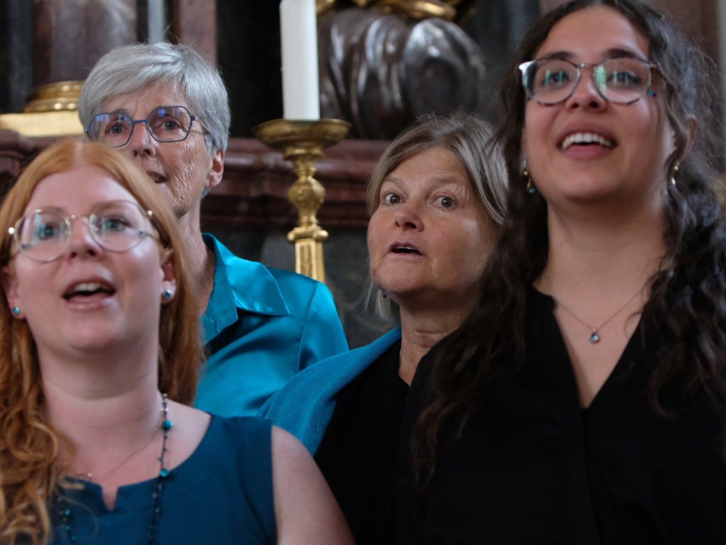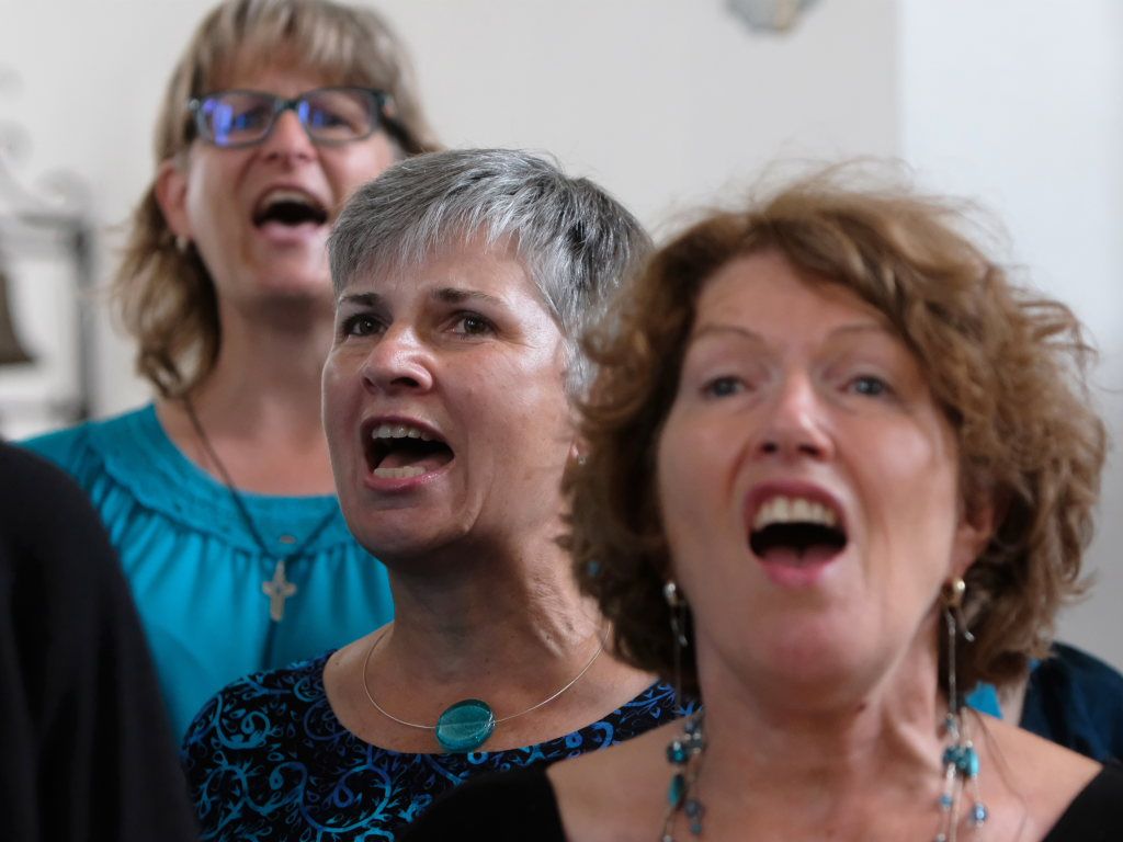 Bevor der Chor „Going up yonder“ wieder mit Birgit Werner als Solistin sang, stimmte der einführende Text auf das Lied ein: „Ziel eines jeden Lebens ist der Tod, die Erlösung, der Himmel. Mit Gottes Gnade bestreite ich diesen Weg, bis ich vor seinem Angesicht stehe – auf der anderen Seite.“