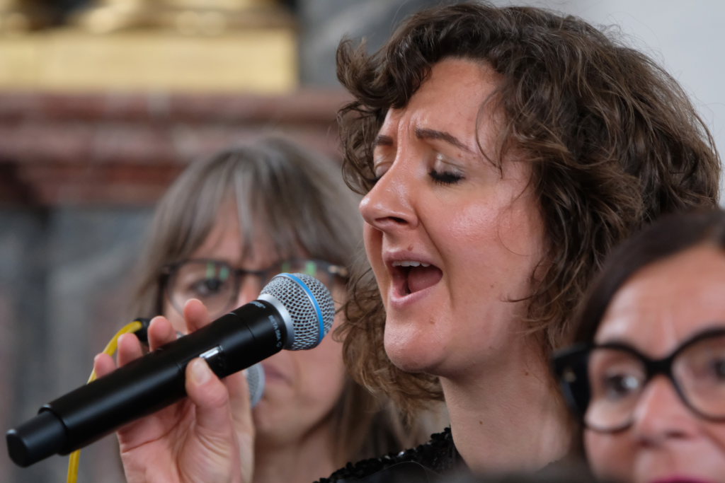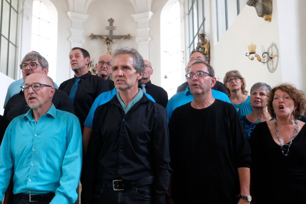 Um wieder ein wenig von diesem Thema wegzukommen, das zwar zum Leben dazugehört, aber nicht ganz dem entsprach, weswegen Chor und Besucher in die Kirche in Aitrach gekommen waren, nämlich um das Leben und Gott zu feiern, lud Peter Litzbarski alle ein, mit den letzten Liedern „Everybody `s talking“ zu leben und eine wahre „Heilig Geist Party“ – „Good to the very last drop“ zu feiern. Mit diesem Lied fachte der Chor zum Abschluss noch viele positive Emotionen an, bekam stehende Ovationen vom Publikum, das sich die Zugabe „This train“ damit redlich verdiente.