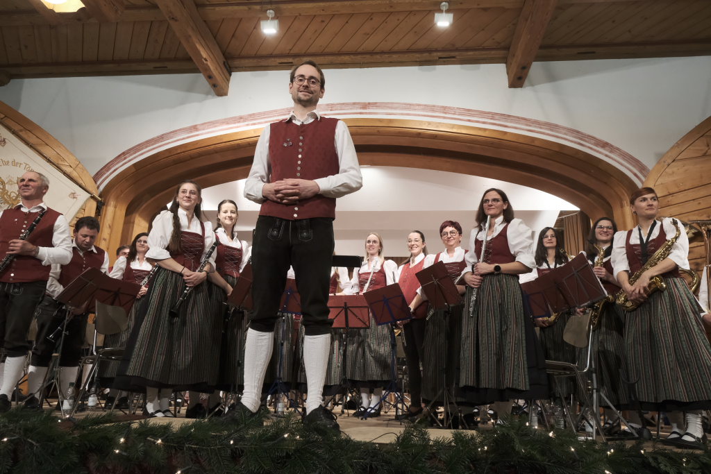 Mit dem schmissig-knackigen Konzertmarsch „Marsch vom edlen Volk“ mit einem sehr melodiösen Trio, geschrieben von Johannes Guggenmos und arrangiert von Alexander Pfluger, dem Gründer der „Schwindligen 15“, kehrten die Musiker nach der wohlverdienten Pause auf die weihnachtlich geschmückte Bühne des Dorfstadels zurück. „Heute muss es wohl heißen: Für das edle Volk gespielt“, merkte die charmante Moderatorin Heike Reichle dazu an, die gemeinsam mit Patrick Ernle durch das Programm führte.