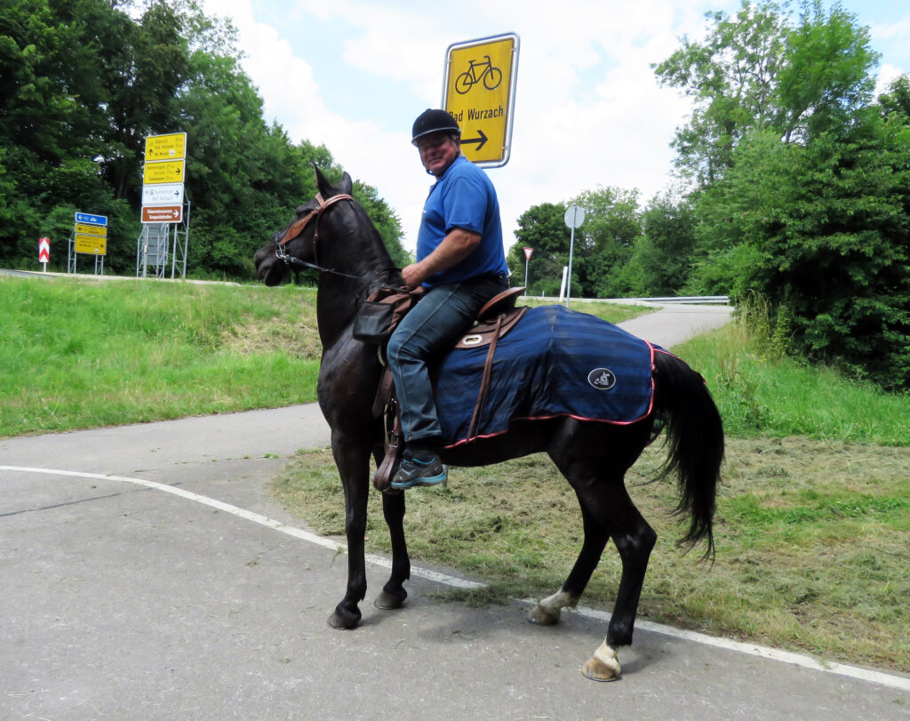 Angehalten. Fotografiert. Da kommt unser Reiter. „Wia hoisch?“ – „Stefan Mangold.“ – „Zu welcher Blutreitergruppe ghörsch?“ – „Zue de Rötabacher.“ Sagt’s und reitet Richtung Truschwende. Dann dreht er sich um und sagt: „Bin heit zum 25. Mol dabei.“ – „Wenn des so isch, no kommscht en d‘ Bildschirmzeitung nei.“