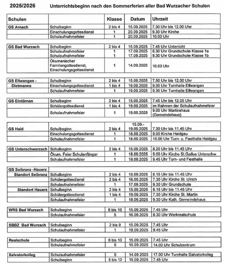 Bad Wurzach – Am 15. September beginnt die Schule. Nachstehend veröffentlicht der „Wurzacher” eine Tabelle mit allen Infos zu Schulbeginn, Einschulungsgottesdiensten und Schulaufnahmefeiern.