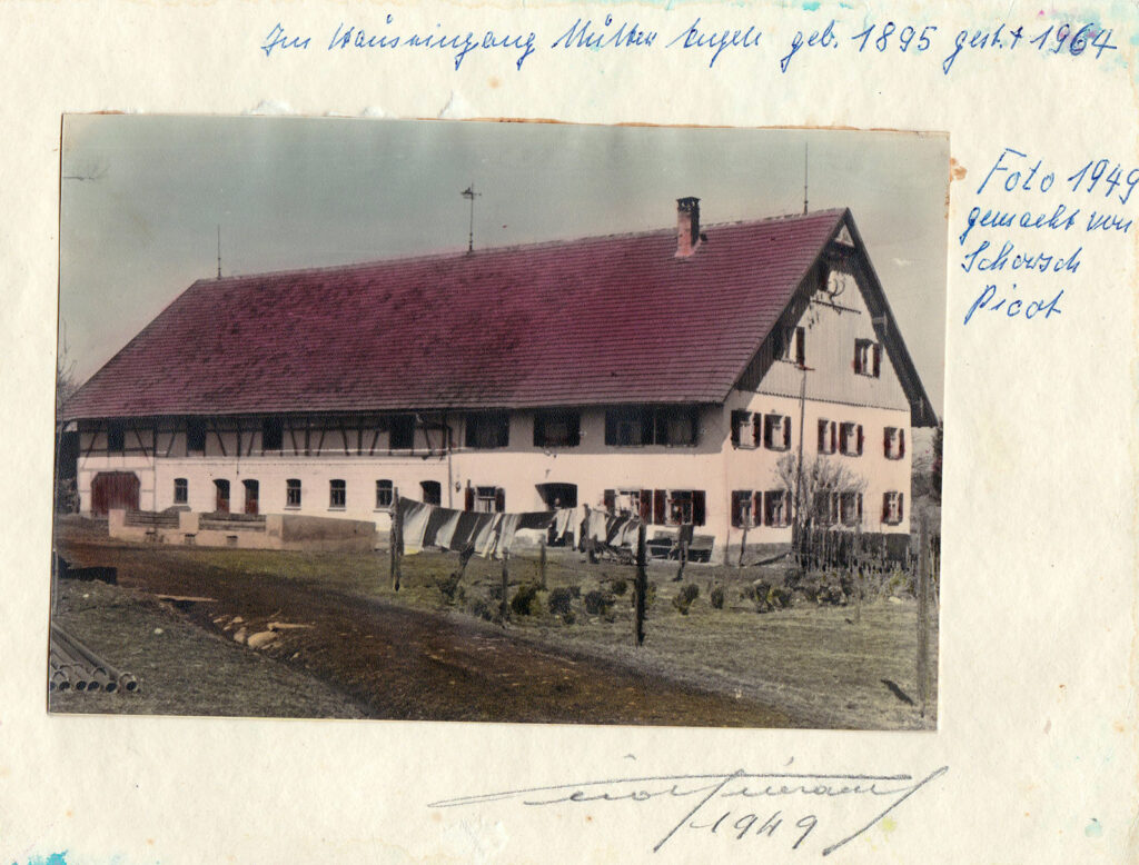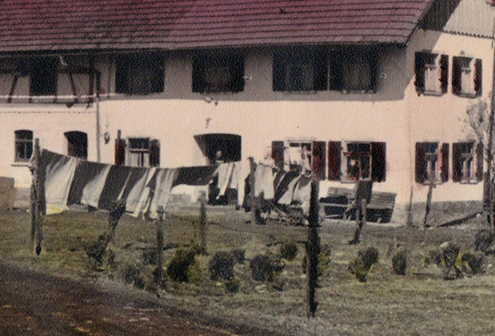 Der Hof Angele in Starkenhofen im Jahre 1949. So hatte er ausgesehen, als die sechs fahnenflüchtigen jungen Burschen im April 1945 auf der anderen Seite des Anwesens anklopften. Gemacht wurde diese Aufnahme vier Jahre später von Georges Picot, einem französischen Besatzungssoldaten, der als Kartograf und Fotograf beim Militär diente. Georges Picot und die Angele-Tochter Josefine (1921 – 2011) wurden ein Paar, heirateten um 1950 in Frankreich. Im Hauseingang, hinter der Wäsche, ist Mutter Angele erkennbar.