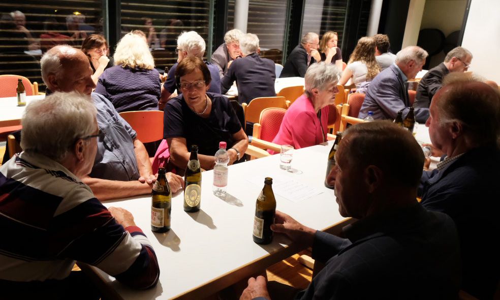 Gerhard Reischmann berichtete in seinem launigen Lichtbilder-Vortrag auch, wie es dazu kam, dass neben der ursprünglich alleinig geplanten Altarrestaurierung plötzlich eine komplette Innensanierung entstanden ist. Und wie etwa Helfer von sich aus auf ihn zugekommen sind: „Ka i Ui helfa?“ Und wie intensiv sich manche Helfer im Wortsinne in die Arbeit hineingekniet haben. Oder wie er einmal angesprochen worden sei, dass sich vor der Kapelle „Ein Bild für Götter“ dargestellt habe, als einige der „Arbeiter“ gerade mal auf einer Wagenpritsche Pause machten. Oder wie lustig der Einkauf des Materials für den Holzboden, mit dem die bisherigen „1B-Fliesen“ nun bedeckt sind, endete. „Eikehra ghört au zum Renoviera“, sagte er. Und dass so manche Helferinnen sie eher wie scheue Rehe vor seiner Chronisten-Kamera verhielten – er habe sie aber trotzdem erwischt.