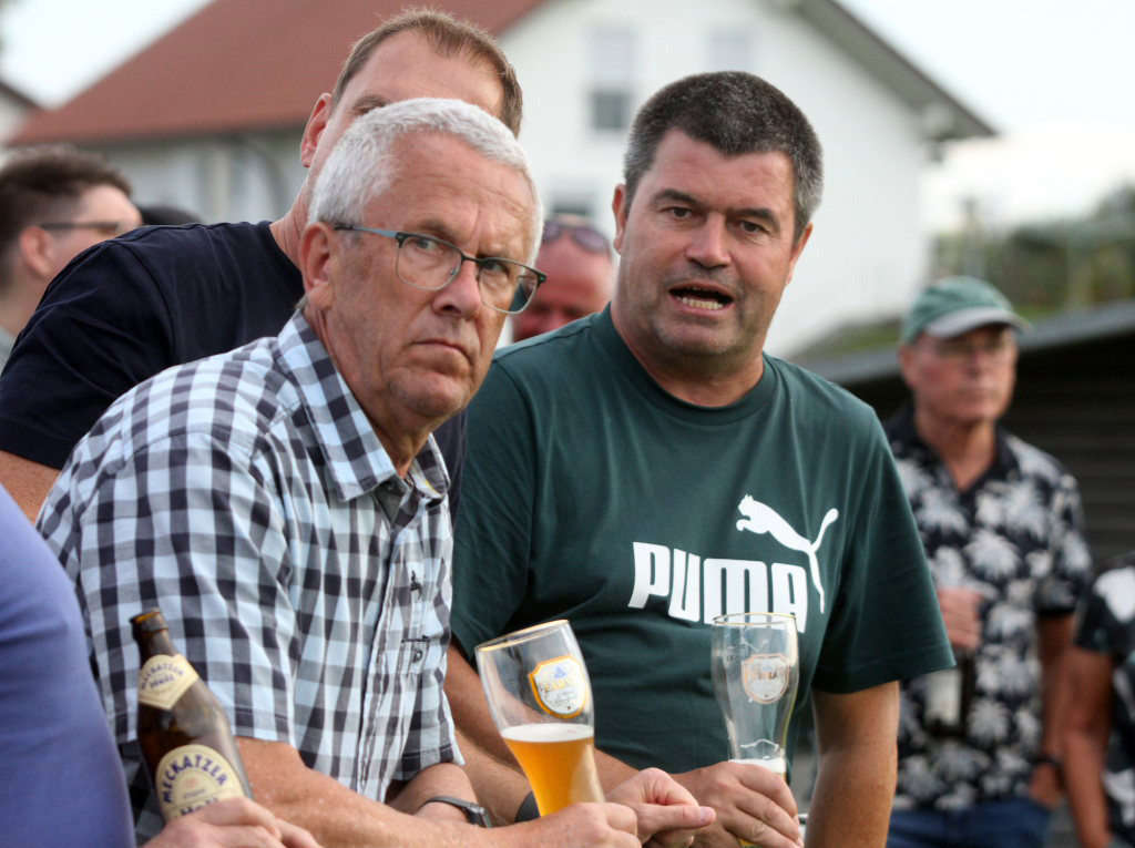 Zwei SVA-Cracks aus früheren Tagen: Arnold („Flocki”) Zapf (links) und Gerald Barensteiner. Thema am Spielfeldrand war auch das legendäre Arnach-Bad Wurzach-Derby von 1976. „Flocki” meint, es sei 2:1 für Arnach ausgegangen.