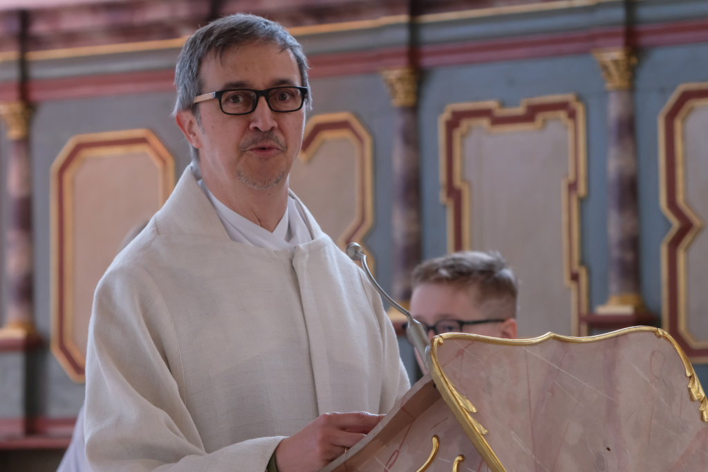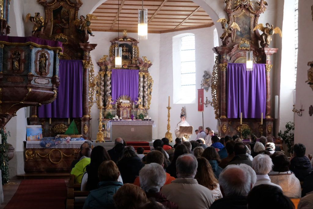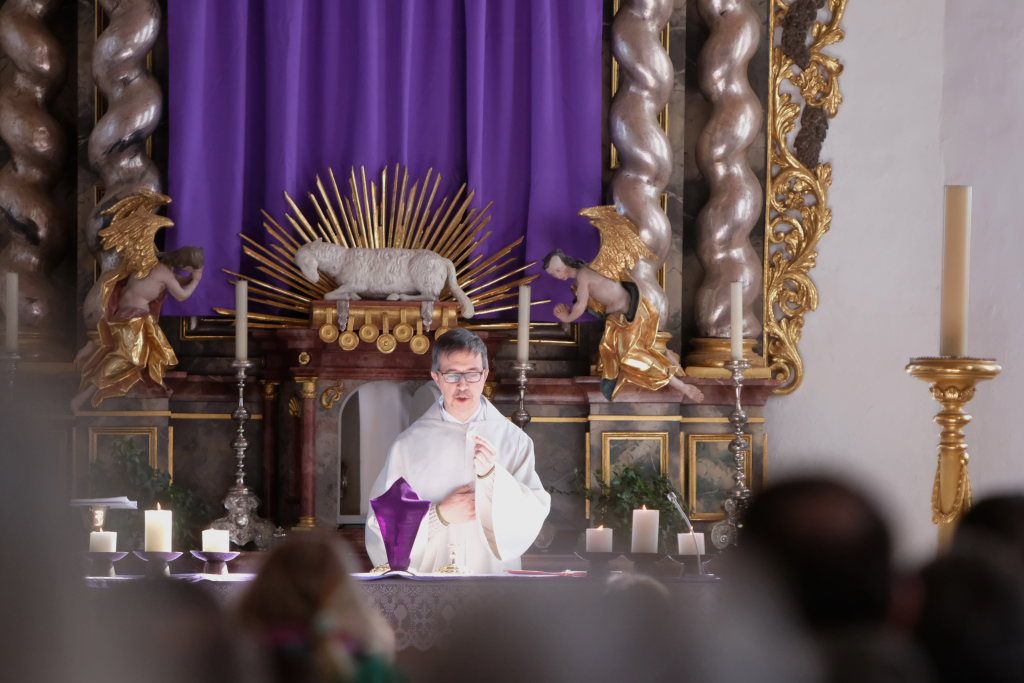 Den Sonntag eröffneten die „Jubilare“ mit einem Festgottesdienst mit Pastoralreferent Raimund Miller, musikalisch unterstützt von einer 16-köpfigen Kinder- und Jugendband in der Pfarrkirche St. Martin in Eintürnenberg. Bereits in seiner Begrüßung ging Miller auf den Spitznamen für die Gegend um Eintürnen, „Bockland“ ein. Er fragte die Festgemeinde, ob sie heute schon gejubelt habe. „Denn Jubel oder hebräisch „Jobel“ bedeutet nichts anderes als Widder bzw. Ziegenbock.“ Und Jubel sei ja ein Ausdruck der Freude. „Liebe Festgemeinde, liebe Landjugend, als ich das Evangelium gelesen hatte, das eigentlich für heute vorgesehen ist, war mir klar: Die drohende Steinigung einer vermeintlichen Ehebrecherin. Bei aller Liebe, aber für ein Jubiläum geht das nicht!“ Mit diesen Worten eröffnete Raimund Miller seine Festpredigt an jebem Passionssonntag. Deswegen legte er sein Augenmerk auf die Landjugend und das Jubiläum. „Darauf, was es dafür braucht, um Landjugend zu sein, seit 80 Jahren schon, aber auch im Jetzt und in Zukunft. Es braucht Passion, das heißt: Liebe und Leidenschaft.“ Darauf, was an diesem Tag als Evangeliumstext gehe, hätten die Landjugendlichen ihn gebracht, als sie sagten „Zu einem Jubiläum gehört ein Gottesdienst dazu.“ Also wir UND Gott. Dieses UND war für Euch ganz klar.”