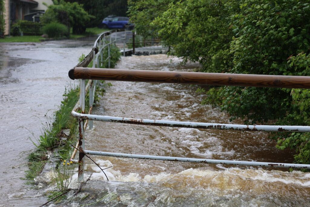 Vom Ortseingang kommt es wie in Sturzbächen. Glücklicherweise hat der Bach im Ort ein deutliches Gefälle, so dass der Abfluss schnell gehen kann. Aber an Engstellen wie den zahlreichen Brücken gibt es halt den Rückstau. Anlieger Hermann Schmaus hat schon vor Monaten vor dieser Hochwassergefahr gewarnt. Das vom Tal hereindrängende Wasser wird im Gegensatz zu früher immer mehr und immer schneller, weil mehr Flächen bebaut seien, macht er deutlich. In Hauerz hat es früher Mühlen und Sägereien gegeben, die von der Wasserkraft die Energie nützten. Heute ist das Wasser zur Gefahr geworden.