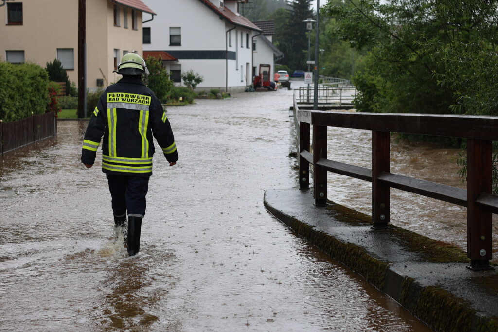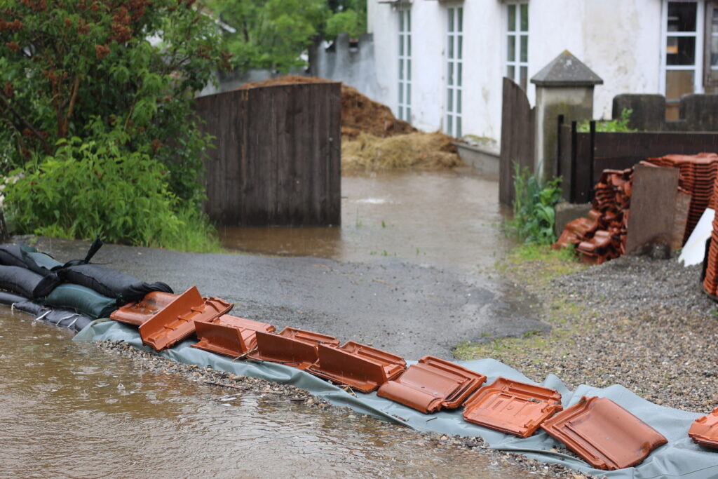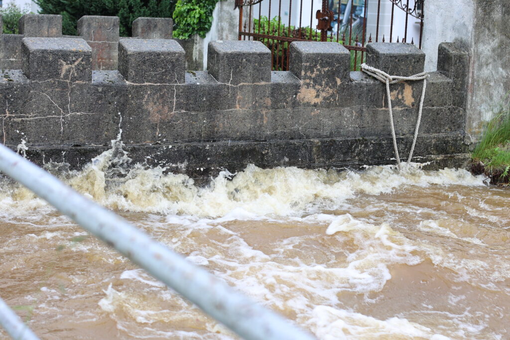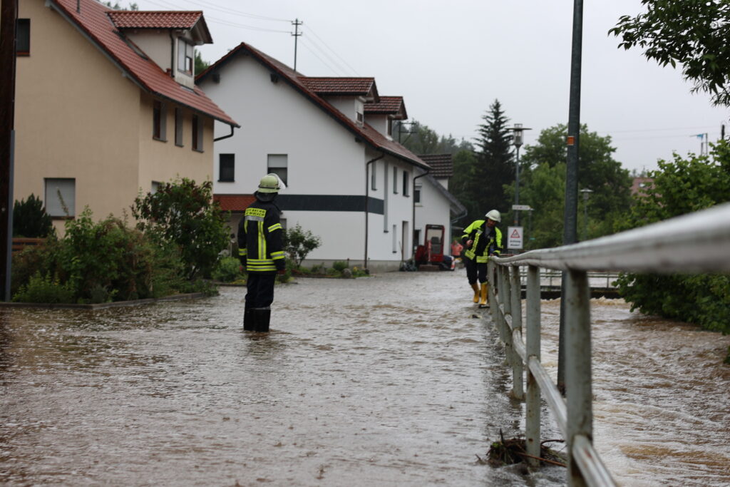 Hauerz – Eine unruhige Nacht für die Anlieger in der Bachstraße und besorgte Mienen bei Ortsvorsteher Kurt Miller und Feuerwehrleuten – das ist das Fazit heute Morgen am 1. Juni. Wie weit wird es noch steigen? Diese Sorge brachte viele Anlieger in der Hauerzer Bachstraße um den Schlaf. Die Bachstraße ist auf weiter Strecke unter Wasser. Ein Pferdestall musste in der Nacht mit Hilfe von Feuerwehrmann Manne Willburger geräumt werden, die Pferde in einen sicheren Stall gebracht werden. Sandsackbarrieren sollen das Schlimmste verhindern. Die Brücken sind Bremsen für das schnell fließende Wasser.