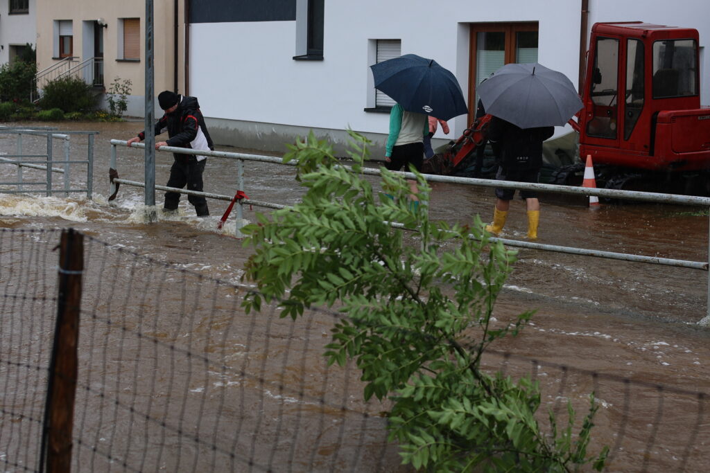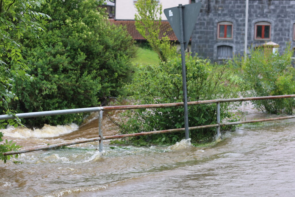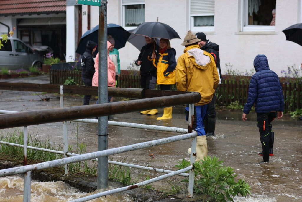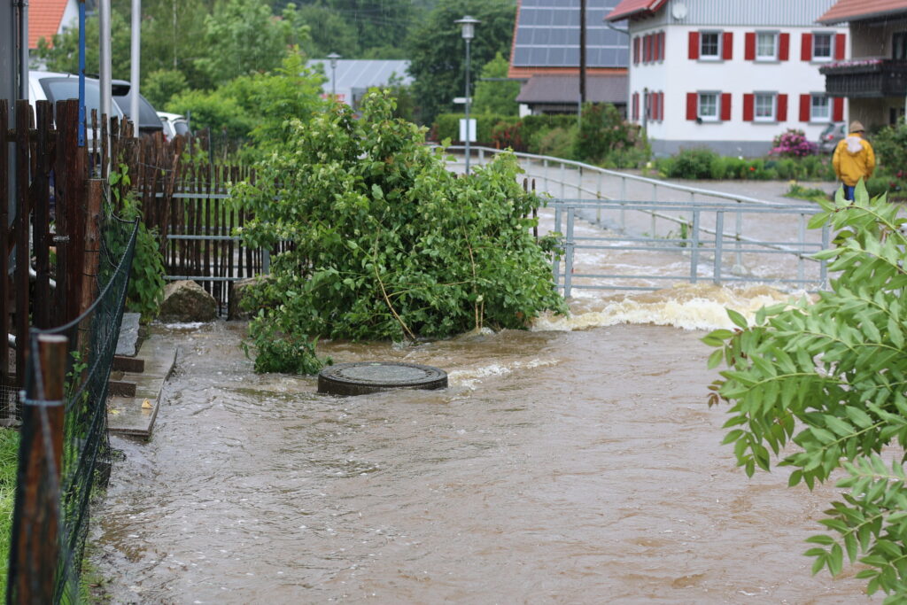 Vom Ortseingang kommt es wie in Sturzbächen. Glücklicherweise hat der Bach im Ort ein deutliches Gefälle, so dass der Abfluss schnell gehen kann. Aber an Engstellen wie den zahlreichen Brücken gibt es halt den Rückstau. Anlieger Hermann Schmaus hat schon vor Monaten vor dieser Hochwassergefahr gewarnt. Das vom Tal hereindrängende Wasser wird im Gegensatz zu früher immer mehr und immer schneller, weil mehr Flächen bebaut seien, macht er deutlich. In Hauerz hat es früher Mühlen und Sägereien gegeben, die von der Wasserkraft die Energie nützten. Heute ist das Wasser zur Gefahr geworden.