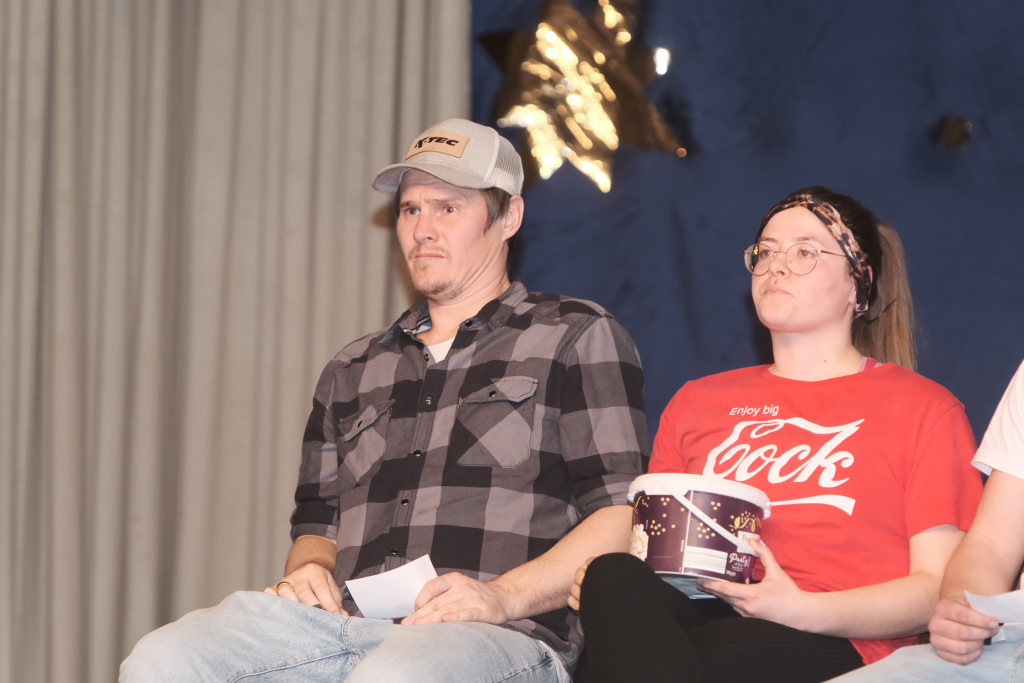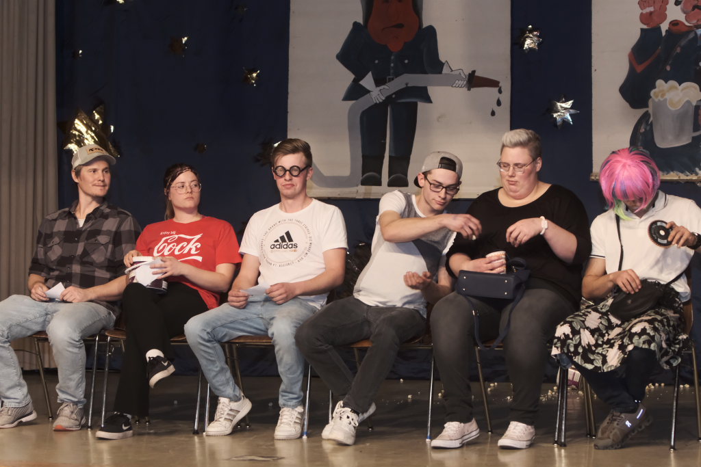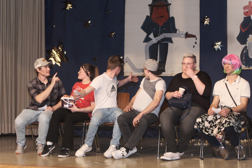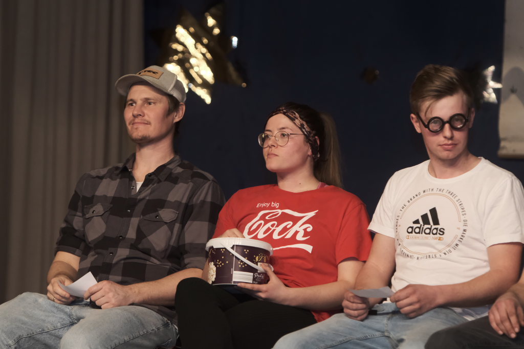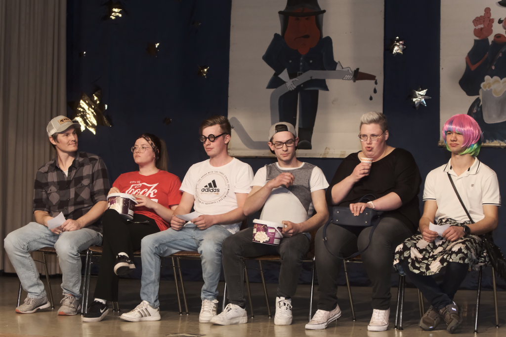 Beim nächsten Programmpunkt waren keine Worte erforderlich: Wer kennt es nicht: Man sitzt gemütlich im Kinosessel, da kommen dummerweise noch Nachzügler, welche die noch leeren Plätze neben einem besetzen wollen und deswegen über einen drübersteigen und sich an einem vorbeiquetschen müssen. Bei Doris Schiedel, Timo und Jonas Waizenegger, Ralf Beckers, Pauline Angerer und Marcel Menig wurde diese Szene zur Zwerchfell strapazierende Pantomime, zumal es dabei auch noch um ein getrenntes Liebespaar geht, das sich – quasi über die Köpfe der anderen Besucher hinweg – Liebesbotschaften schickt.