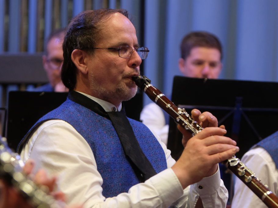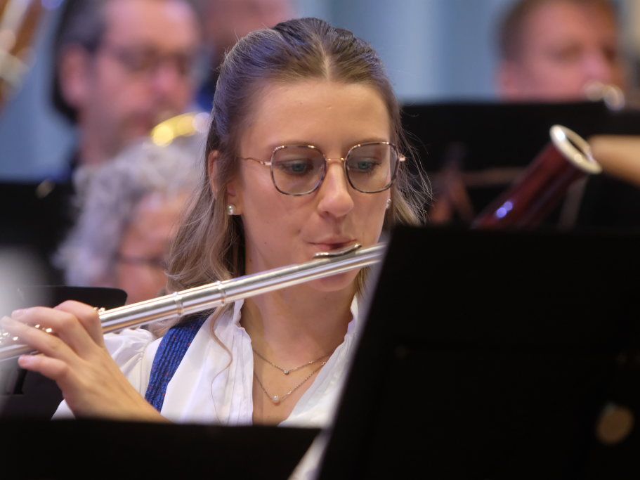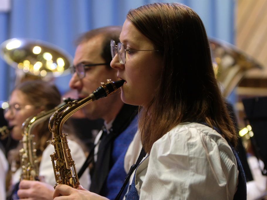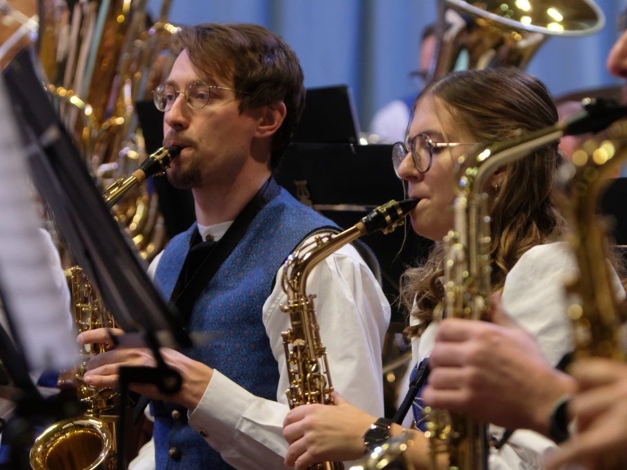 Mit Heartland Sketches des amerikanischen Komponisten Mark Camphouse startete „Pilot“ Alexander Werner in das Konzert. Es ist eine standesgemäße Eröffnungsfanfare mit Anklängen aus dem Iowa Fight Song. Ihm ließen die Musiker „Where never Lark or Eagle flew“ von James Curnow folgen. Dieses beeindruckende Werk für Blasorchester basiert auf einem inspirierenden Gedicht, das ein amerikanischer Pilot im Zweiten Weltkrieg geschrieben hat. Anna-Lena Feser, die gemeinsam mit Armin Lupfer charmant und gekonnt durchs Konzertprogramm führte, zitierte einige Zeilen aus dem Gedicht: „Auf! Auf! Entlang berauschendem und grellen Blau, hat mich mein leichter Sinn in Sturmeshöhn geführt, die keine Lerche und kein Adler je erreicht…“ Schillernde Blechbläserklänge und schwungvolle Holzbläserlinien begleiteten denn auch die Musiker auf ihrem Höhenflug. Und spiegelten die Liebe des jungen Mannes fürs Fliegen und seine Befreiung von den Sorgen der Welt wider.