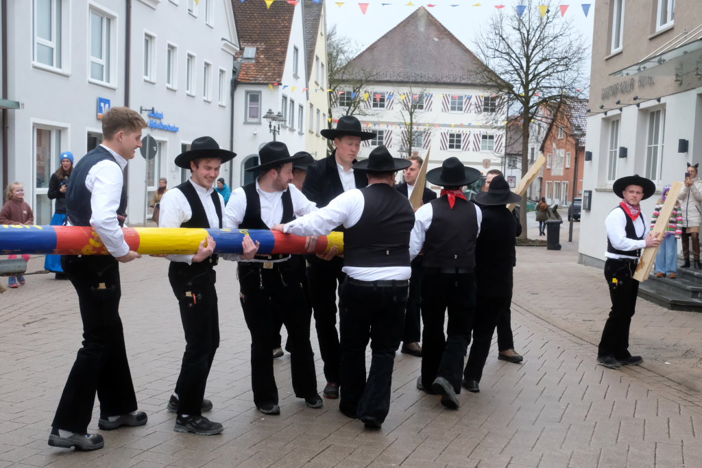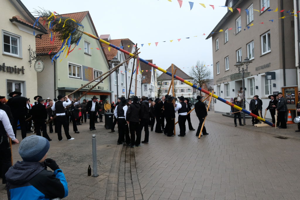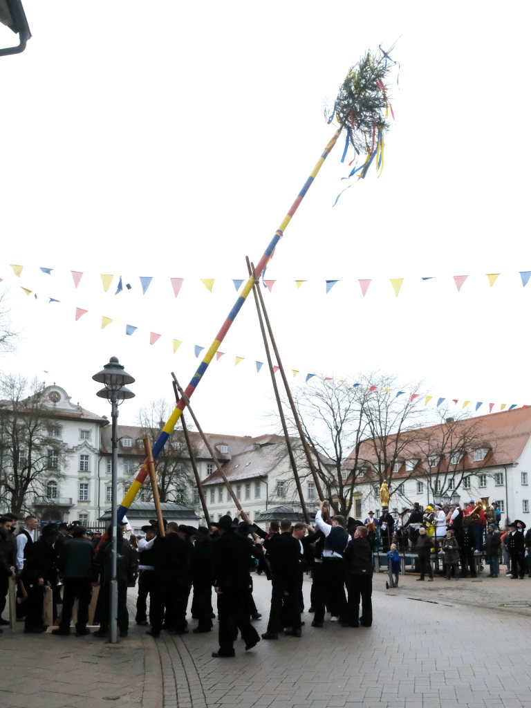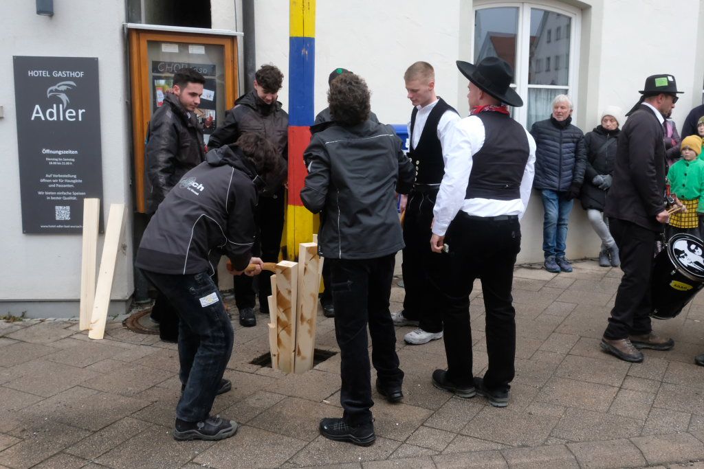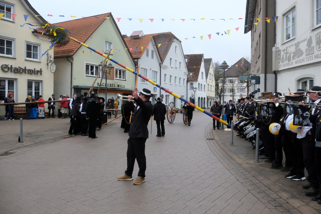 Doch der Reihe nach: Wie in jedem der letzten Jahre übernahm Franz-Josef Maier, genannt “Chief”, das Kommando beim Aufrichten und rezitierte dabei den Narrenbaumspruch des ehemaligen Stadtbaumeisters und gelernten Zimmermanns Peter-Paul Thum. Dass die Ansage, „Leit ganget auf d’ Seit , ‘s ka sei, dass d’r Bomm au umfalla ka“, seine Berechtigung hat, hat sich gezeigt – siehe oben.