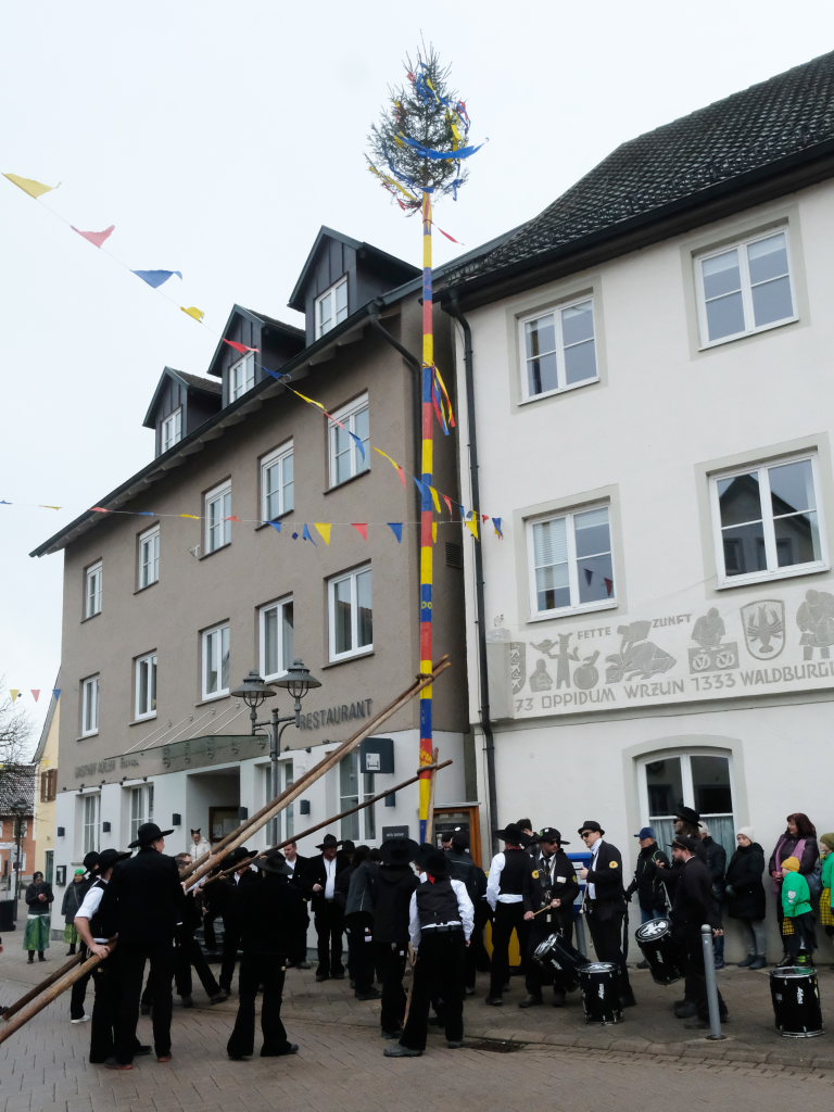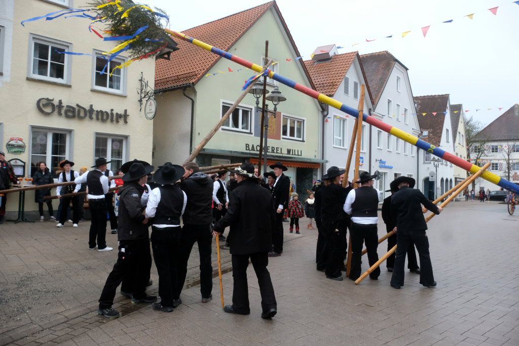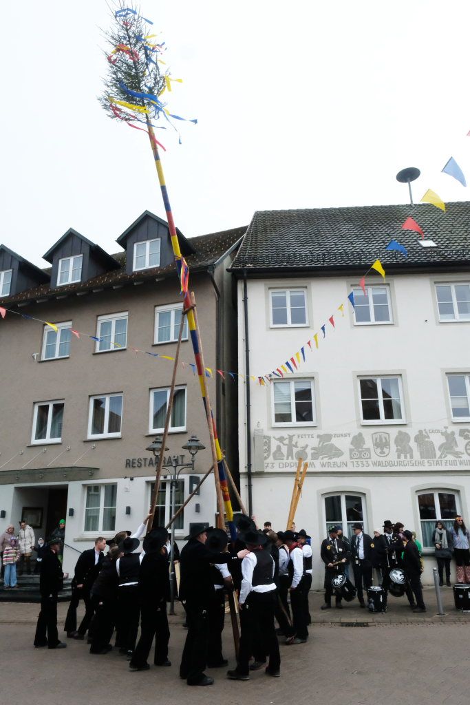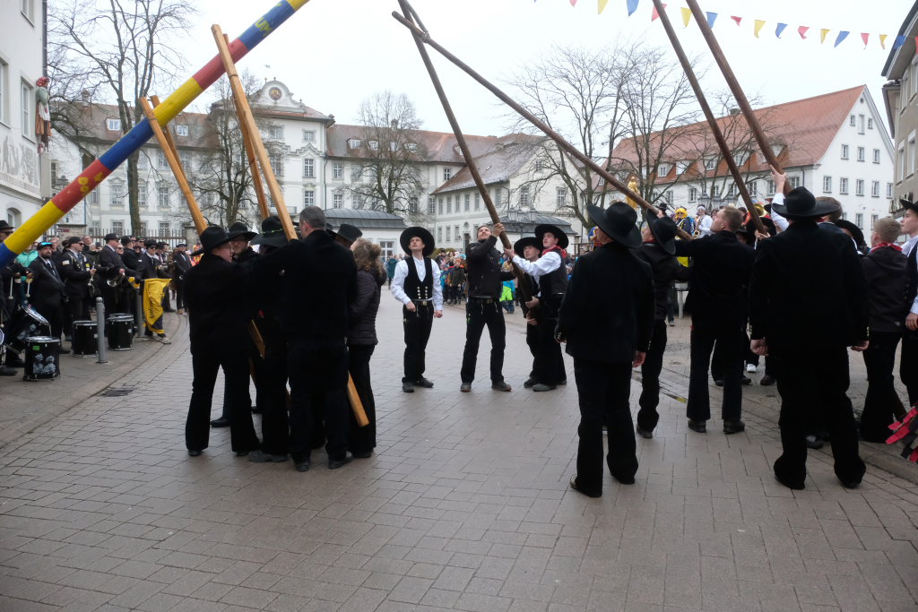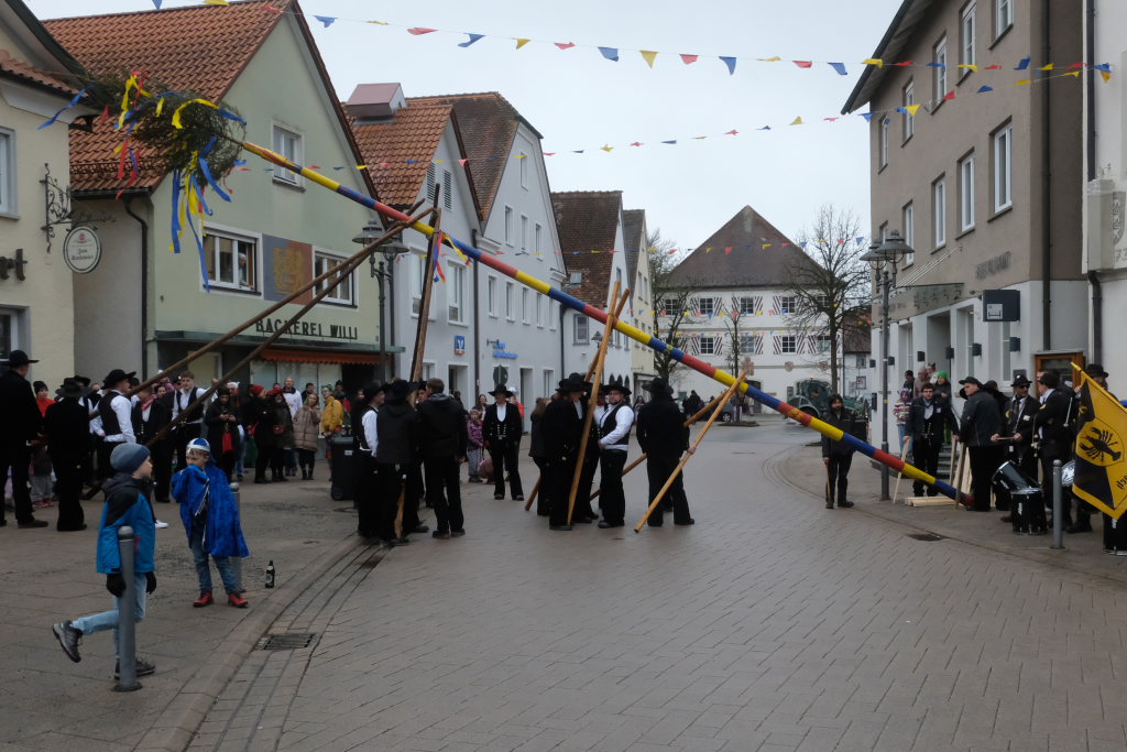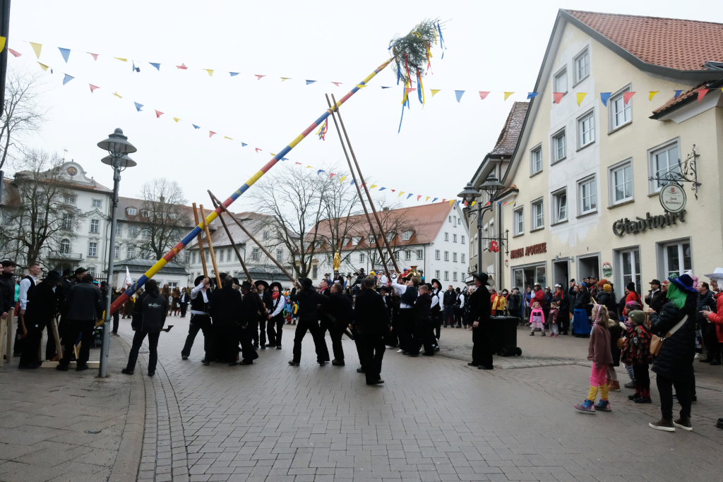 Doch der Reihe nach: Wie in jedem der letzten Jahre übernahm Franz-Josef Maier, genannt “Chief”, das Kommando beim Aufrichten und rezitierte dabei den Narrenbaumspruch des ehemaligen Stadtbaumeisters und gelernten Zimmermanns Peter-Paul Thum. Dass die Ansage, „Leit ganget auf d’ Seit , ‘s ka sei, dass d’r Bomm au umfalla ka“, seine Berechtigung hat, hat sich gezeigt – siehe oben.