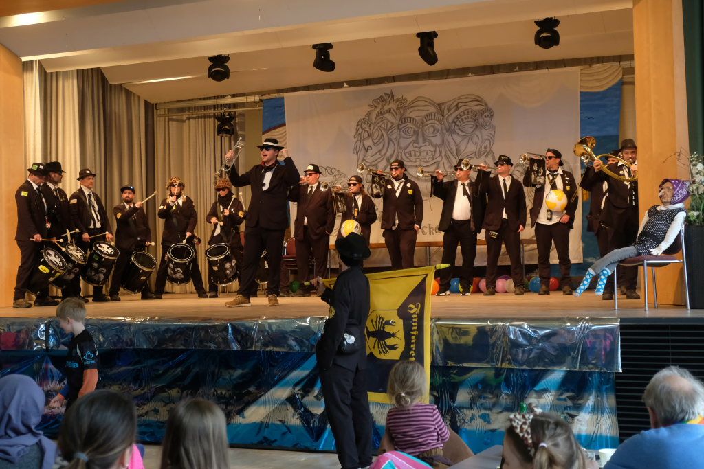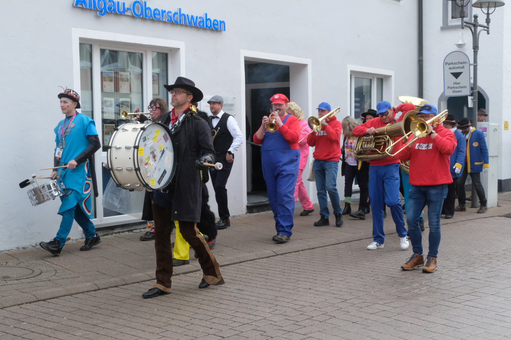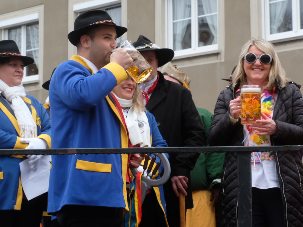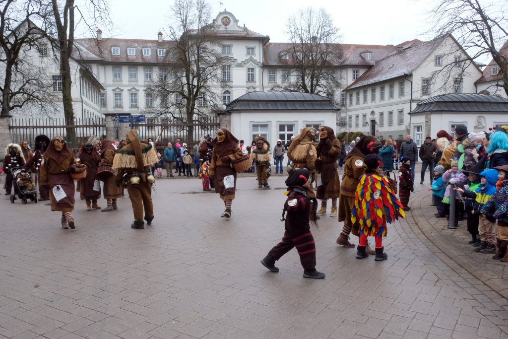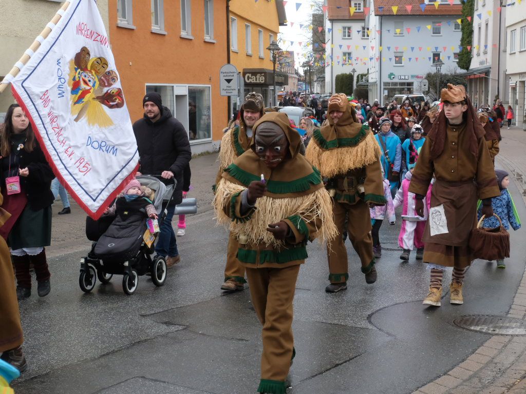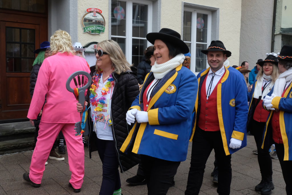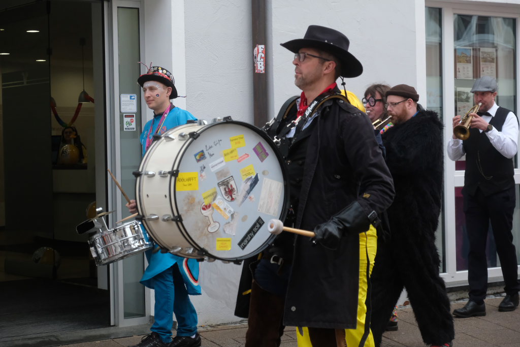 Und nach dem Zimmermanns-Klatsch und nachdem einige Maßkrüge auf dem Rednerpodest gekreist waren, machten sich die großen und kleinen Narren unter den Klängen des Fanfarenzugs auf den Weg zum Kursaal, jetzt “Kulturschmiede”, auf, wo die Narrenzunft ein kleines Programm mit Malen, Spielen und Tanzen für die Kleinen vorbereitet hatte, auch Essen und Trinken für alle.
