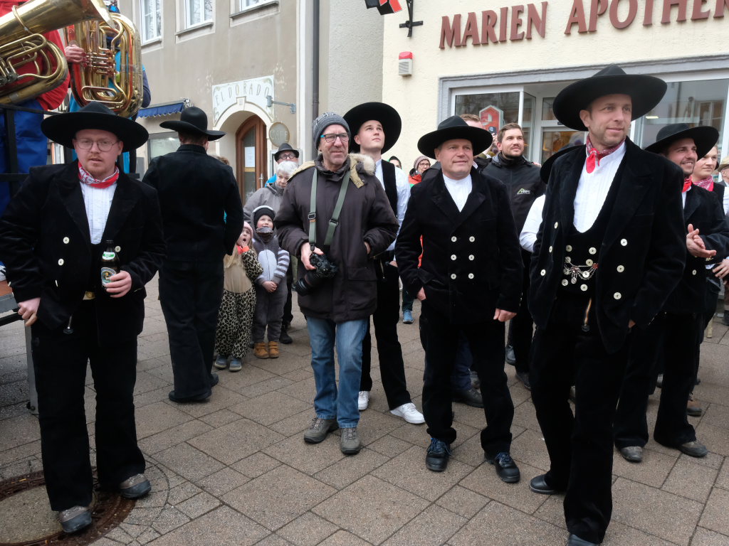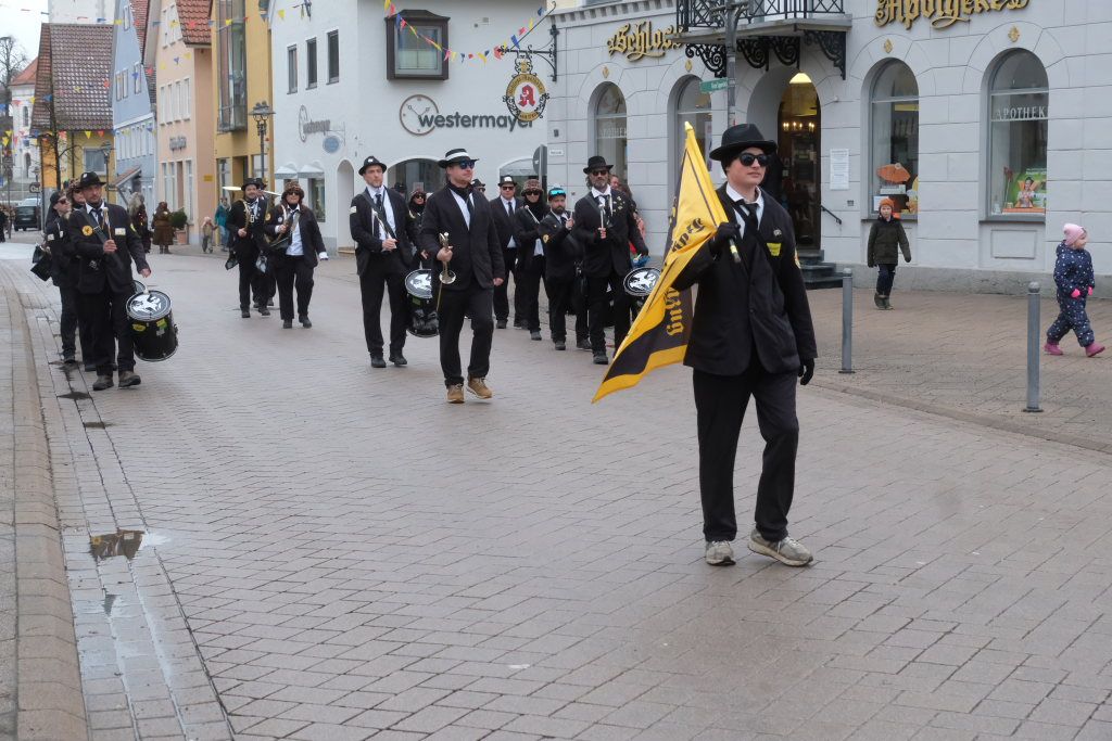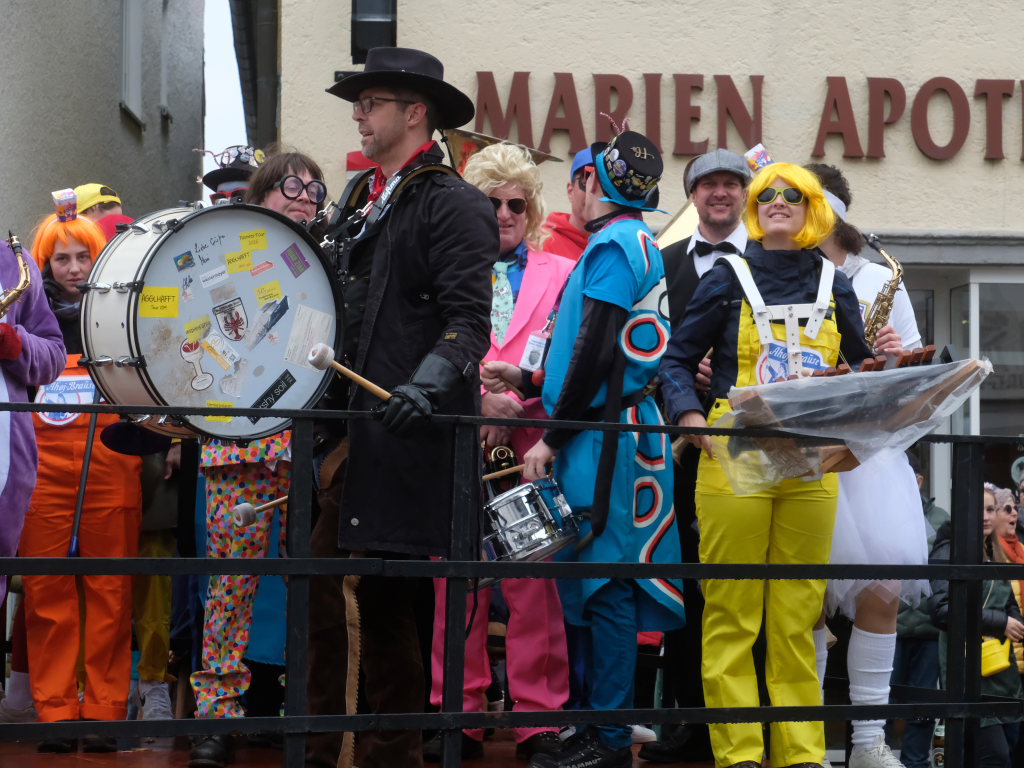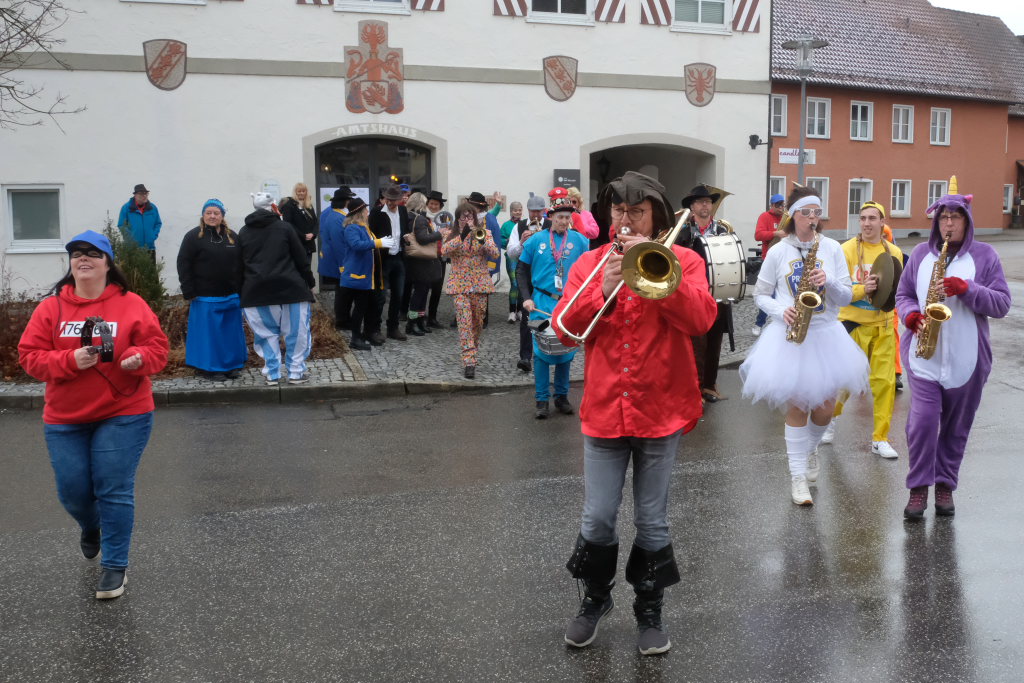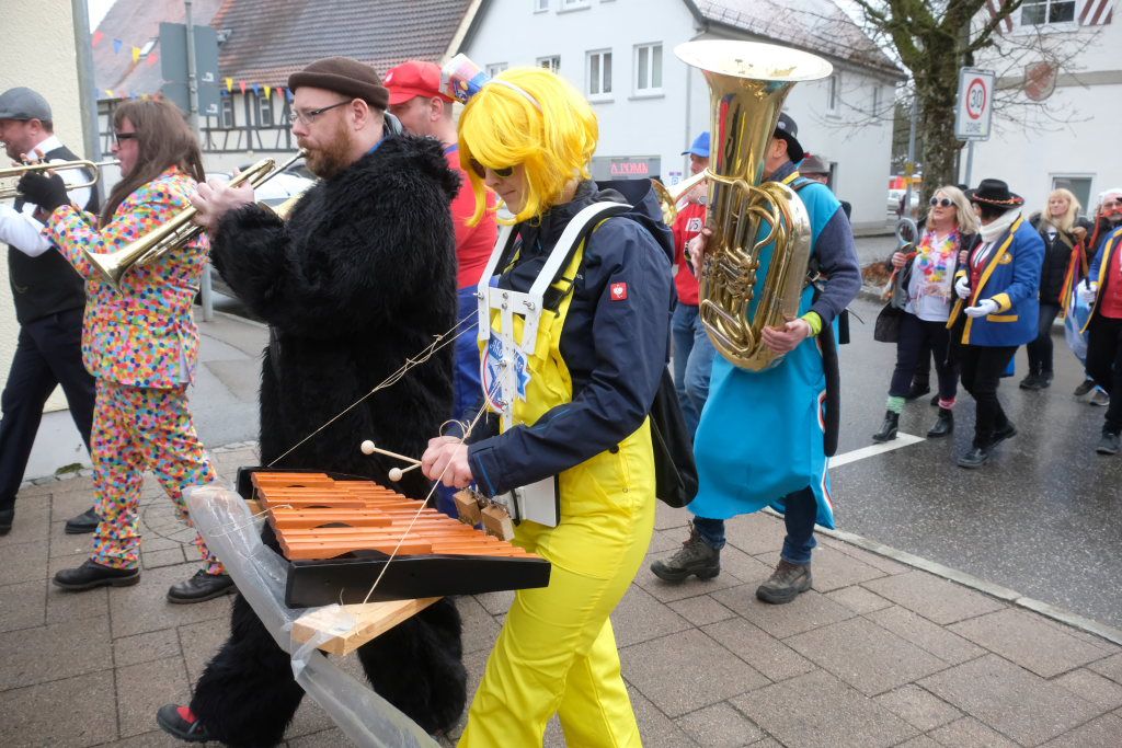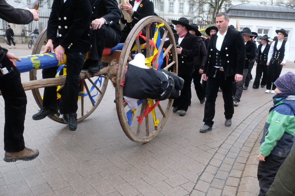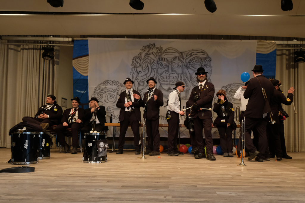 Und nach dem Zimmermanns-Klatsch und nachdem einige Maßkrüge auf dem Rednerpodest gekreist waren, machten sich die großen und kleinen Narren unter den Klängen des Fanfarenzugs auf den Weg zum Kursaal, jetzt “Kulturschmiede”, auf, wo die Narrenzunft ein kleines Programm mit Malen, Spielen und Tanzen für die Kleinen vorbereitet hatte, auch Essen und Trinken für alle.