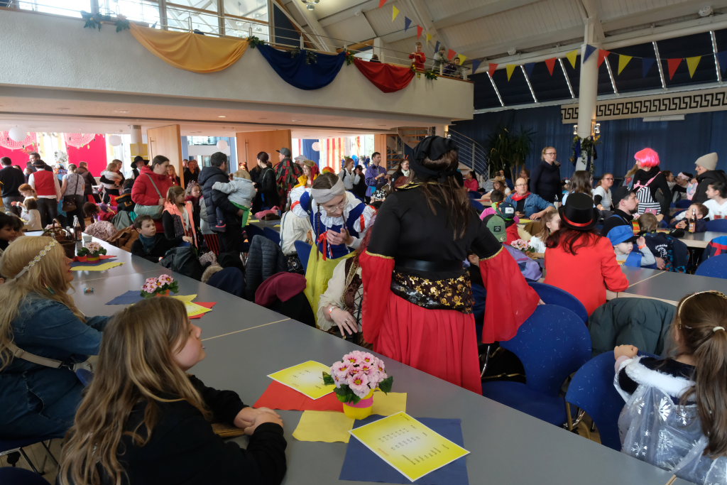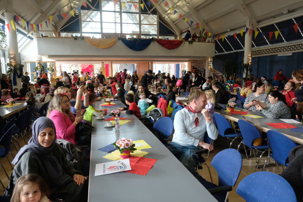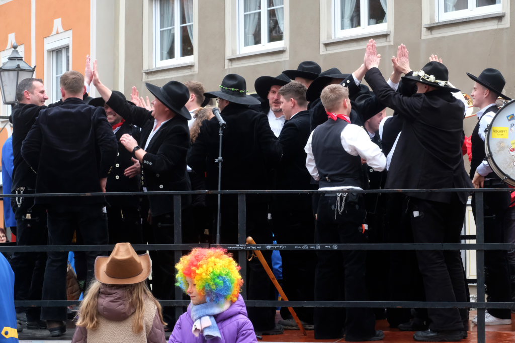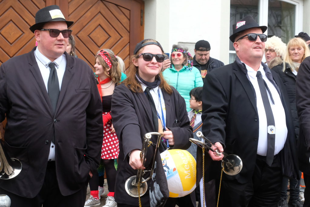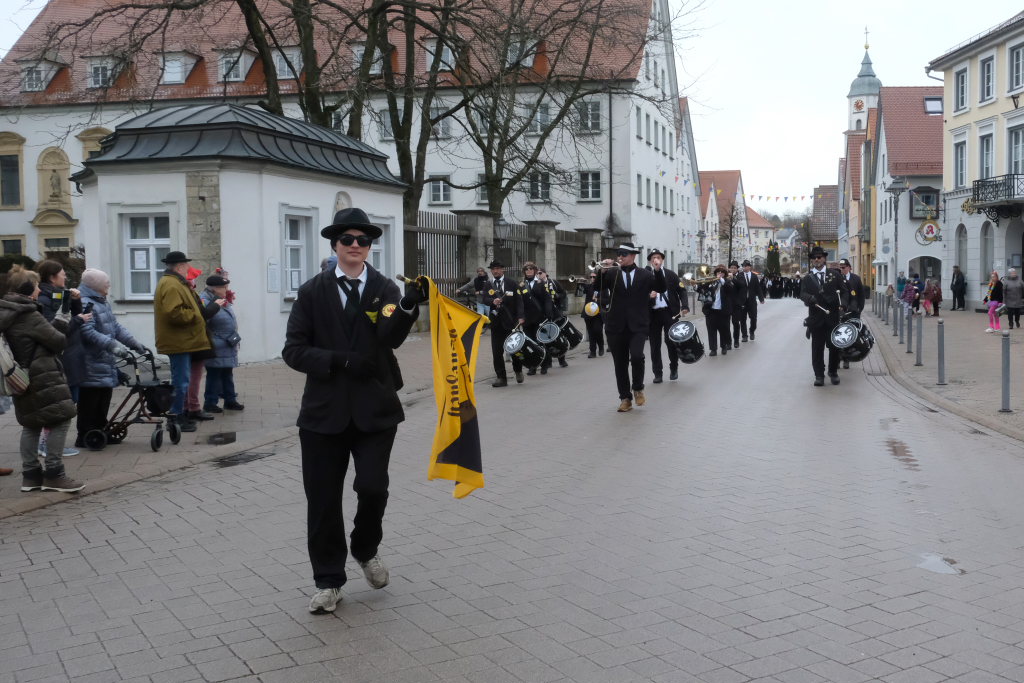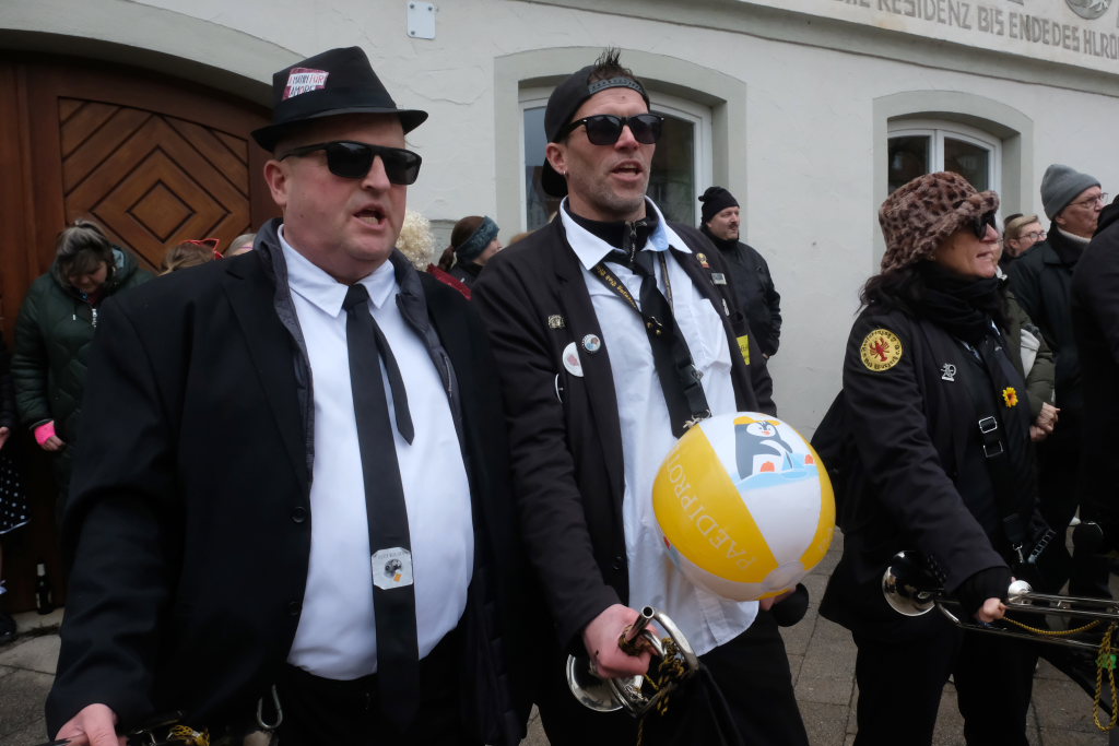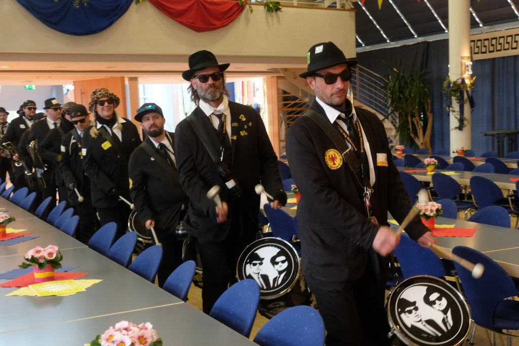Und nach dem Zimmermanns-Klatsch und nachdem einige Maßkrüge auf dem Rednerpodest gekreist waren, machten sich die großen und kleinen Narren unter den Klängen des Fanfarenzugs auf den Weg zum Kursaal, jetzt “Kulturschmiede”, auf, wo die Narrenzunft ein kleines Programm mit Malen, Spielen und Tanzen für die Kleinen vorbereitet hatte, auch Essen und Trinken für alle.