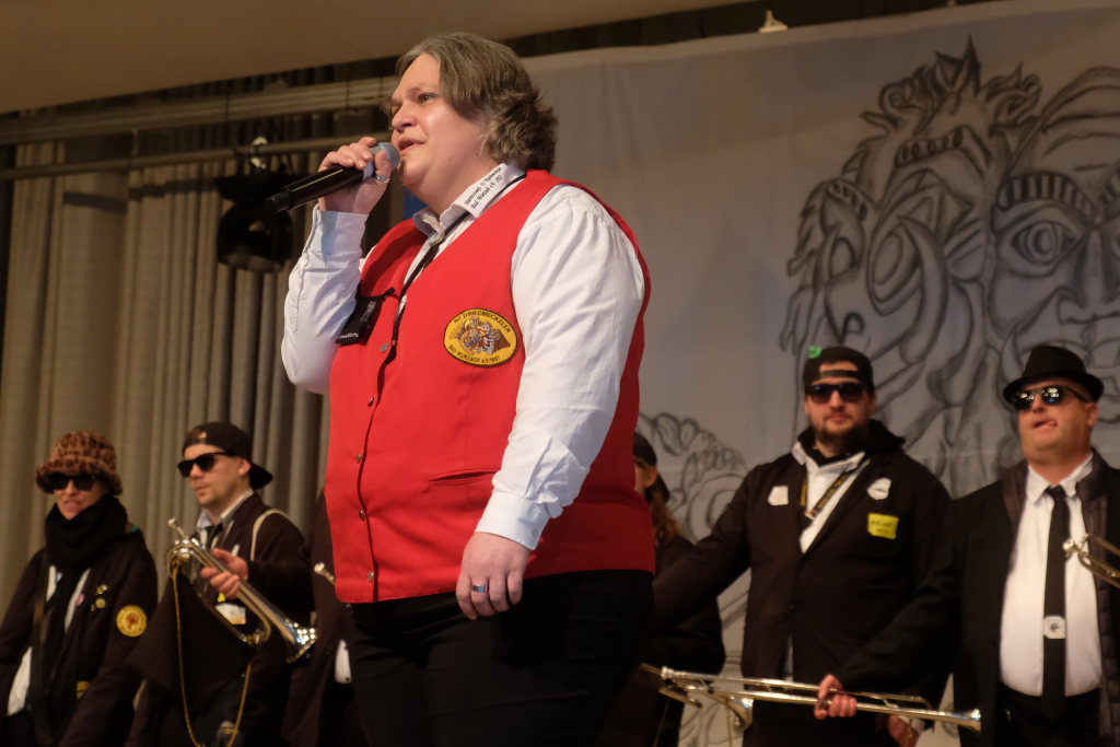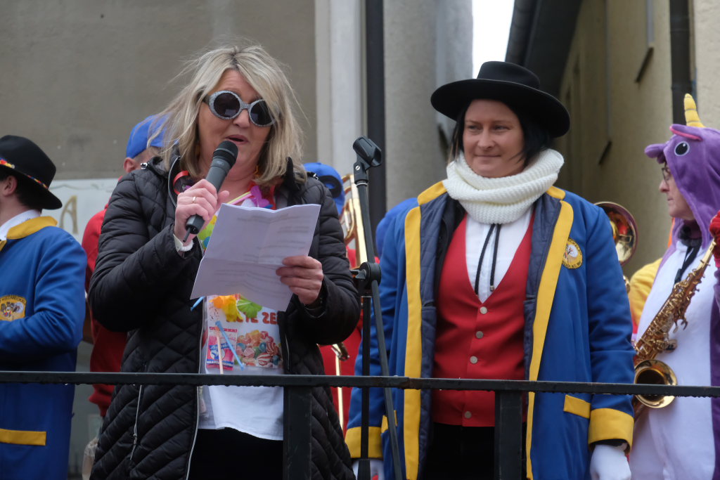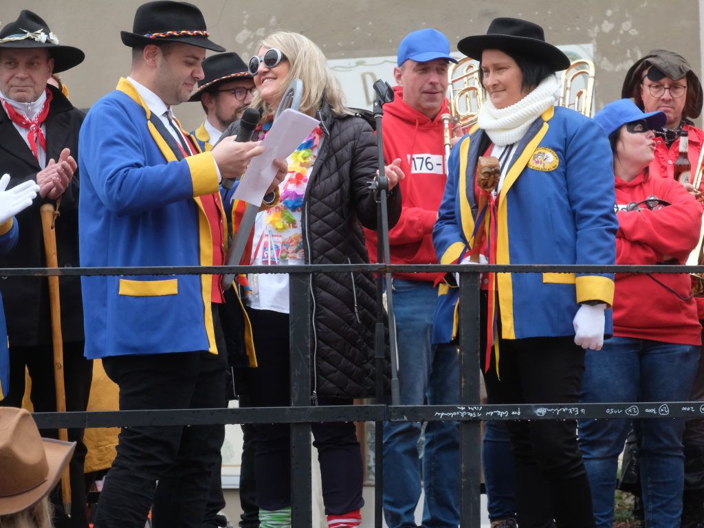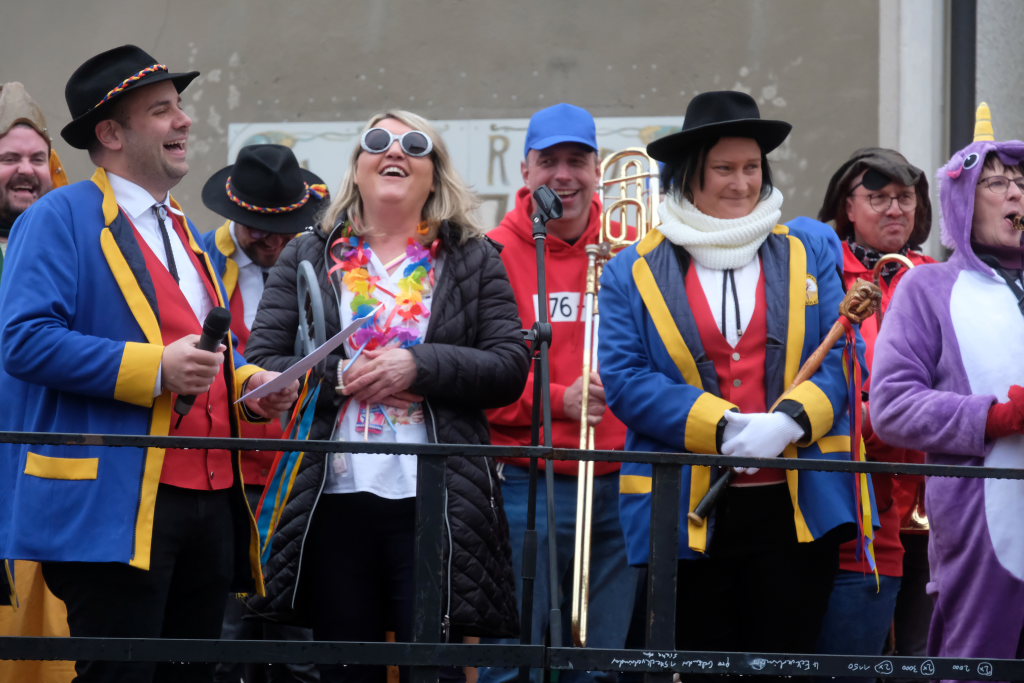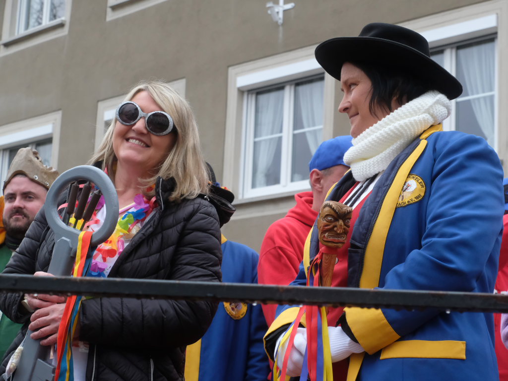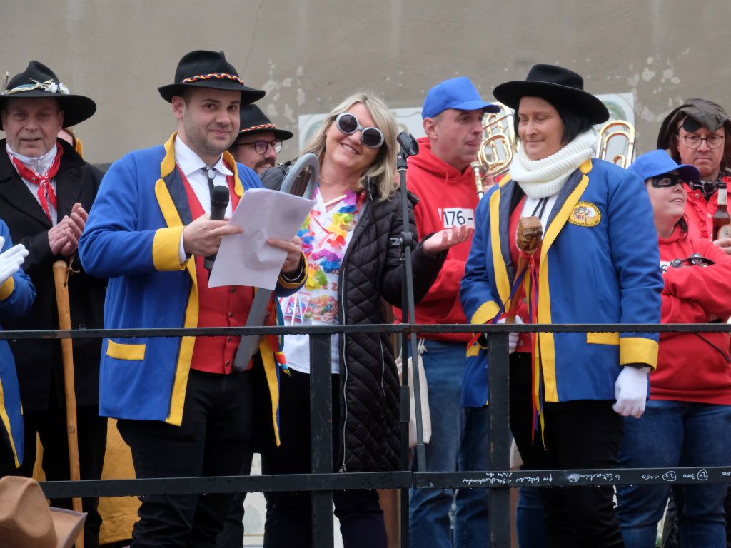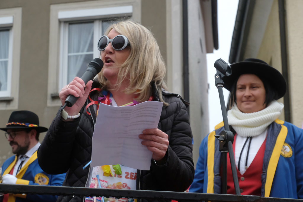 Die Bürgermeisterin warf den Narren vor, dass sie zu spät gekommen seien, eine Woche früher hätte man sie im Rathaus mit Handkuss empfangen. Gleichzeitig lobte sie die Zunftoberen, weil sie clever abgewartet hätten, wie die Wahlen ausgingen, „Ihr send scho gscheide Leit.“ Nach den Wahlen seien ja jetzt alle urlaubsreif, „dann lass´i eich halt regiera, was soll etz au no groß bassiera.“ Und weil man ja jetzt keinen Turm bauen wolle, sei man auf der Suche nach Alternativen: „Für dr´Kurpark hätt I a Idee, an Speakers Corner wär doch schee.“ Dann wolle niemand mehr eine Kundgebung starten und müsste nicht mehr lange auf die entsprechende Genehmigung warten.