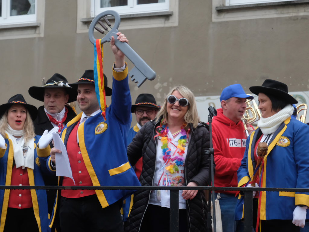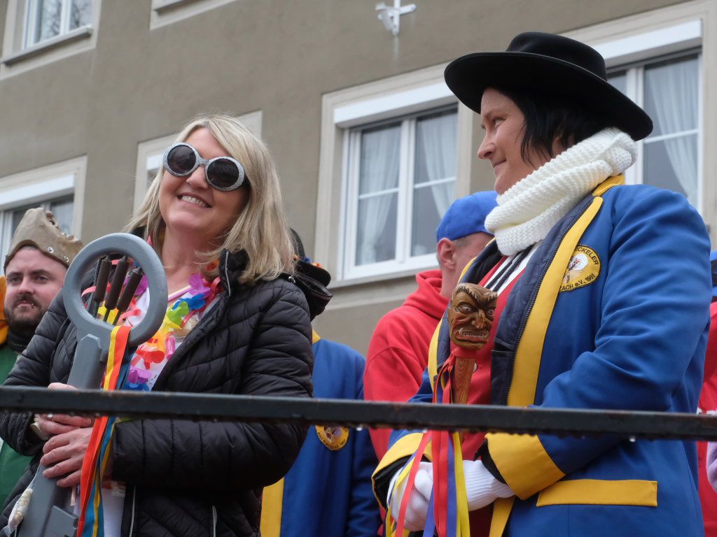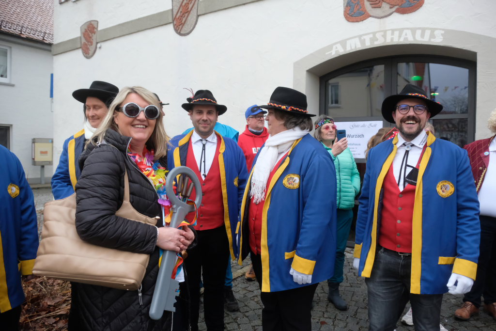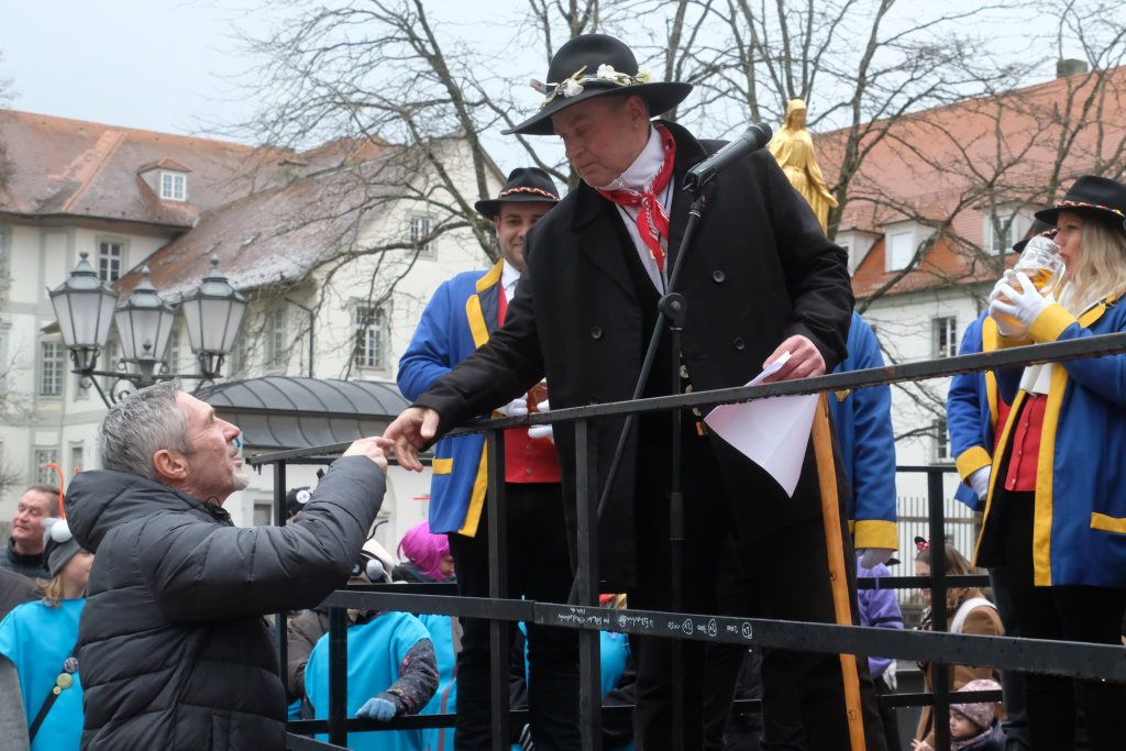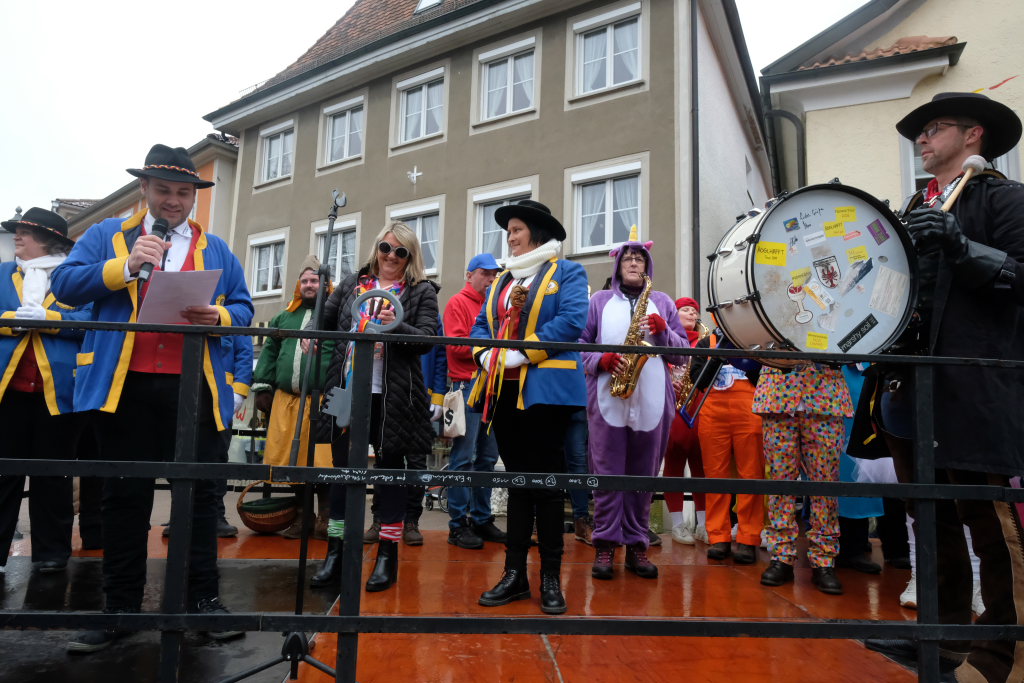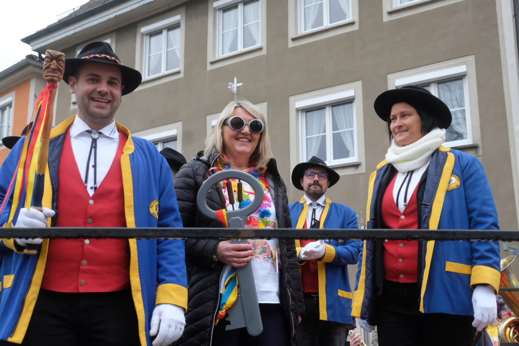 Bad Wurzach – Mit der Übergabe des Stadtschlüssels an Zunftmeister Dominic Neher kapitulierte Bürgermeisterin Alexandra Scherer am Gumpigen Donnschtig vor den Narren, die bis Aschermittwoch in der Stadt das Sagen haben.