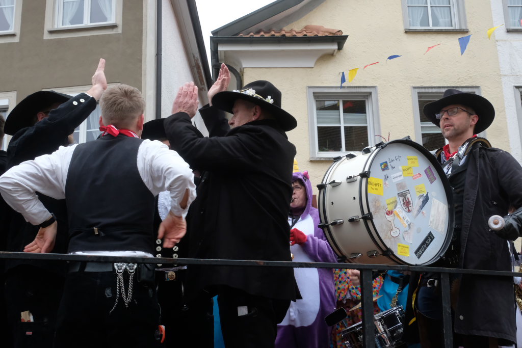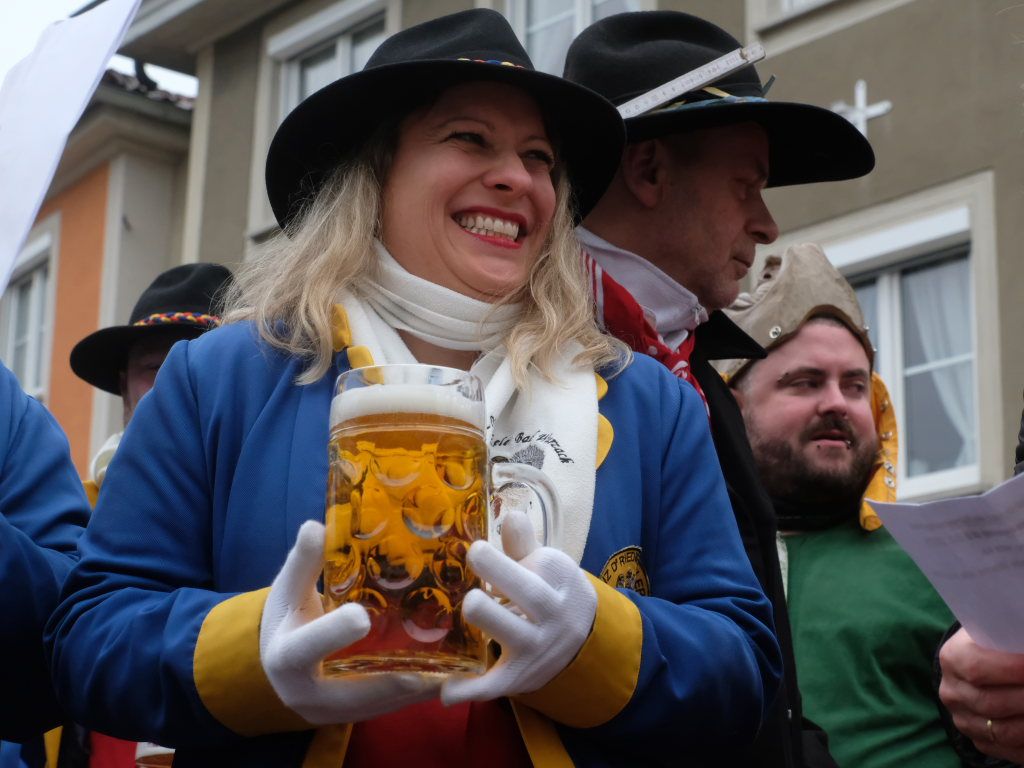 Nach dem Sturm auf die Zentrale der Wurzacher Macht im Amtshaus, bei dem sich die Narren erst einmal stärken mussten, wurde die Bürgermeisterin vom Elferrat unter den Klängen der Lumpenkapelle zum Podest beim Marienbrunnen „abgeführt“, wo sie dann die Insignien ihrer Macht an die Narren abtreten musste.
