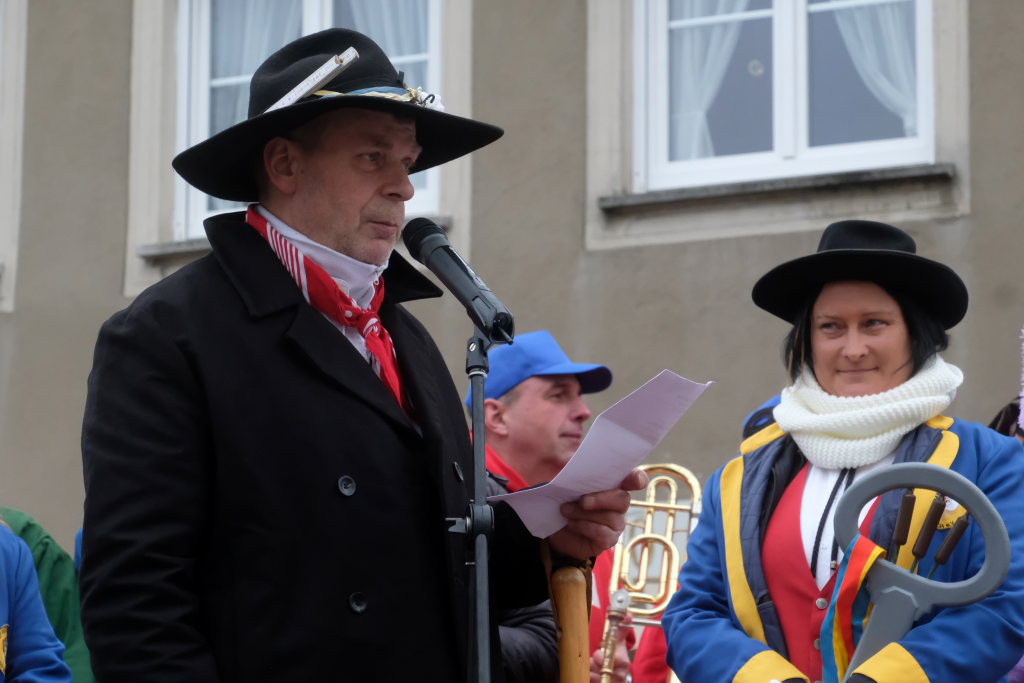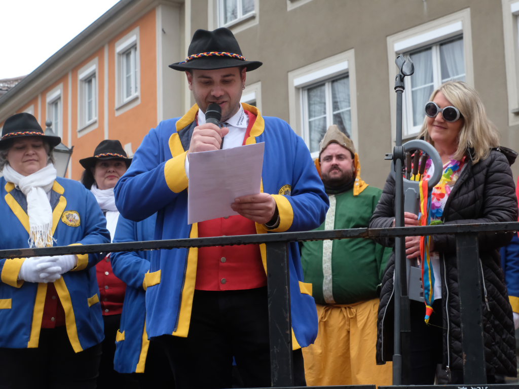 Zunftmeister Neher hatte, ehe er den Rathausschlüssel übernahm, noch einige kritische Anmerkungen zum Stadtgeschehen in der letzten Zeit zu machen. Er merkte an, dass der Gemeinderat es nicht nett findet, dass der jetzt Turm nicht kommt, er aber Frau Bürgermeisterin Scherer zustimme, das Abstimmungsergebnis so stehen zu lassen und man es sich auch in Zukunft gut gehen lassen solle. Aber er hatte den Vorschlag, die Bäume am geplanten Turmstandort trotzdem zu fällen, um daraus ein paar Brücken im Kurpark zu bauen, weil man dort momentan Flügel brauche, um keine nassen Füße zu bekommen.