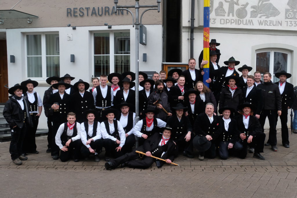 Nachdem der Rathausschlüssel die Seiten gewechselt hatte, war es an der Zeit, den Narrenbaum aufzurichten. Wie heißt es im Sprichwort so schön: „Zu viele Köche verderben den Brei!“ Mit der geballten Kraft von 40 (!) Zimmermännern und einer Zimmerfrau (?) aus der ganzen Großgemeinde ging man daran, ihn mit Scheren aufzurichten. Das war wohl etwas zuviel Power, denn der Narrenbaum hätte sich beinahe ans Rathaus angelehnt.