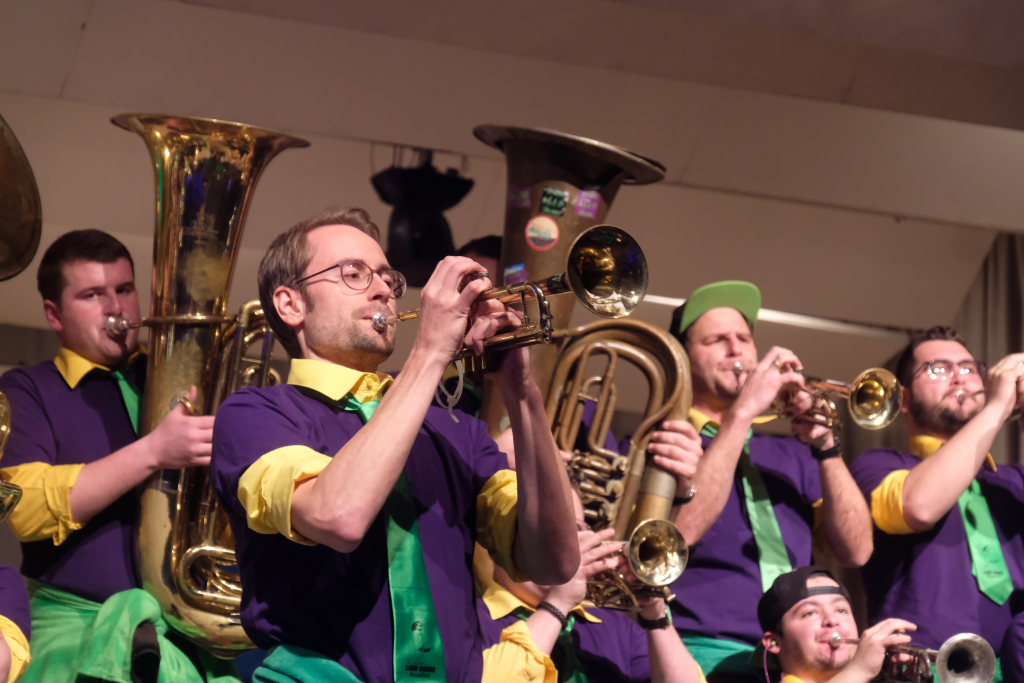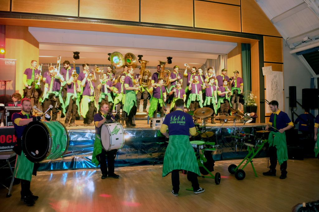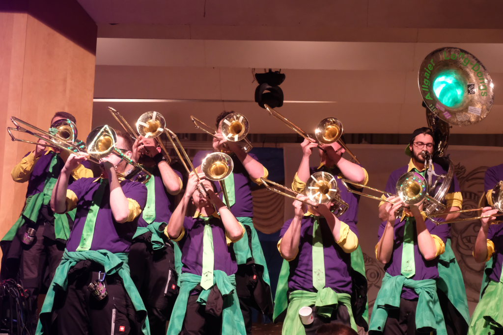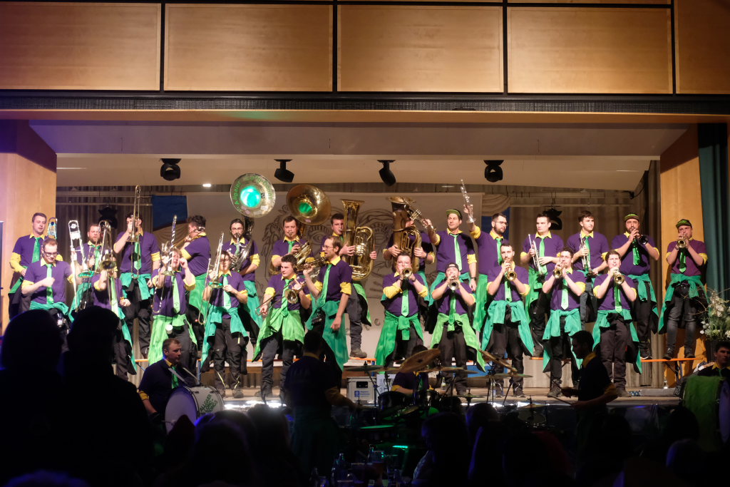 Dann wurde es richtig laut: Die Allgäuer Long Dongs enterten die Bühne bzw. die Tanzfläche. Neben Guggenmusik-Klassiker spielten sie auch zwei Lieder aus dem riesigen Repertoire der Beatles, perfekt geeignet zum Mitsingen. Angesichts des Schlagwerks in unmittelbarer Nähe der vorderen Tische wünschte man sich, dass der Kursaal gerne 15 Meter länger wäre.
