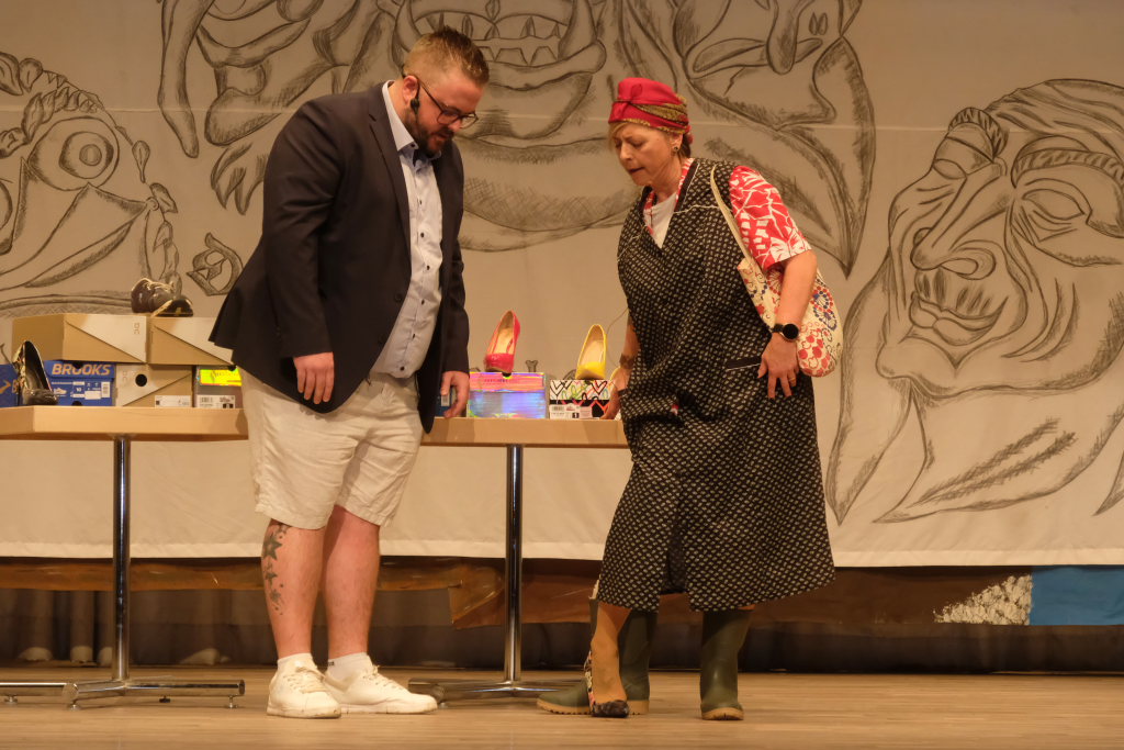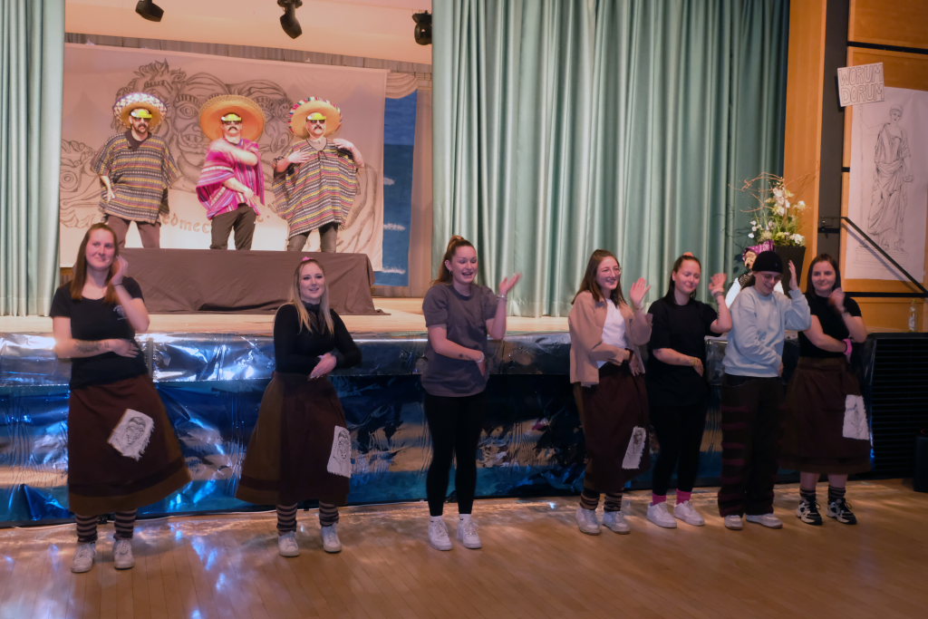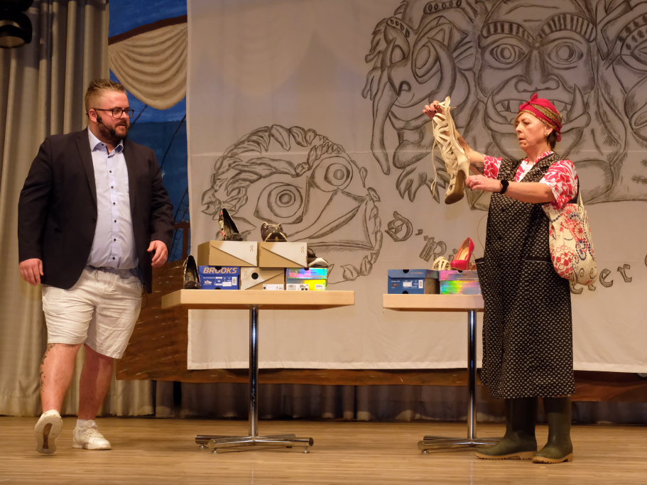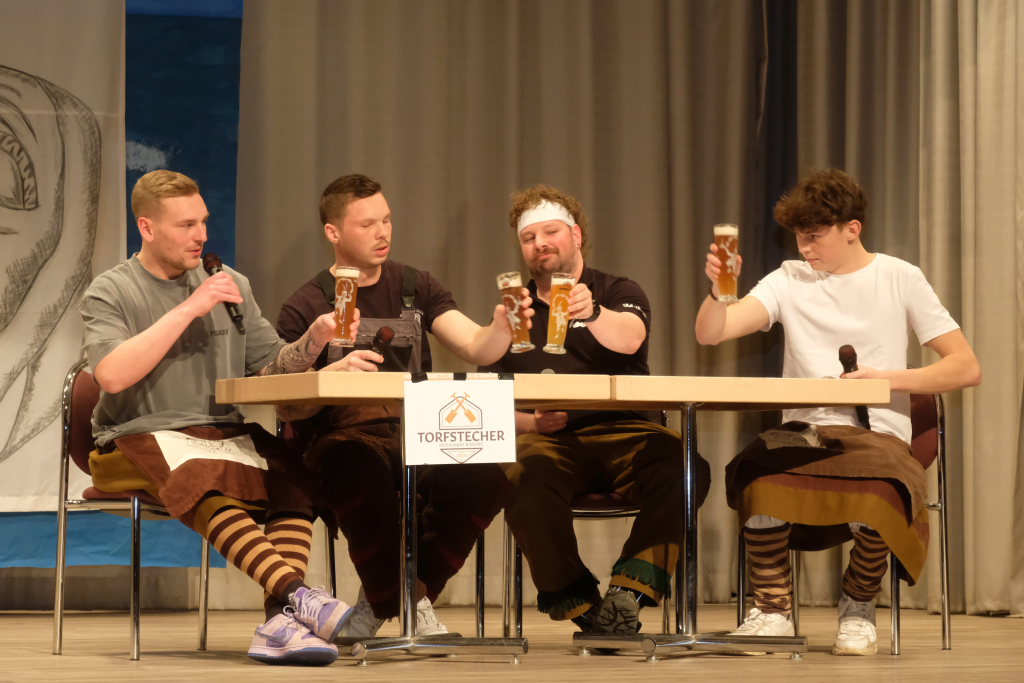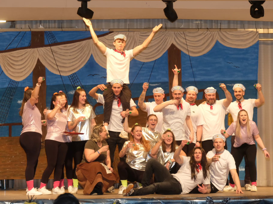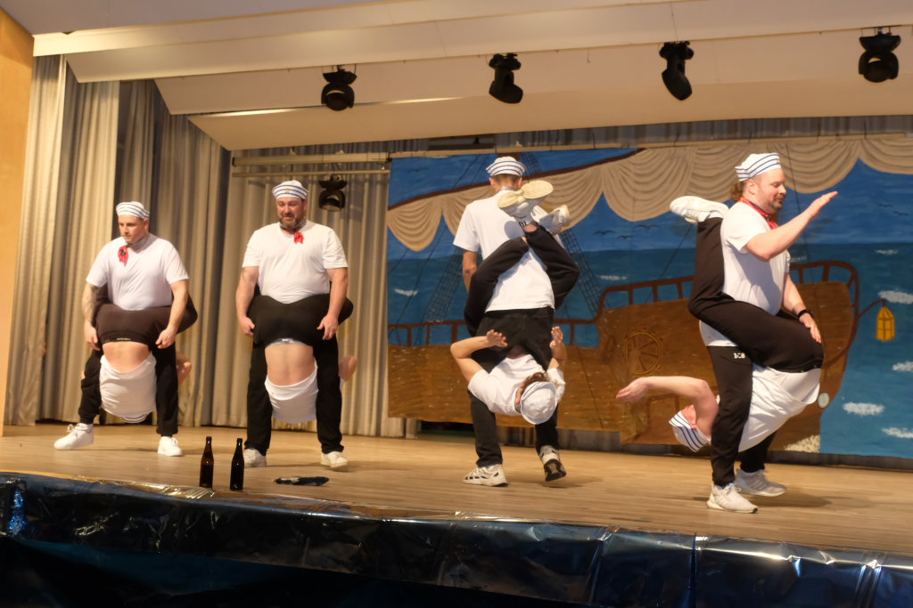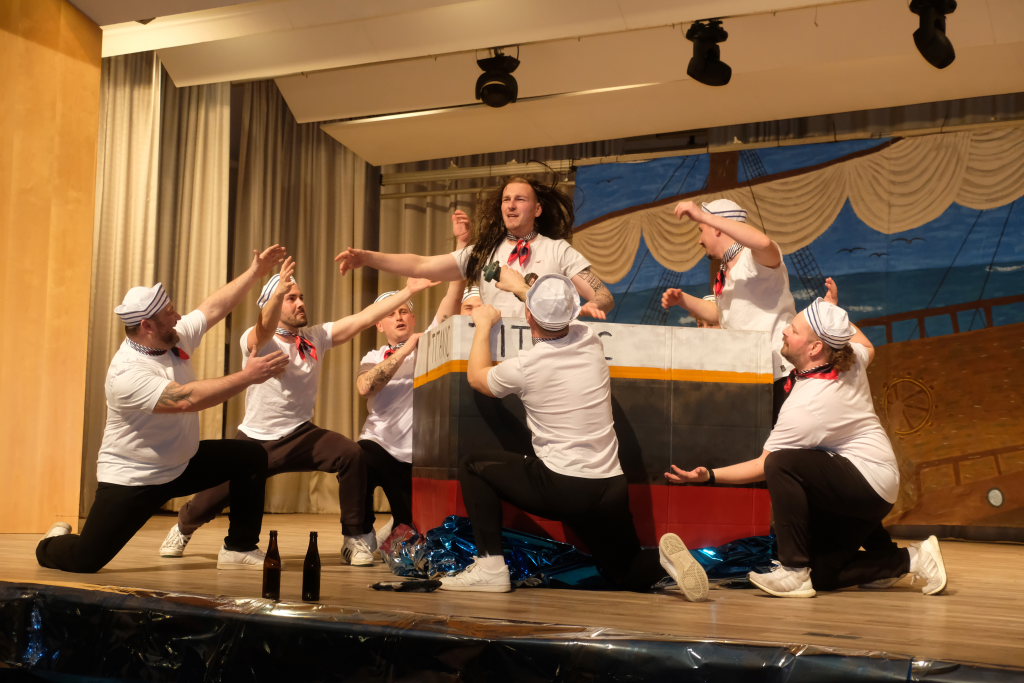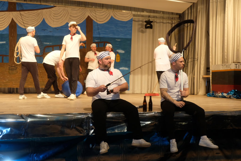 Zwei Damen tummelten sich als Gäste im Spa-Bereich des Vitaliums, während zugleich sich ihre „Ehemänner“ mit weiteren Gleichgesinnten am Stammtisch im Torfstecher austauschten. Beiden gemeinsam war, dass sie sich Gedanken über das Stadtgeschehen machten. Im Programm nicht fehlen durfte natürlich ein Männertanz, der die Herrschaften als Matrosen teilweise bis auf die Titanic mit einer männlichen Kate Winslet führte.