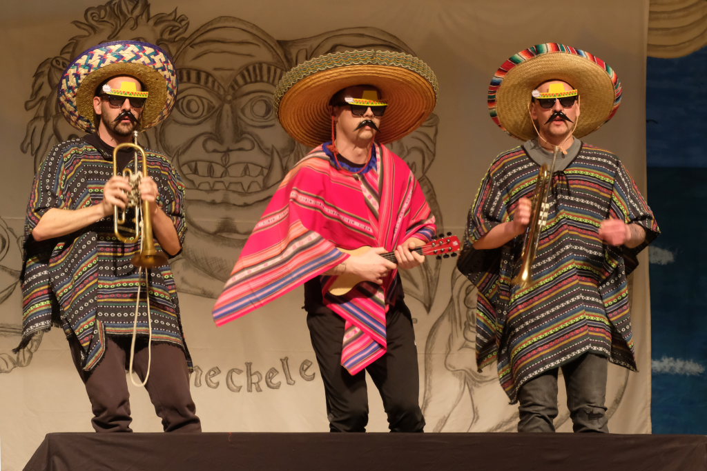 Was passiert, wenn eine Landwirtsgattin in einer Schuhboutique landet? Richtig, da werden High-Heels anprobiert, die den besonderen Belastungen einer in Gummistiefel angetretenen Bauersfrau nicht standzuhalten scheinen. Oder es wurde gefeilscht, wie beim durchlöcherten Designer-Stiefel, weil „do jo eh s´moischte rausgschnitta worra isch.“ Um einiges eleganter – um nicht zu sagen phantastisch elegant – bewegten sich die Mädels des Zunftballetts der Narrenzunft Brochenzell, die zum einen eine hervorragende Kondition hatten und loslegten wie ein Formel 1-Feld. Ein Wunder, dass sie auf dem vor kurzem erneuerten Parkett keine schwarzen Streifen hinterließen. Sehr flexibel bewegten sich wiederum die drei Mexikaner, die mit ihren Instrumenten eine mexikanische Lied-Klassiker wie La Cucaracha zum Besten gaben.