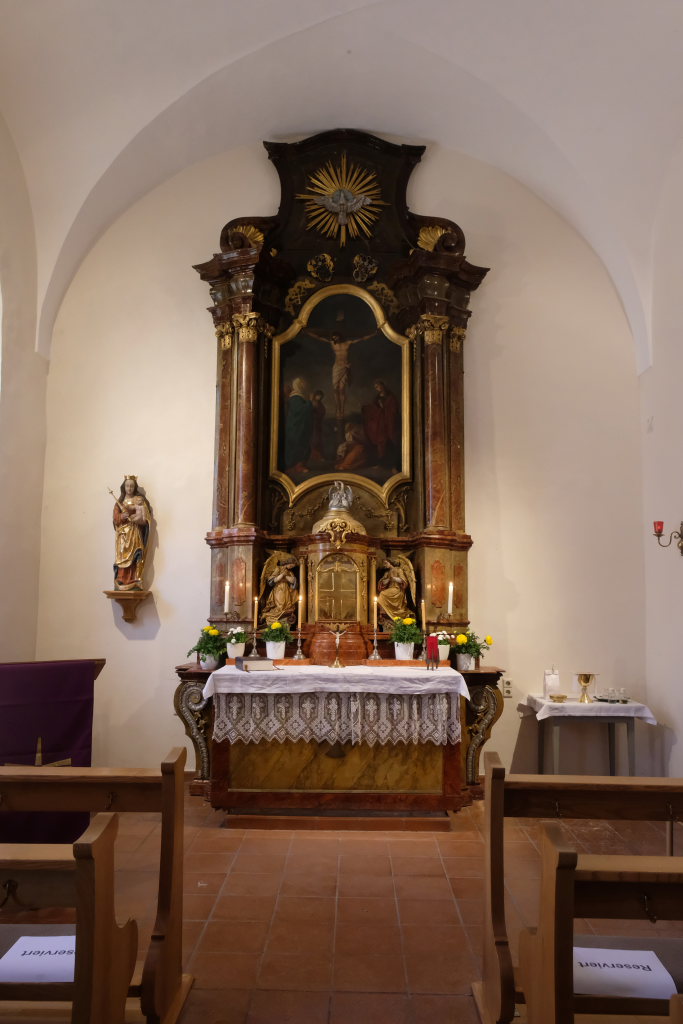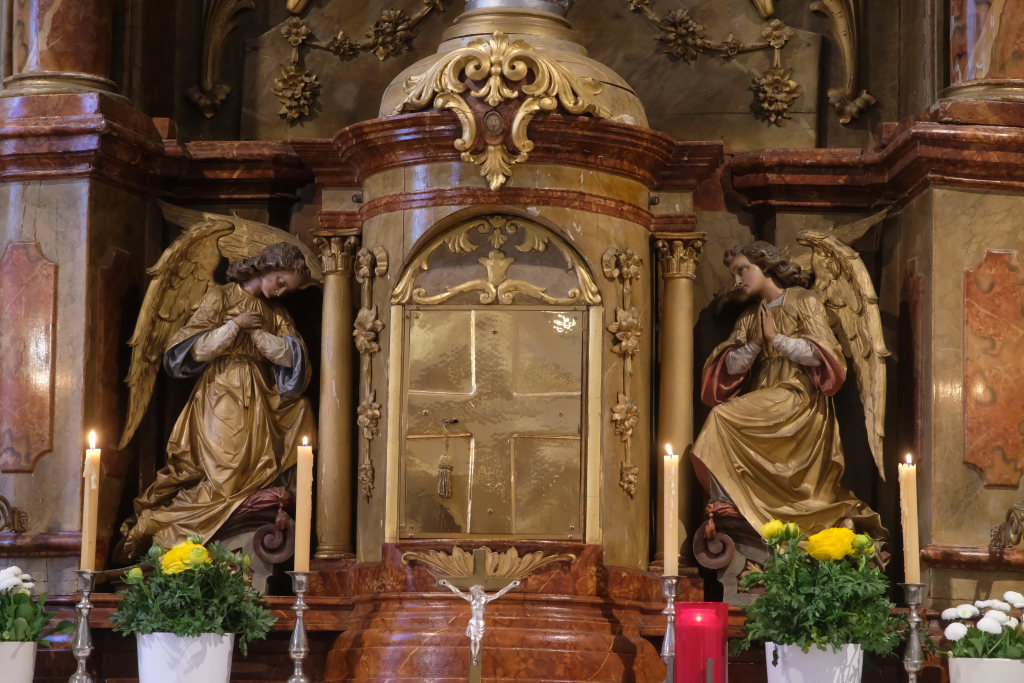 Letztmals eine Verehrung des Allerheiligsten in der Spitalkapelle. Seit dem 4. April 2025, 19.10 Uhr, ist der Tabernakel leer. Oben am Altaraufbau sieht man die Taube, Symbol des Heiligen Geistes. Das Heiliggeist-Patrozinium ist typisch für Spitalkapellen.