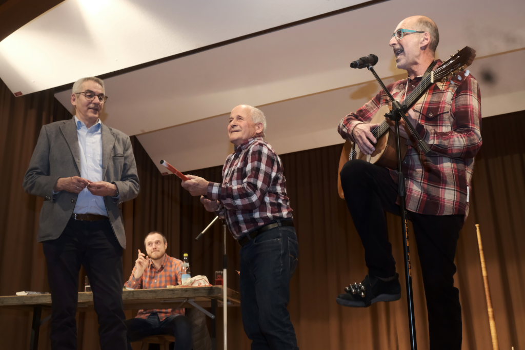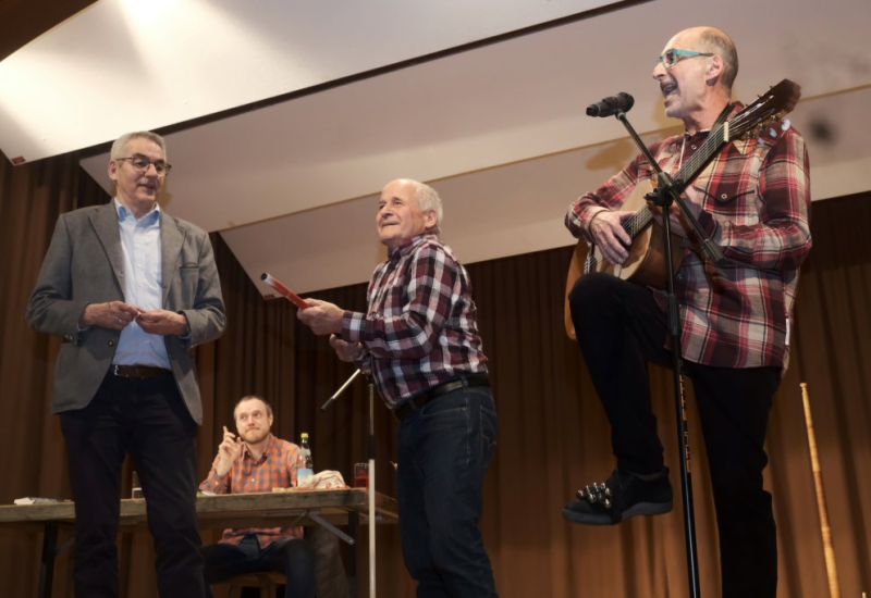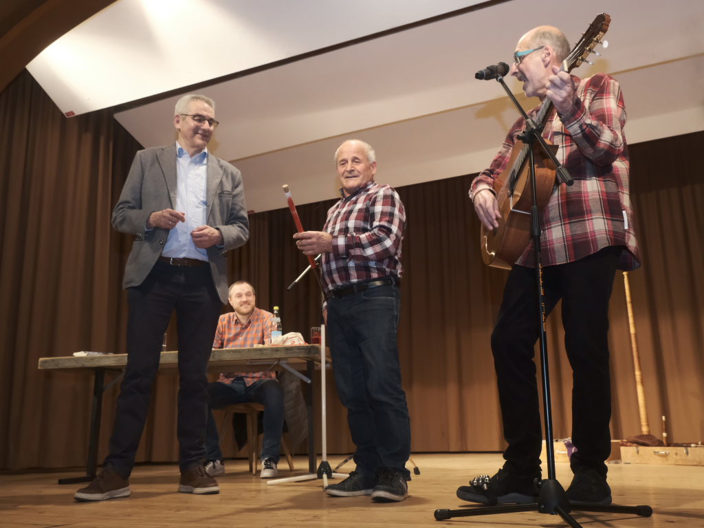 Es waren zwei genüssliche Stunden mit den Beiden, die auch ein wenig an der Uhr drehten, denn sie bestimmten, wann „es zehn Uhr ist“. Als Albrecht Siegel und der Vorstand des VLF Ravensburg-Bad Waldsee, Raphael Baumann, mit Geschenken die Bühne betraten, wusste jeder: Es ist Zeit für die Zugabe. Davor wurden jedoch die Familie Heine (Buch), ohne die in der Organisation nichts gegangen wäre, ebenfalls noch mit kleinen Geschenken bedacht.
