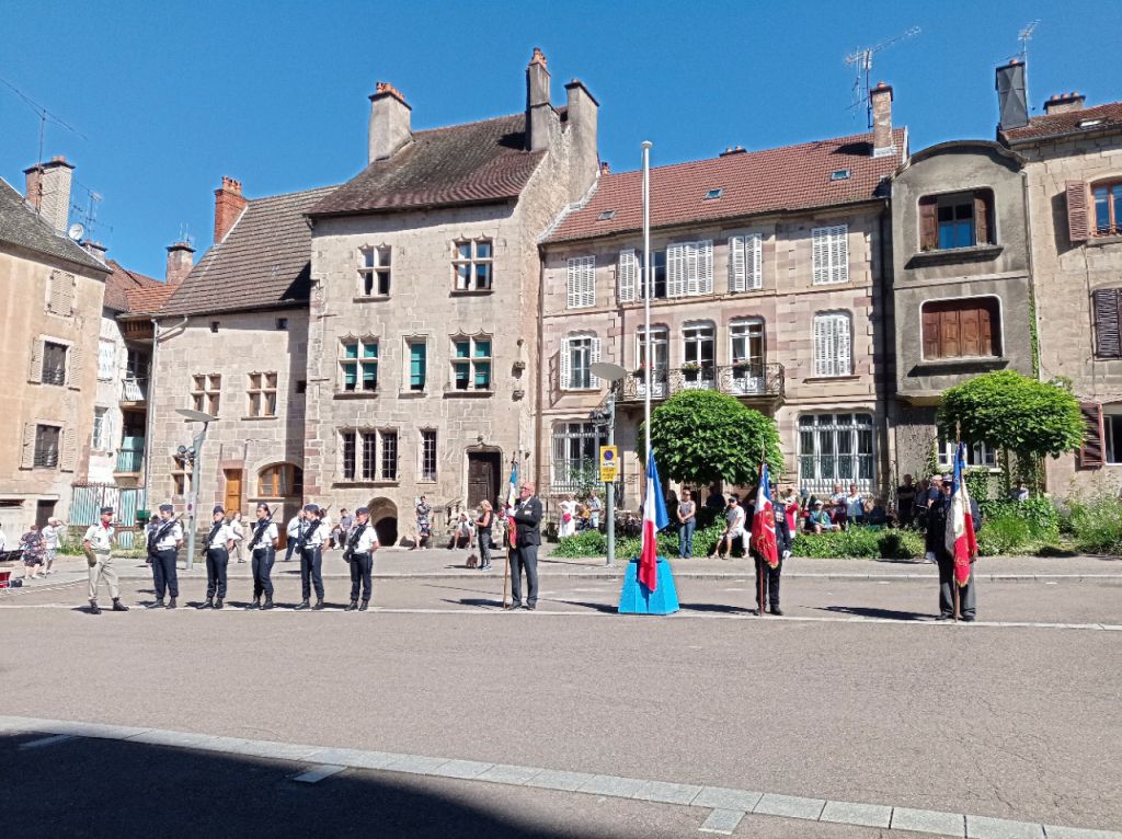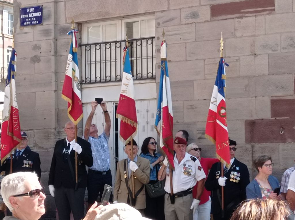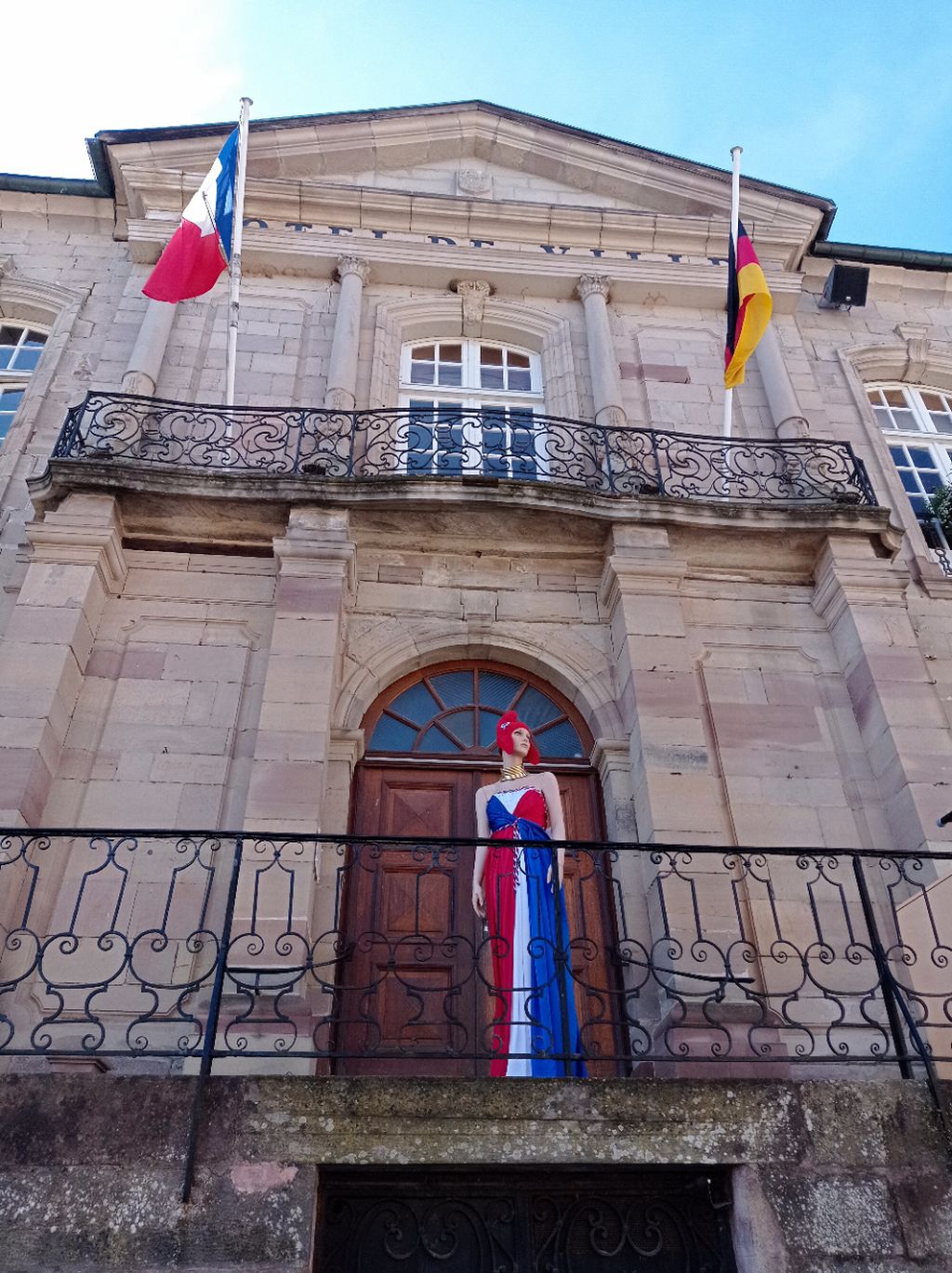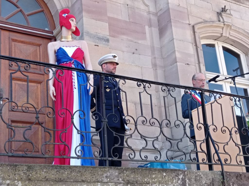 Richtig feierlich wurde es dann am Sonntagvormittag vor dem Rathaus von Luxeuil und unter den Augen von „Marianne“, die als blau-weiß-rot gekleidete Figur auf dem Balkon des Rathauses alles im Blick hatte. Eine Vorführung der Luxeuiler Feuerwehr eröffnete den Festakt. Es folgten verschiedene Ehrungen mit dem besonderen Zeremoniell der anwesenden Vertreter der französischen Armee. (In Luxeuil ist die Air-Base 116 stationiert, von der Flugzeuge zur gleichzeitig in Paris stattfindenden Feier unterwegs waren, um dort die Tricolore an den Himmel zu malen.) Die Stadtkapelle von Luxeuil spielte die Marseillaise, wir hörten die ersten Artikel der Bürger-und Menschenrechte, also der französischen Verfassung seit der Revolution, und eine Ansprache des Bürgermeisters, in der er die Wichtigkeit von Engagement und gesellschaftlichem Zusammenhalt in der heutigen Zeit betonte.