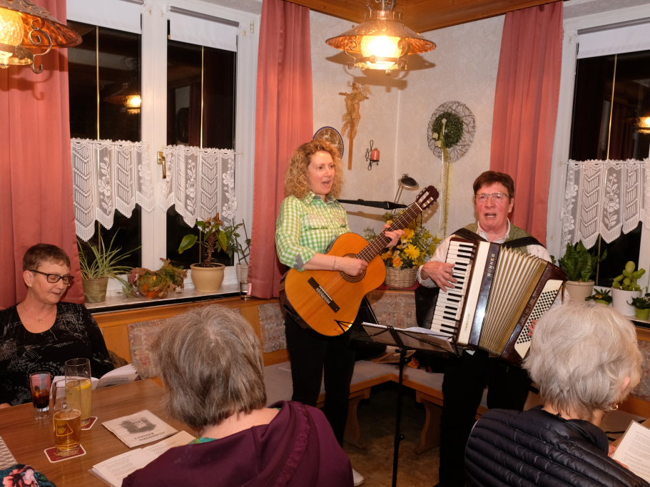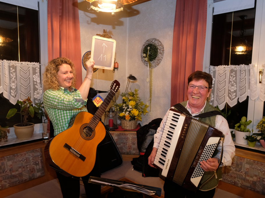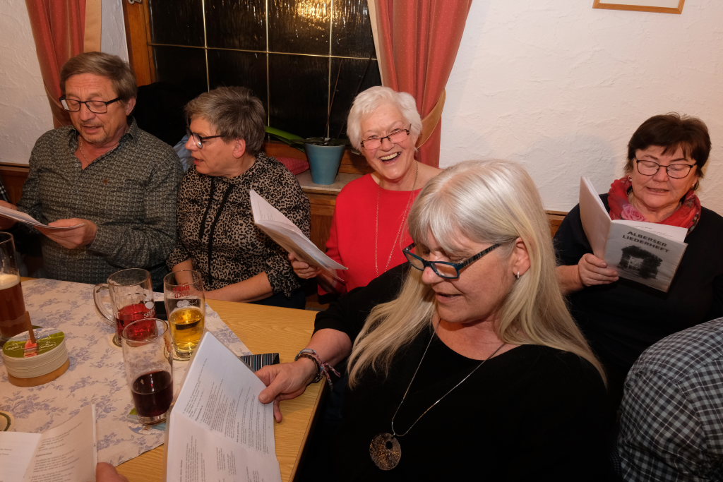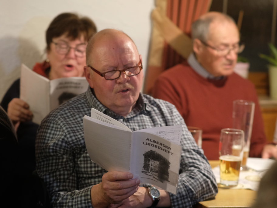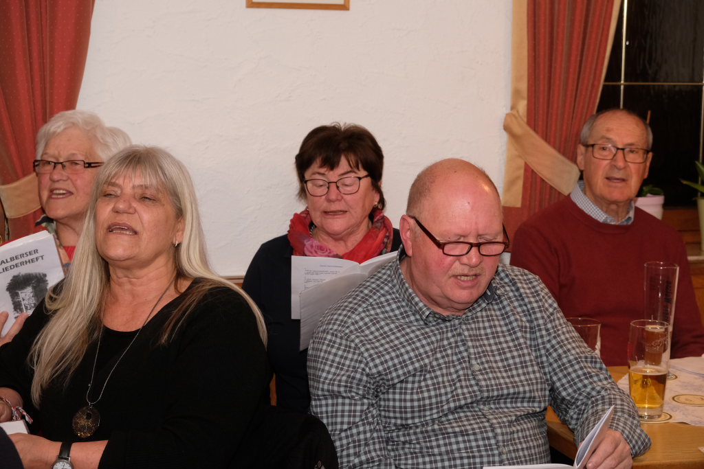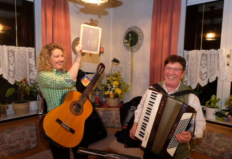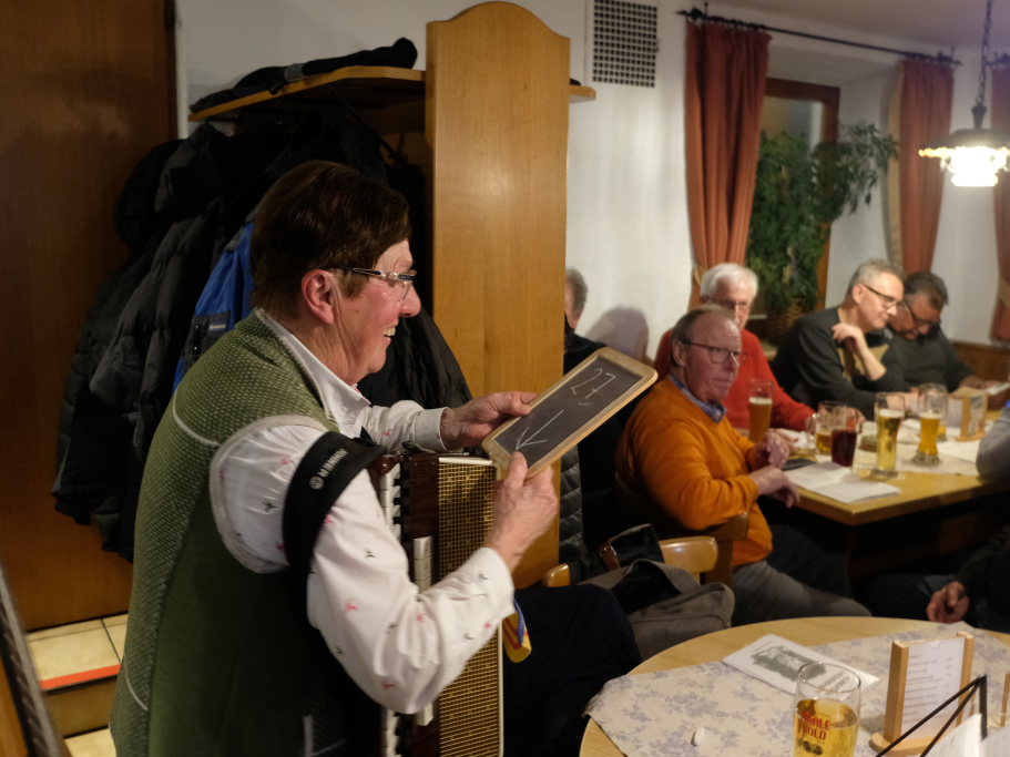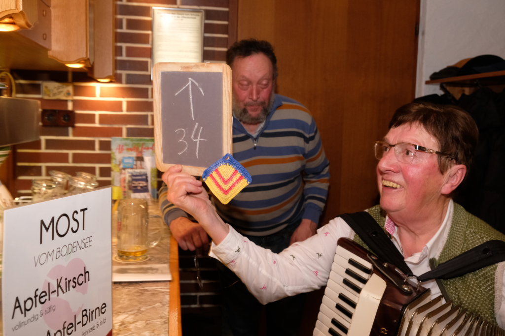 Der „Alberser Zweigesang“ mit Rosl Grösser und Brigitte Minsch startete vom „Waldhorn“ in Dietmanns aus. Die Beiden hatten wieder ihr „Alberser Liederheft“ unter die Leute gebracht, aus dem das Publikum auf Zuruf das Lied auswählen konnte, das als nächstes gemeinsam gesungen wurde. Und damit auch alle die richtige Seitenzahl aufschlugen, wurden die Liedseiten-Nummern von Rosl Grösser auf einer Schiefertafel mit Kreide angezeigt. Da wurde neben der eher fröhlichen „Fischerin vom Bodensee“ aber auch der eher melancholische „Bajazzo“ gesungen. Aber auch die unter ihrem „Künstlernamen“ Jodler-Rosl bekannte Rosl Grösser hatte einige Solonummern im Programm.