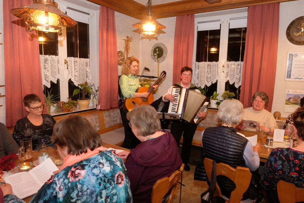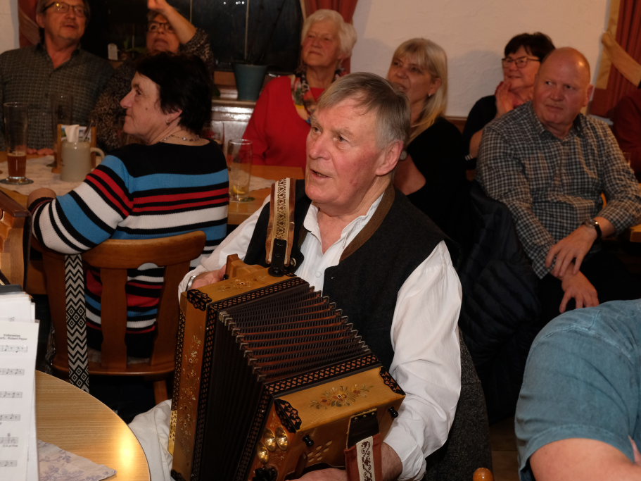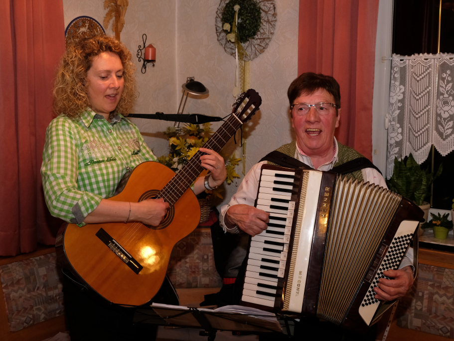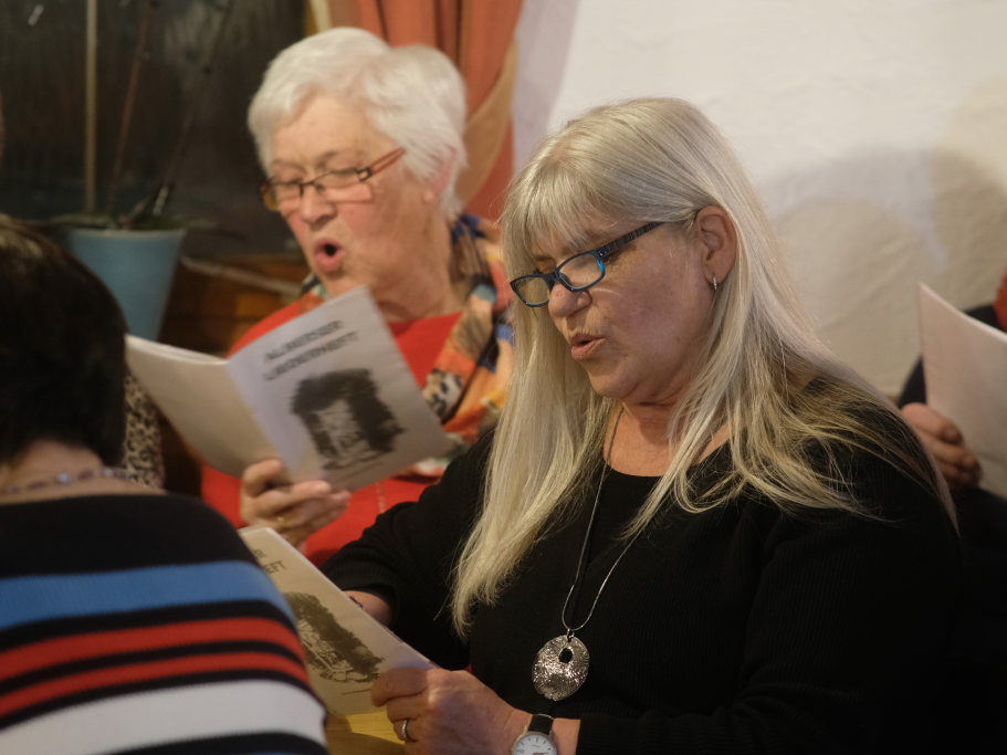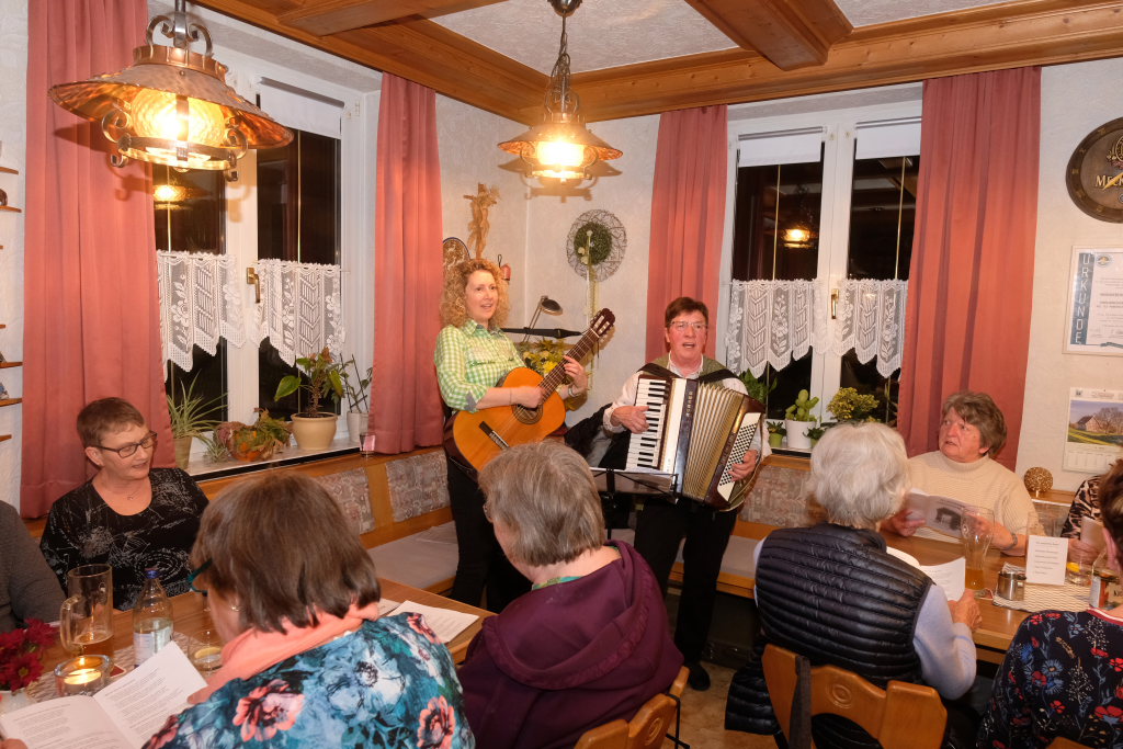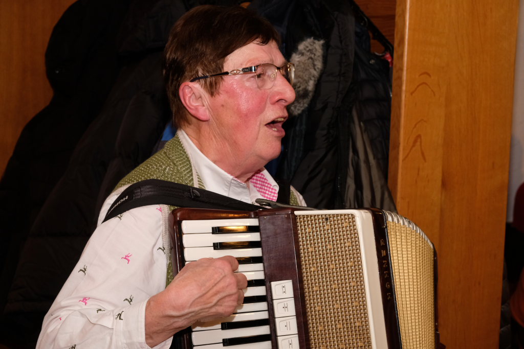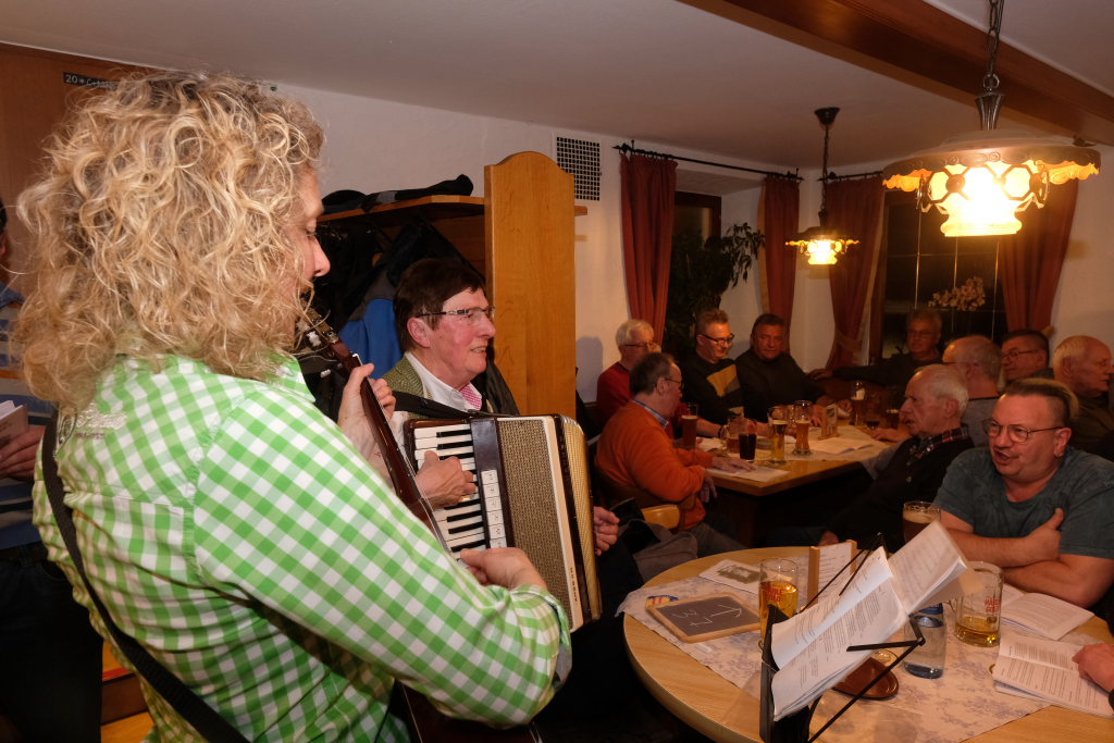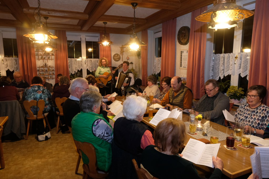 Der „Alberser Zweigesang“ mit Rosl Grösser und Brigitte Minsch startete vom „Waldhorn“ in Dietmanns aus. Die Beiden hatten wieder ihr „Alberser Liederheft“ unter die Leute gebracht, aus dem das Publikum auf Zuruf das Lied auswählen konnte, das als nächstes gemeinsam gesungen wurde. Und damit auch alle die richtige Seitenzahl aufschlugen, wurden die Liedseiten-Nummern von Rosl Grösser auf einer Schiefertafel mit Kreide angezeigt. Da wurde neben der eher fröhlichen „Fischerin vom Bodensee“ aber auch der eher melancholische „Bajazzo“ gesungen. Aber auch die unter ihrem „Künstlernamen“ Jodler-Rosl bekannte Rosl Grösser hatte einige Solonummern im Programm.