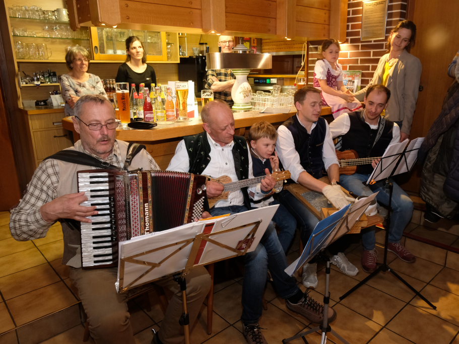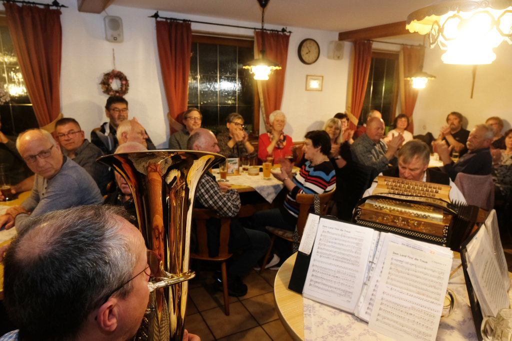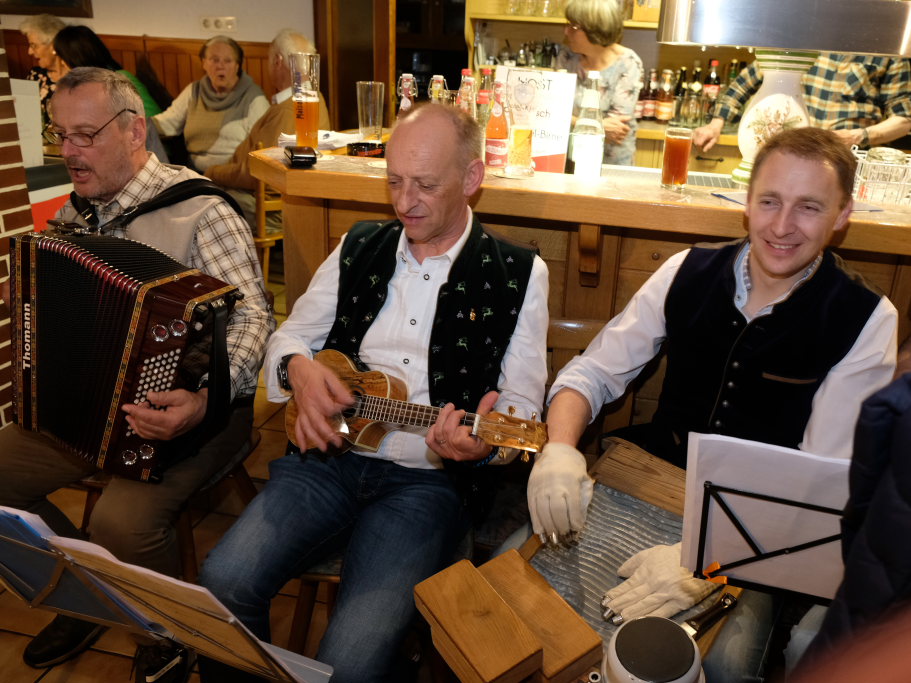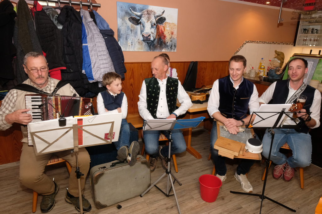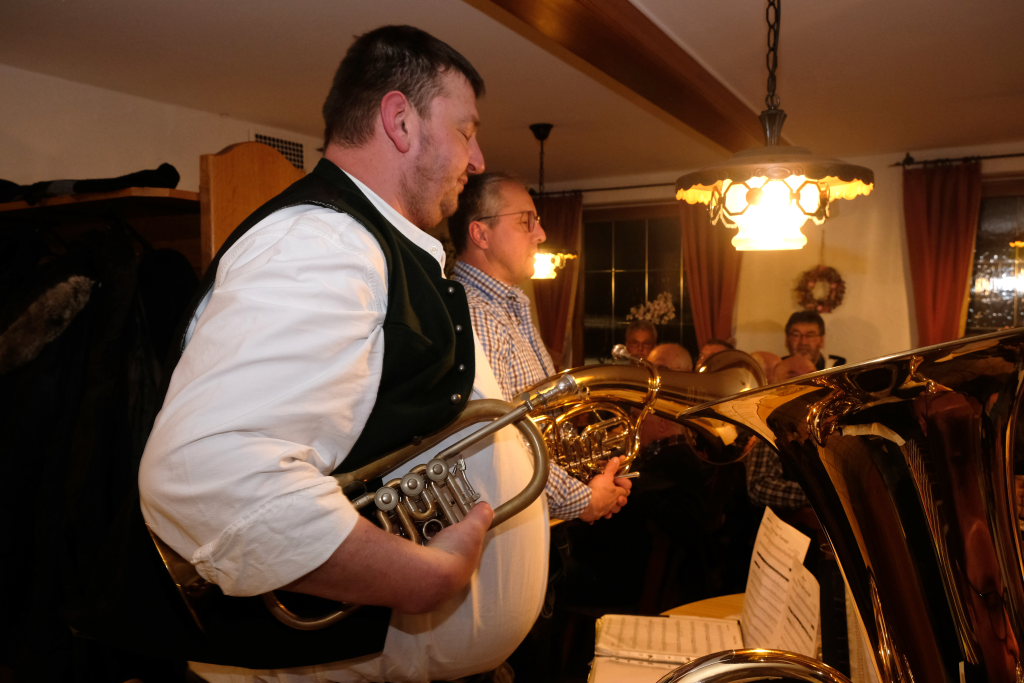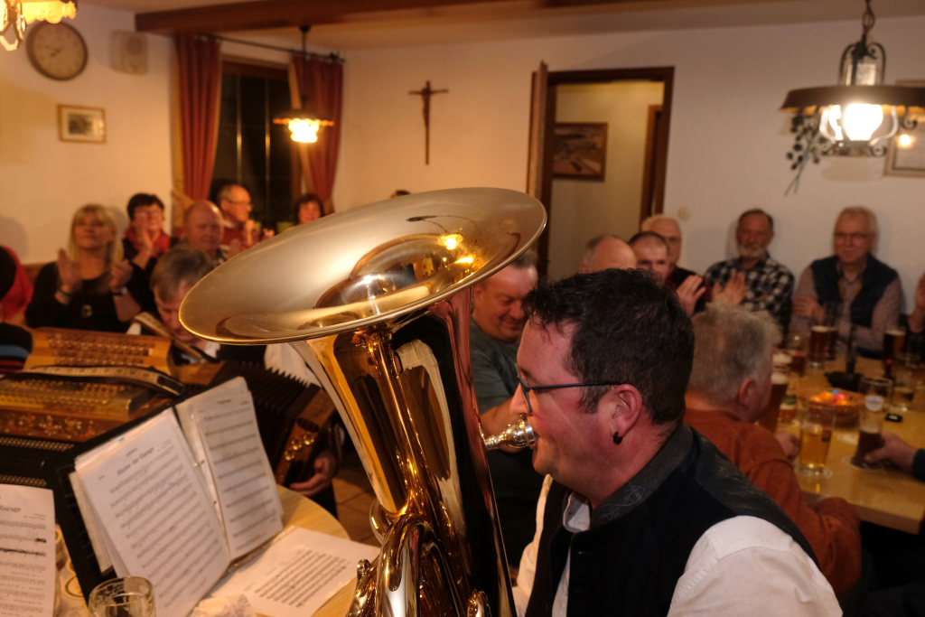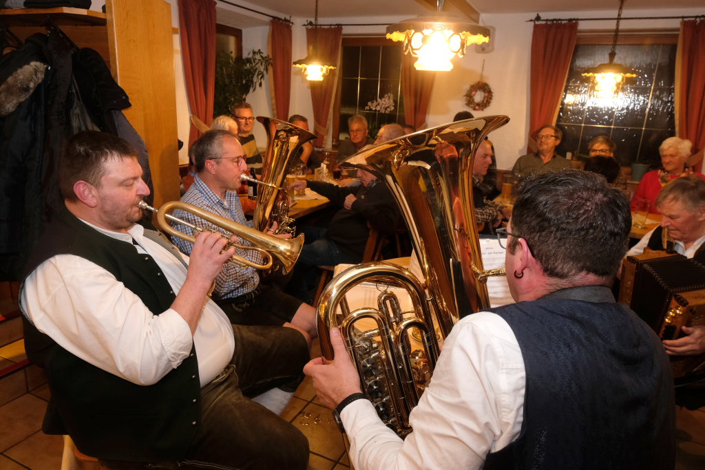 Die „Vierer-Musig“ mit Wolfgang Grösser (Tenorhorn), Frank Seitz (Bass-Tuba), Jochen Jöchle (Flügelhorn) und Gregor Holzmann (Steirische Harmonika) begannen ihre musikalische Rundreise im Gasthaus Hirsch. Das Quartett unterhielt die Wirtshausbesucher dort in der sehr gut gefüllten Gaststube rund eine Stunde lang mit Klassikern aus der populären Blasmusik wie etwa „Dem Land Tirol die Treue“ aber auch böhmisch-mährischen Polkas und bekannten Walzermelodien zum Mitschunkeln, ehe sie zur nächsten Station aufbrachen.
