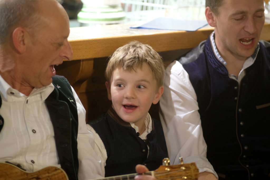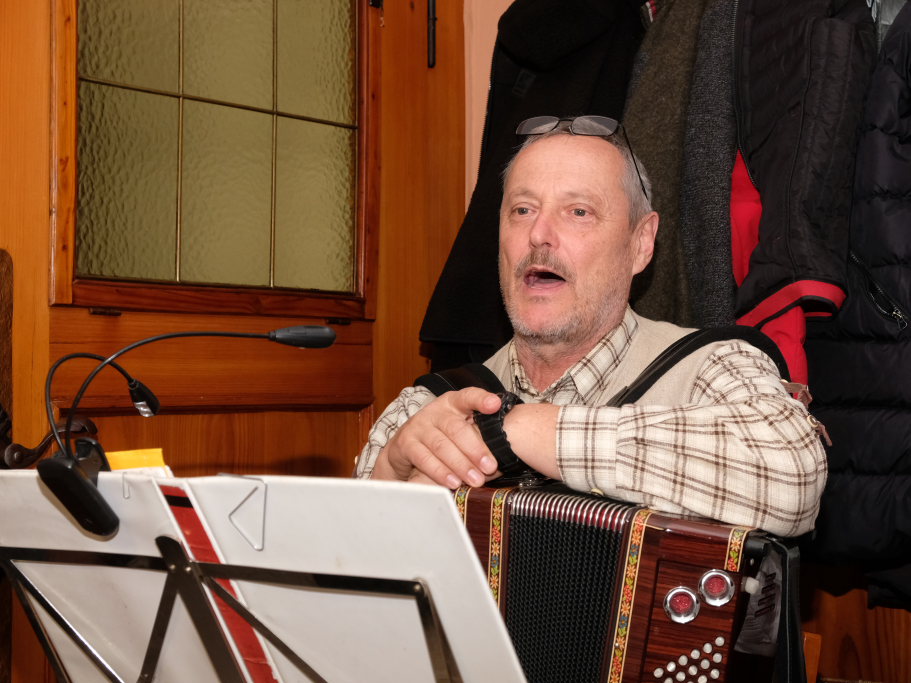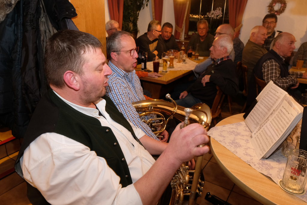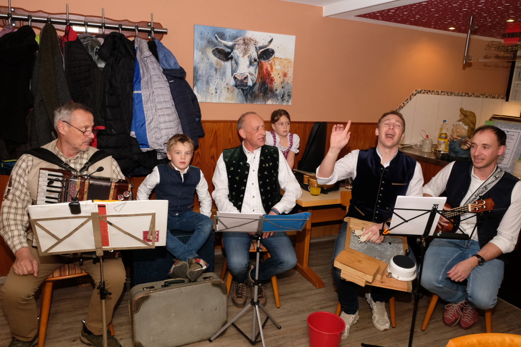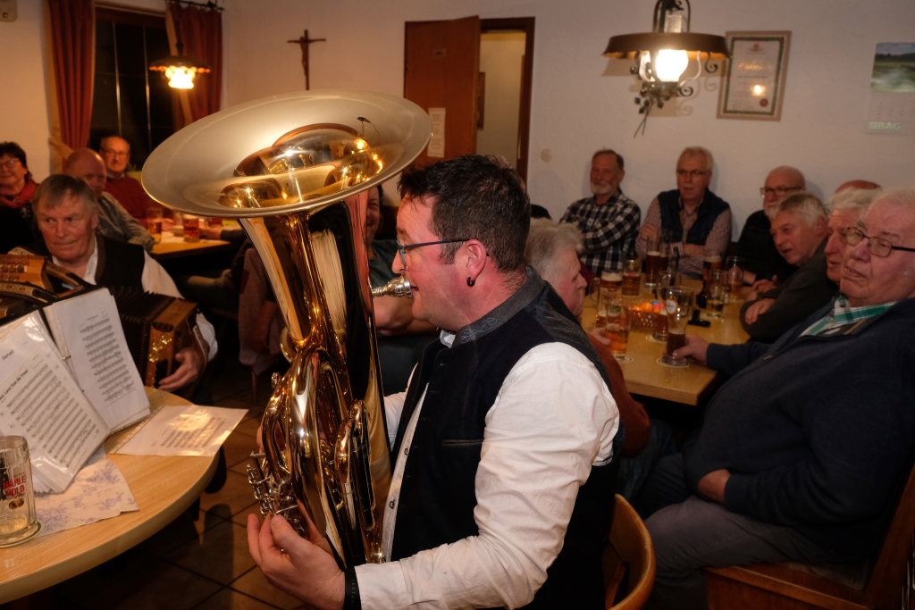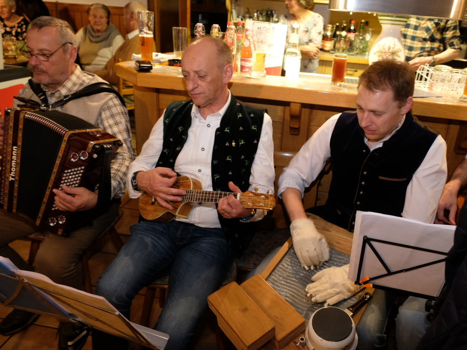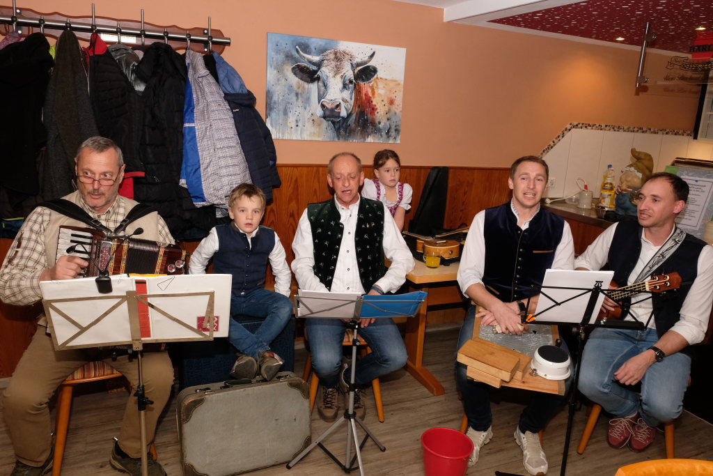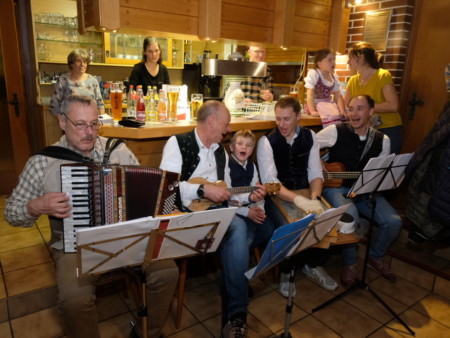 Die „Vierer-Musig“ mit Wolfgang Grösser (Tenorhorn), Frank Seitz (Bass-Tuba), Jochen Jöchle (Flügelhorn) und Gregor Holzmann (Steirische Harmonika) begannen ihre musikalische Rundreise im Gasthaus Hirsch. Das Quartett unterhielt die Wirtshausbesucher dort in der sehr gut gefüllten Gaststube rund eine Stunde lang mit Klassikern aus der populären Blasmusik wie etwa „Dem Land Tirol die Treue“ aber auch böhmisch-mährischen Polkas und bekannten Walzermelodien zum Mitschunkeln, ehe sie zur nächsten Station aufbrachen.