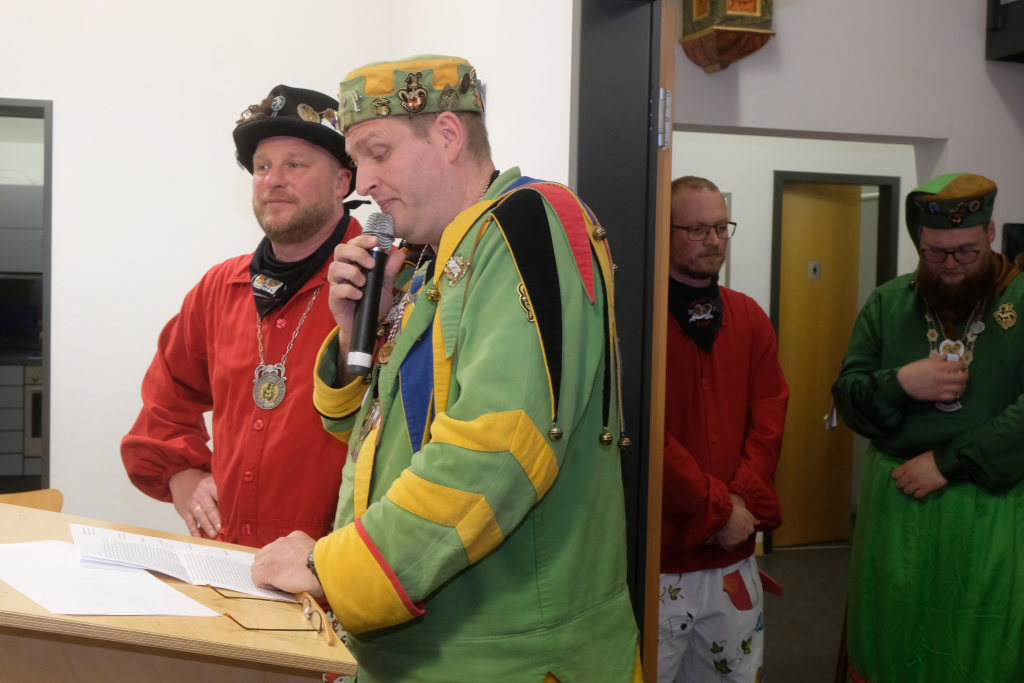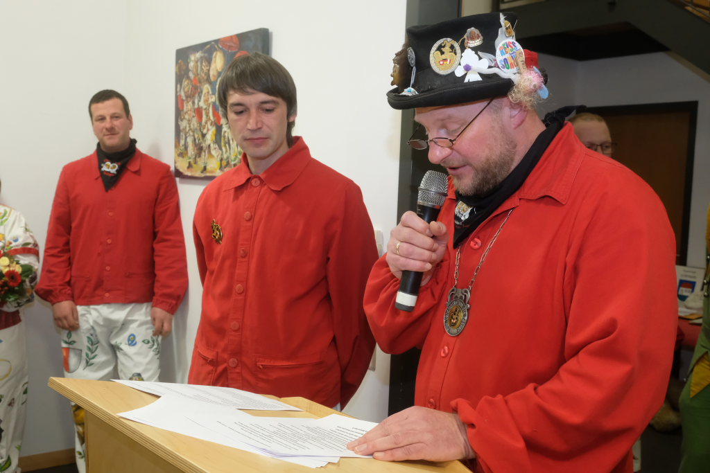 Die gleiche Ehrung wurde auch Simon Karkos zuteil. Simon sei ein Mann der Tat, der lieber schaffe statt schwätzen mag. Ebenfalls seit 1999 bei der Zunft dabei, sitzt er seit 2007 im Ausschuss. Die Hallendekoration ist alljährlich seine Aufgabe, dabei sei er jedoch noch nicht ausgelastet: Bei Veranstaltungen sei er für die Technik zuständig. Die komplette Stromversorgung bei Veranstaltungen kommt aus seiner Hand. Beim Ausschank im Partyzelt sei er der Chef. Vor dem, was er in den 26 Jahren seiner Mitgliedschaft für das Brauchtum Fasnet geleistet habe, davor hätten alle Narren größte Hochachtung.