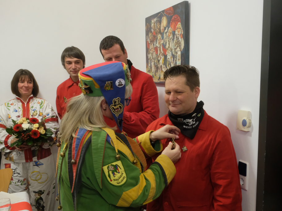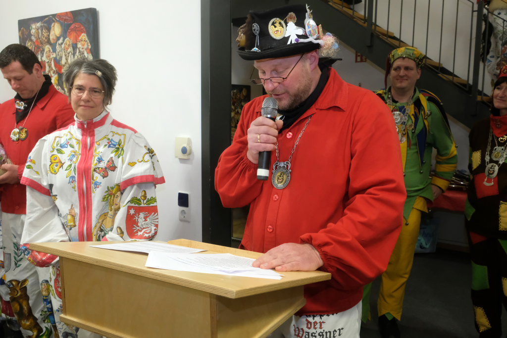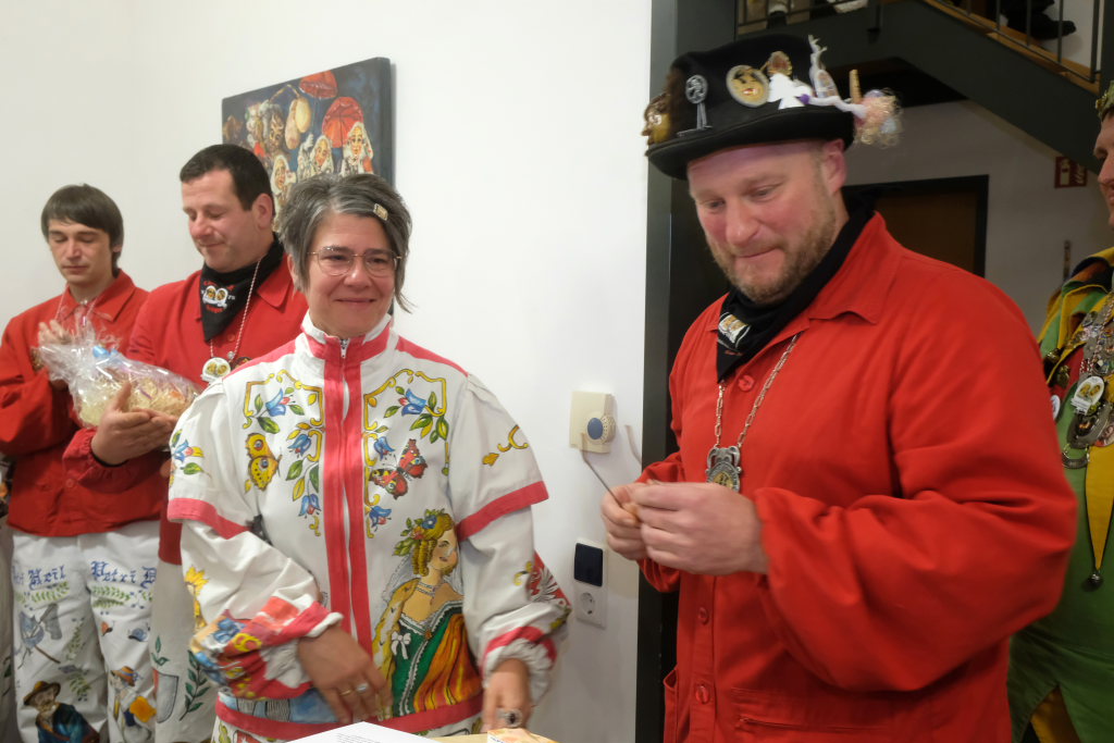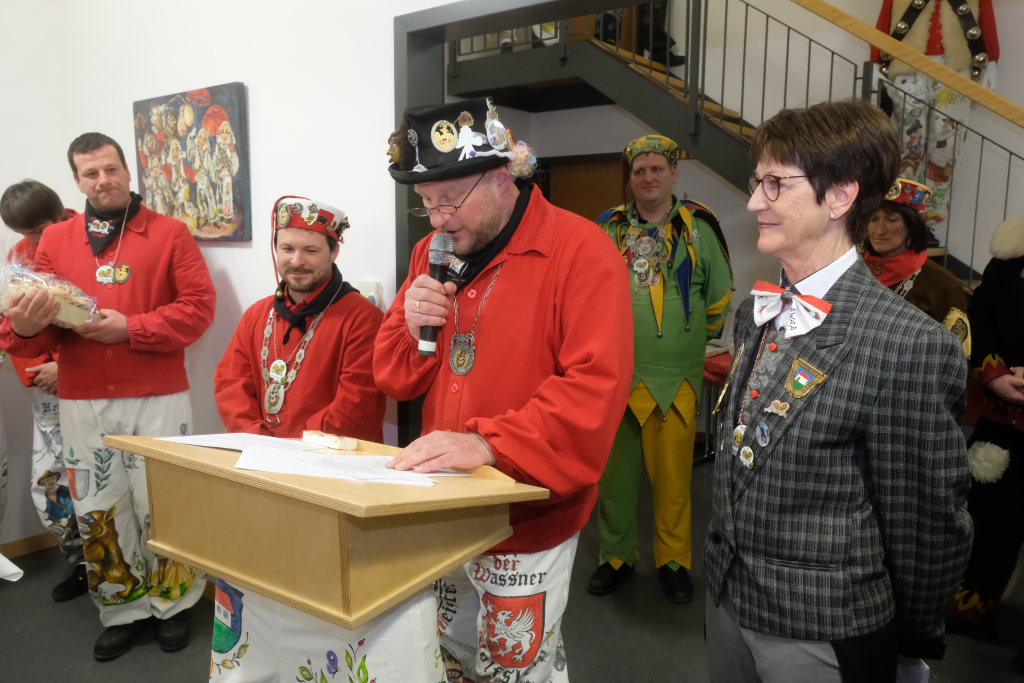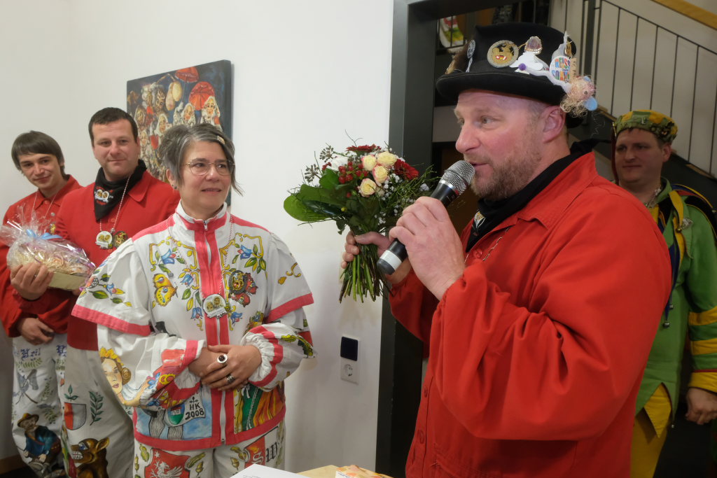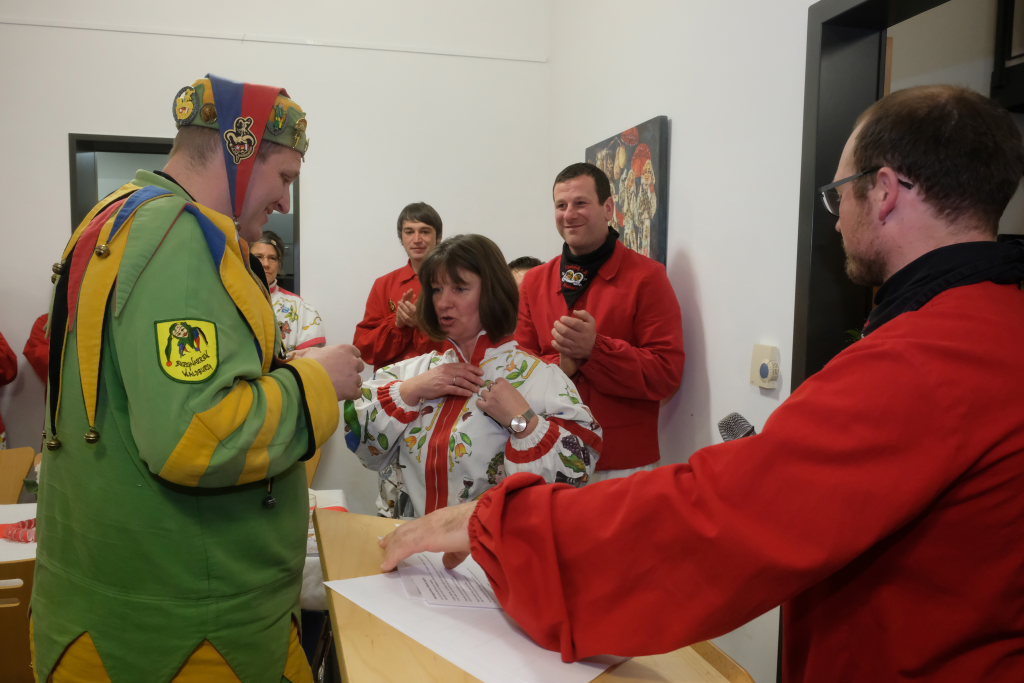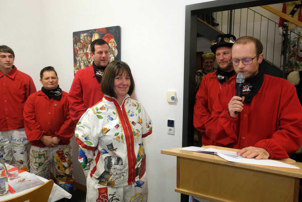 Des Zunftmeisters Gattin Sonja Wassner, wurde ebenfalls mit dem Ehrenhäsorden mit Silberkranz ausgezeichnet. Die Laudatio für sie hielt selbstverständlich ihr Ehemann. 1999 hatte sie die Liebe zur Narrenzunft entdeckt, seitdem ist sie eine Stütze im Verein, hält ihrem Ehemann und Zunftmeister den Rücken frei, ist seine Sekretärin und sein schlechtes Gewissen, „lässt er mal wieder sei Astand vermissa“. Sie sei die gute Seele des Vereins. Sie hat schon viel Zeit ins Zunftballprogramm und in die Männer- wie Frauentänze investiert. Auch sie hilft viel bei Veranataltungen bei der Bewirtung. Und als neuestes Talent habe sie die Häsmalerei für sich entdeckt. „Liebe Ehrengäste glaubet‘s mir des isch wohr, seitdem isch Fasnet bei uns dr Hoim s‘ganze Johr.“ Denn eines sei klar: wenn sie die Haidgauer Fasnet nicht ebenfalls so lieben würde wie er selbst, dann gebe es schon lange keinen Zunftmeister Wasi mehr.