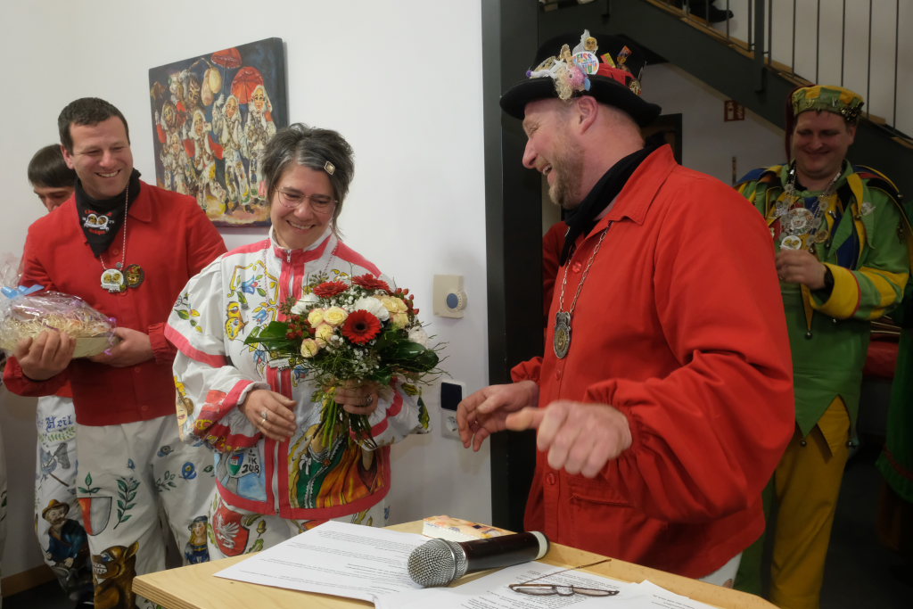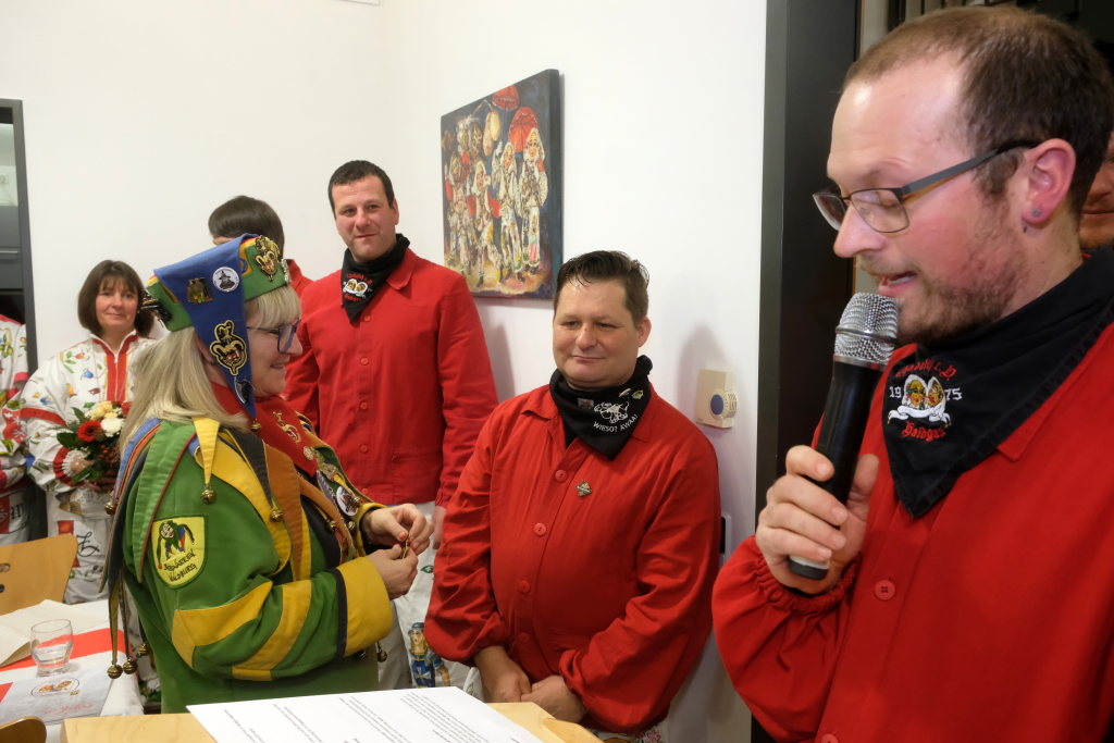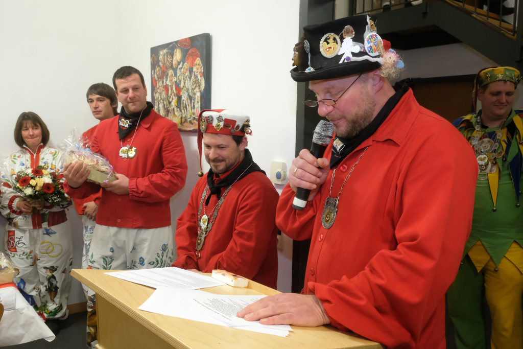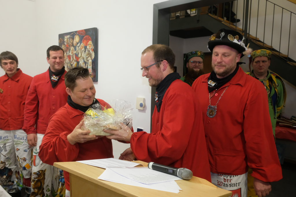 Ach ja dann war da noch eine Ehrung: Zunftmeister Daniel Wassner wurde für traumhafte 30 Jahre Vorstandschaft von der Narrenzunft geehrt. In der Laudatio auf den Zunftmeister machte die Zunft eine verbale Verbeugung vor dessen Leistung für den Verein. Seit 1995 bekleidete er zunächst das Amt des Beisitzers, dann 2002 als Vize unter Zunftmeisterin Doris, mit der Zusatzaufgabe Zeltwart des eigenen Zeltes. 2005 beerbte er dann Doris als Zunftmeister. Einer seiner Standardsätze bei Sitzungen: „Heit hommer it viel, s´goht ganz fix“ – aber das würde ja der Grundphilosophie „a Sitzung wo rum isch vor de 12e isch trotzdem nix“ widersprechen. „Du bisch koin Ma der großen Orden, aber a klois Dankeschön gehört sich doch.“
